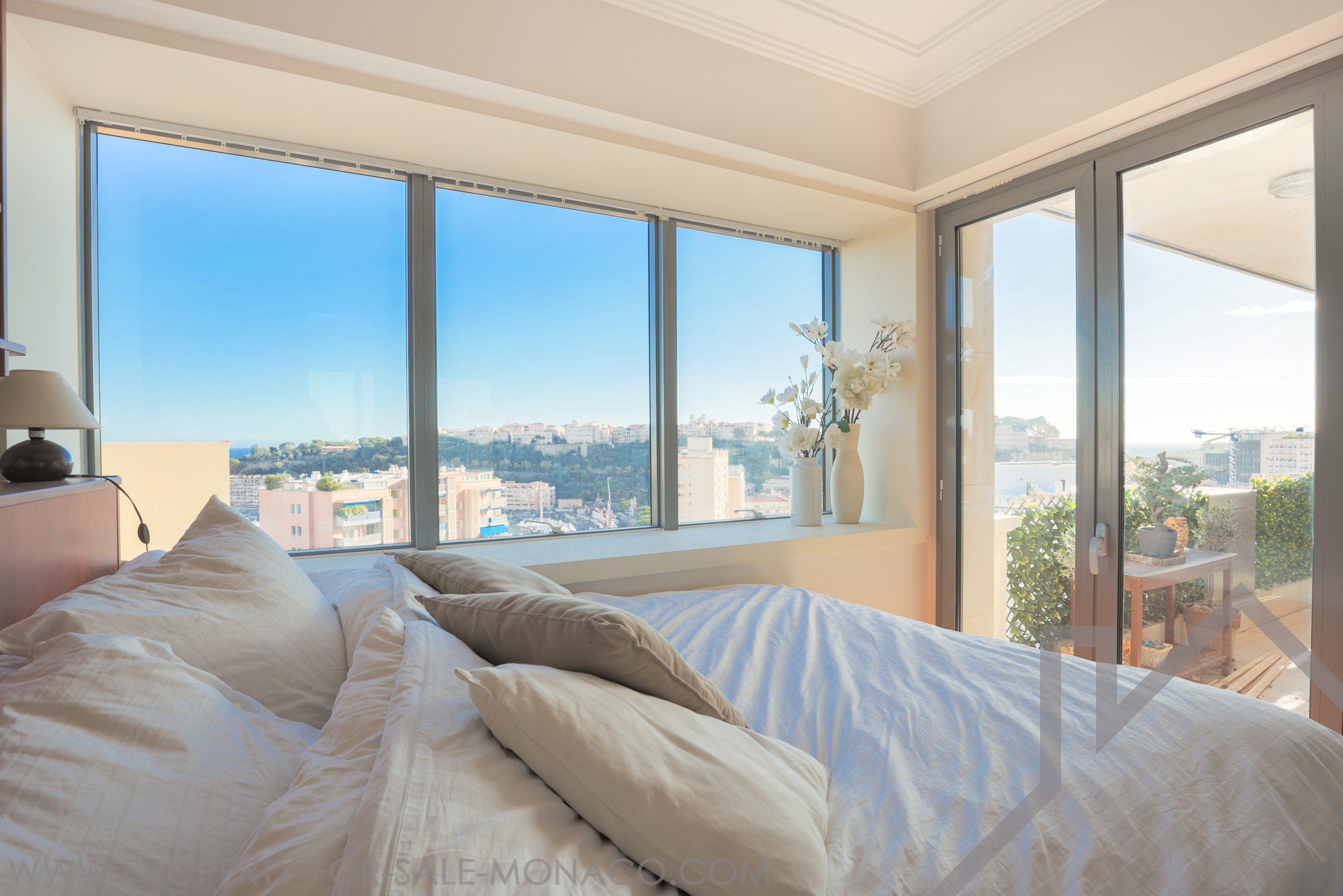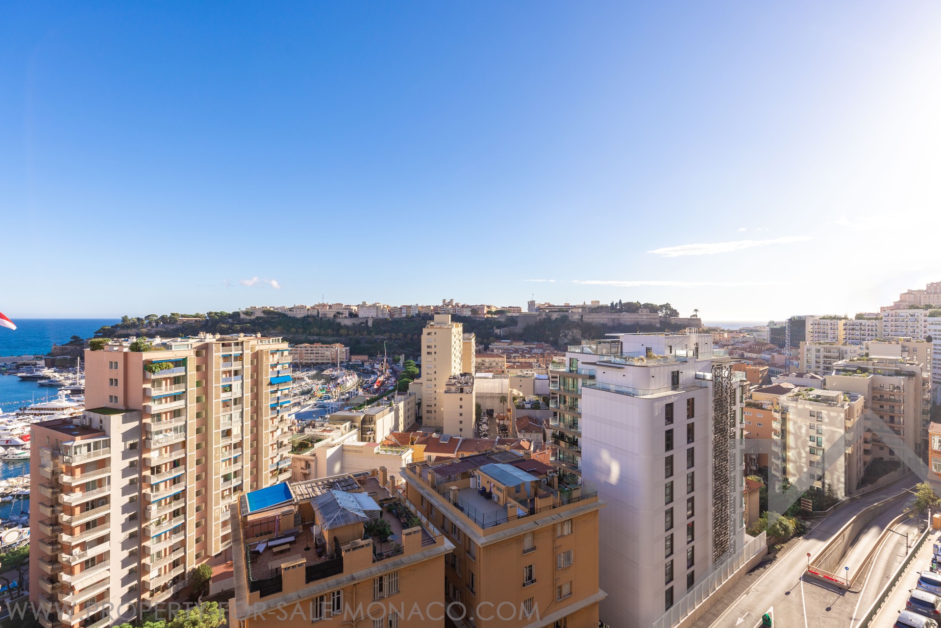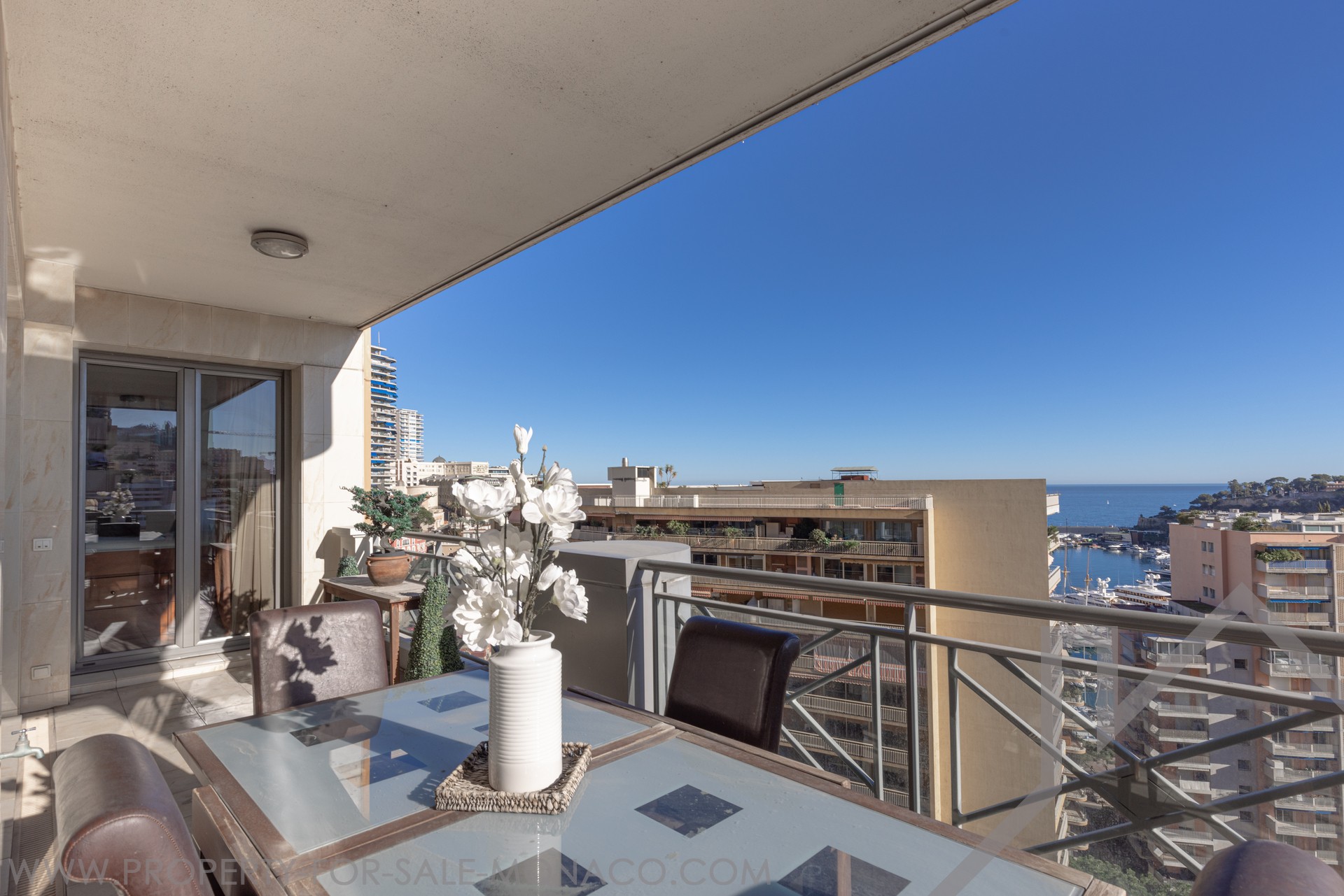 The apartment overlooks the port of Monaco and offers a nice view of the sea and the Prince's Palace.