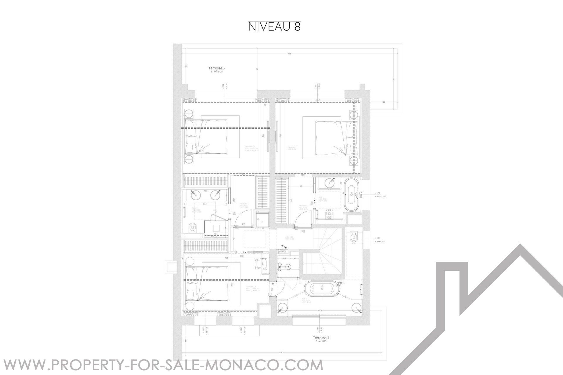 8th floor: 2 bedrooms, each with an en-suite bathroom and a 3rd bedroom with an adjoining shower room.