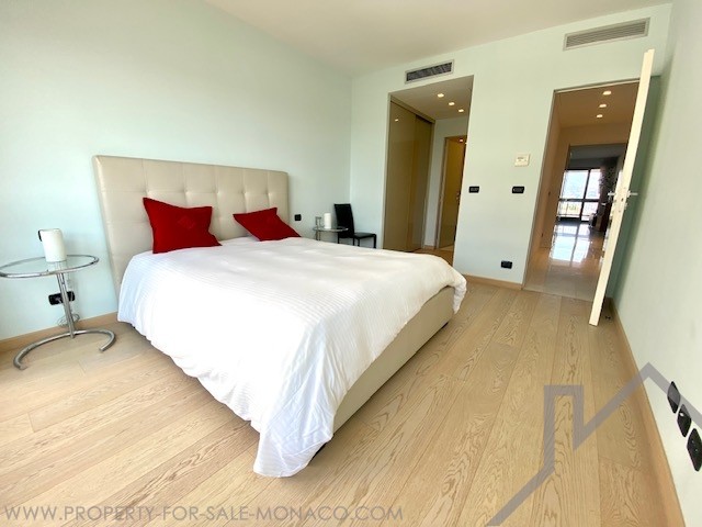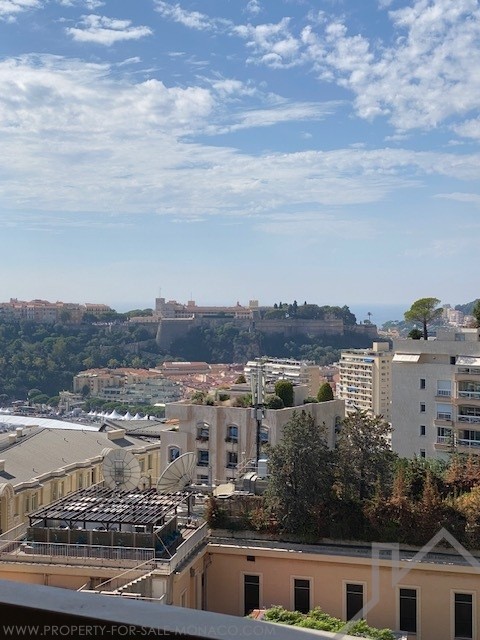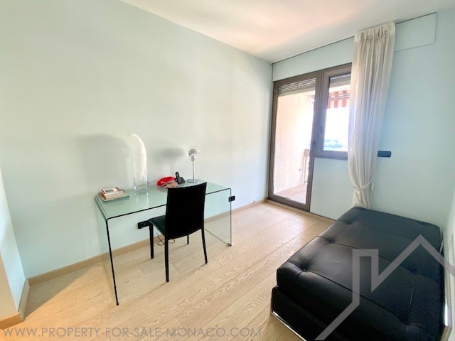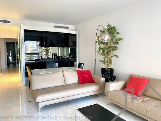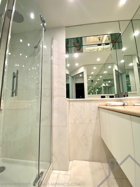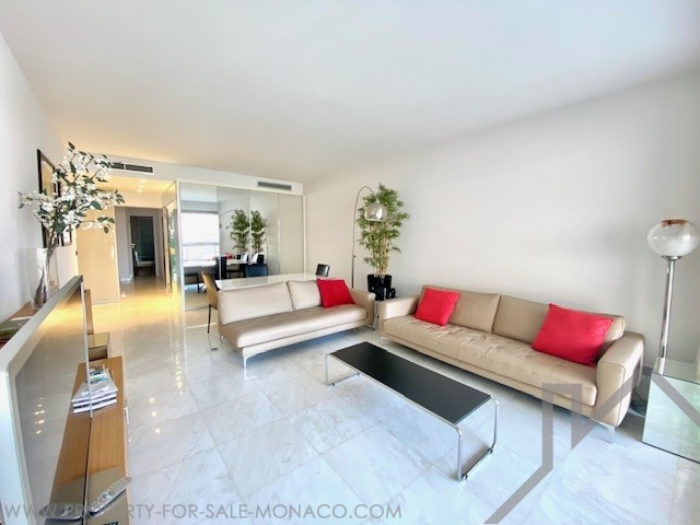 Floor-Through with double exposure, quiet (except during Grand Prix) and Sunny. Completely renovated by one of Monaco's leading decorators with high-end materials, air-con, marble floor. It consists of an entrance with cupboards, large living room with fitted kitchen opening onto large terrace on the garden side of the Casino, guest toilet, bedroom with dressing room and bathroom en suite, a spare bedroom with loggia and shower room, with both bedrooms overlooking west with wide view of the Old Town, mountains, and the Mediterranean. Large basement store-room and double parking included.