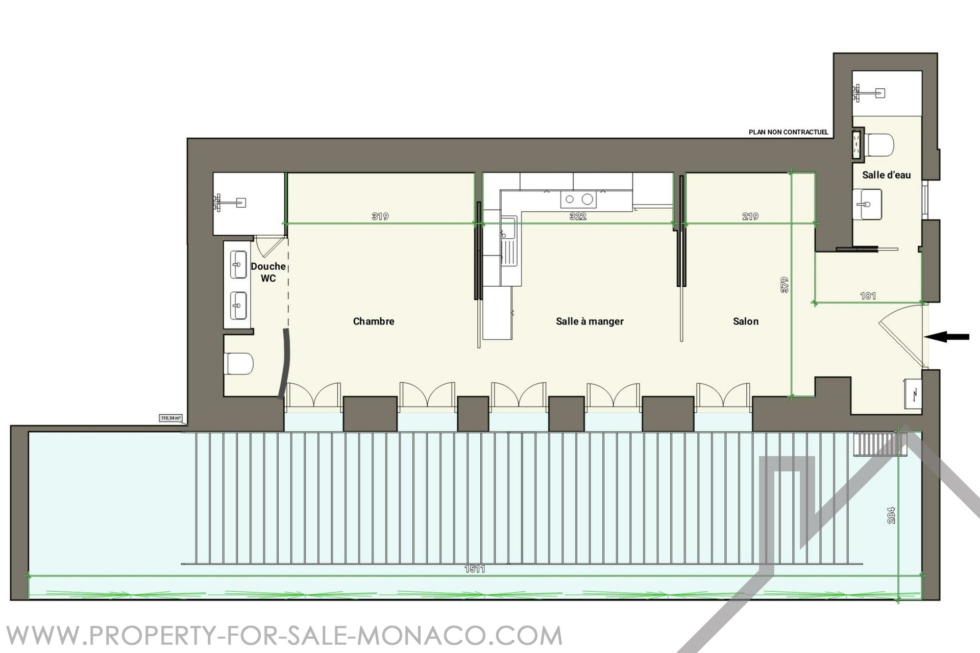 Composed by : entrance hall, living room, dining room with equipped and furnished kitchen, bedroom, 2 shower rooms, large terrace.
