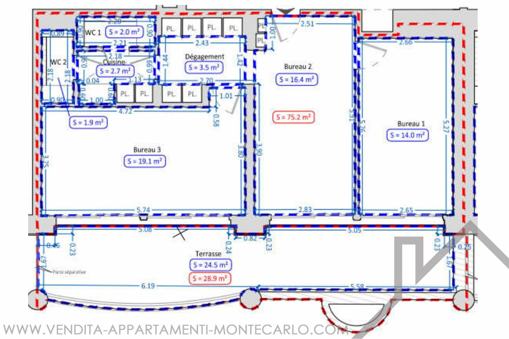 In the Carré d'Or, BEAUTIFUL OFFICE on the upper floor, enjoying plenty of sunshine, facing south, in a luxury building, with 24-hour concierge, made up of 3 separate spaces, bordered by a shared terrace of 28.9 m². 1 hallway with numerous cupboards, 2 toilets, 1 kitchen. 1 cellar Total surface area 104.10 m² including living space 75.20 m² and terrace 28.9 m²