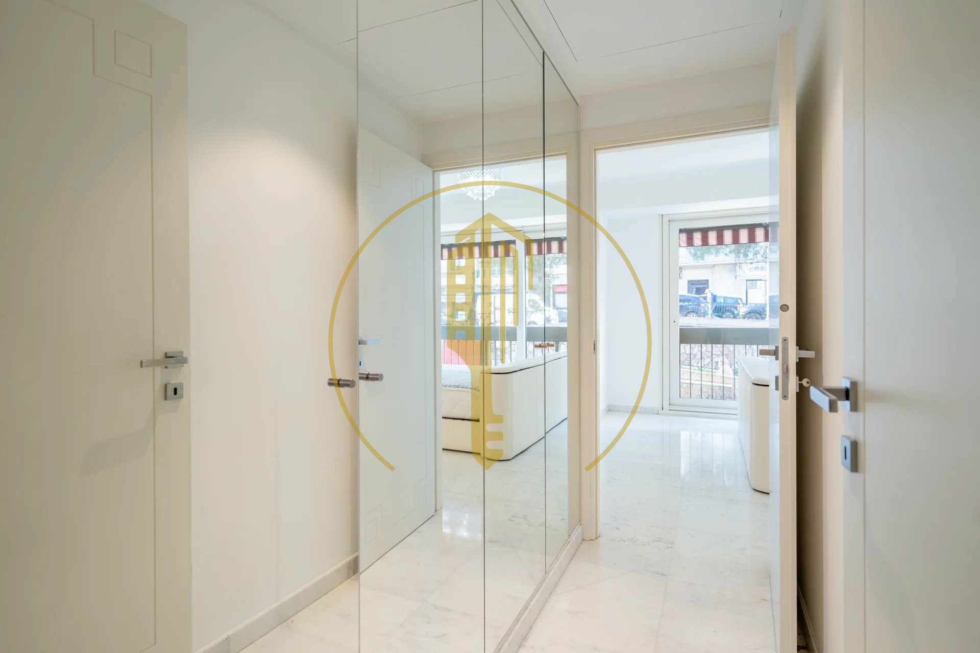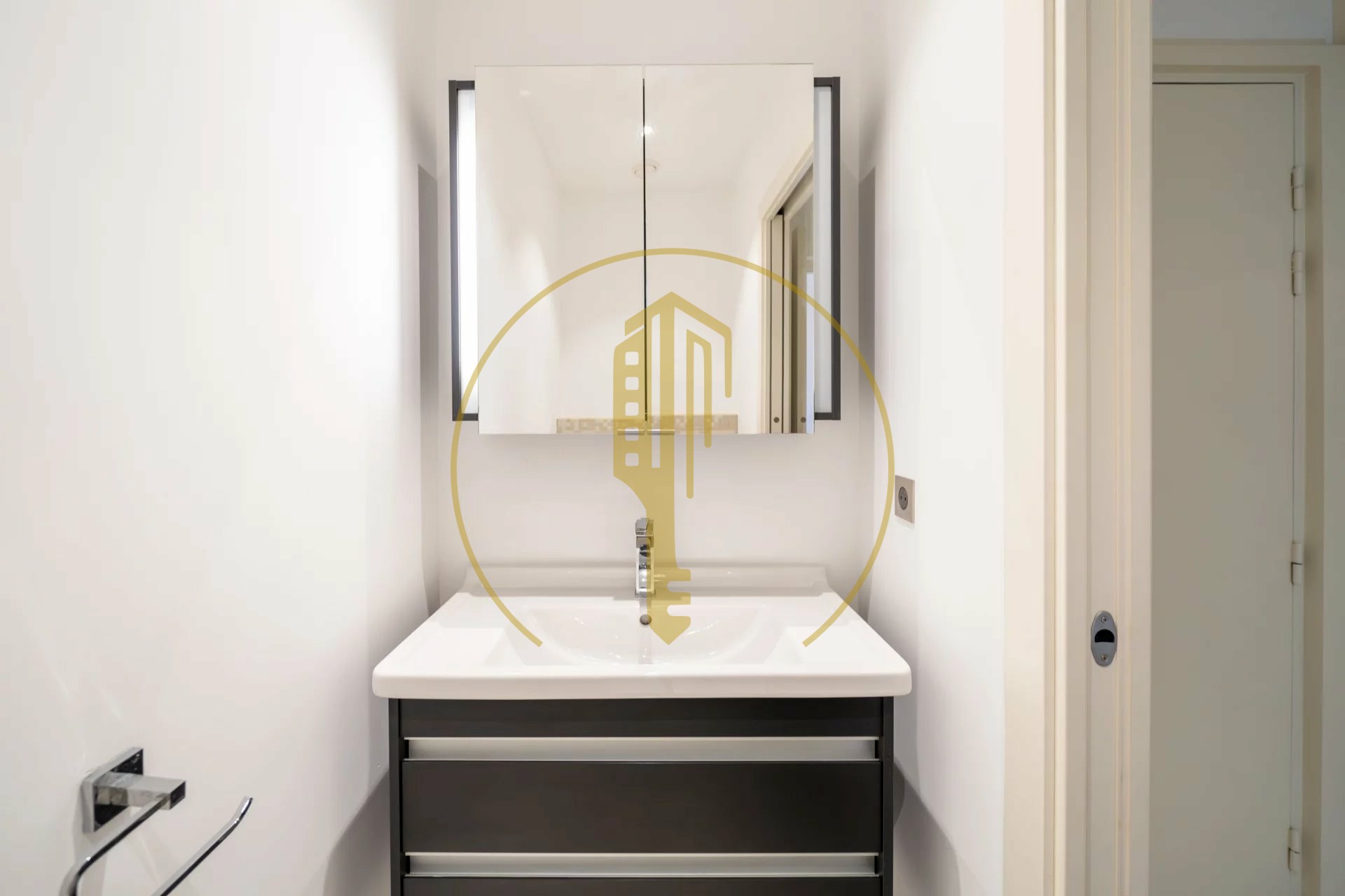 It is composed of : an entrance hall with a closet and a guest toilet, a living room with a fitted kitchen and a balcony, a bedroom with an en suite bathroom.