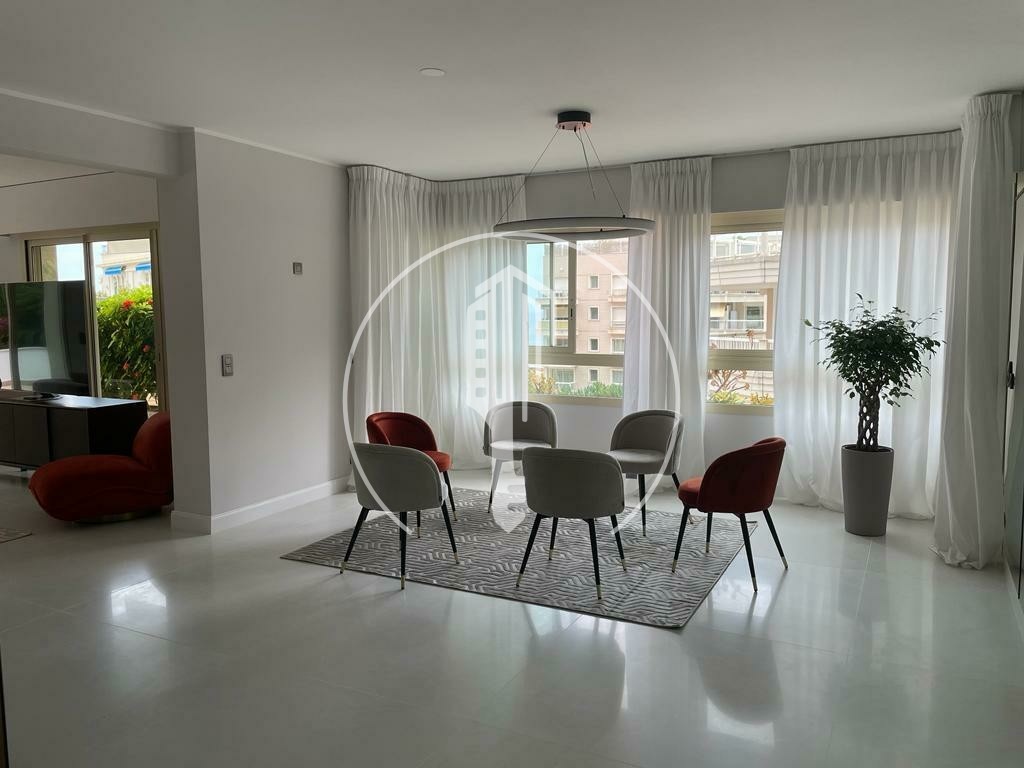It consists of an entrance hall, a double living room / dining room, a master bedroom with bathroom and dressing room, 2 bedrooms, a second bathroom, an independent fully fitted and equipped kitchen, a guest toilet, a large terrace with trees offering a small sea view.