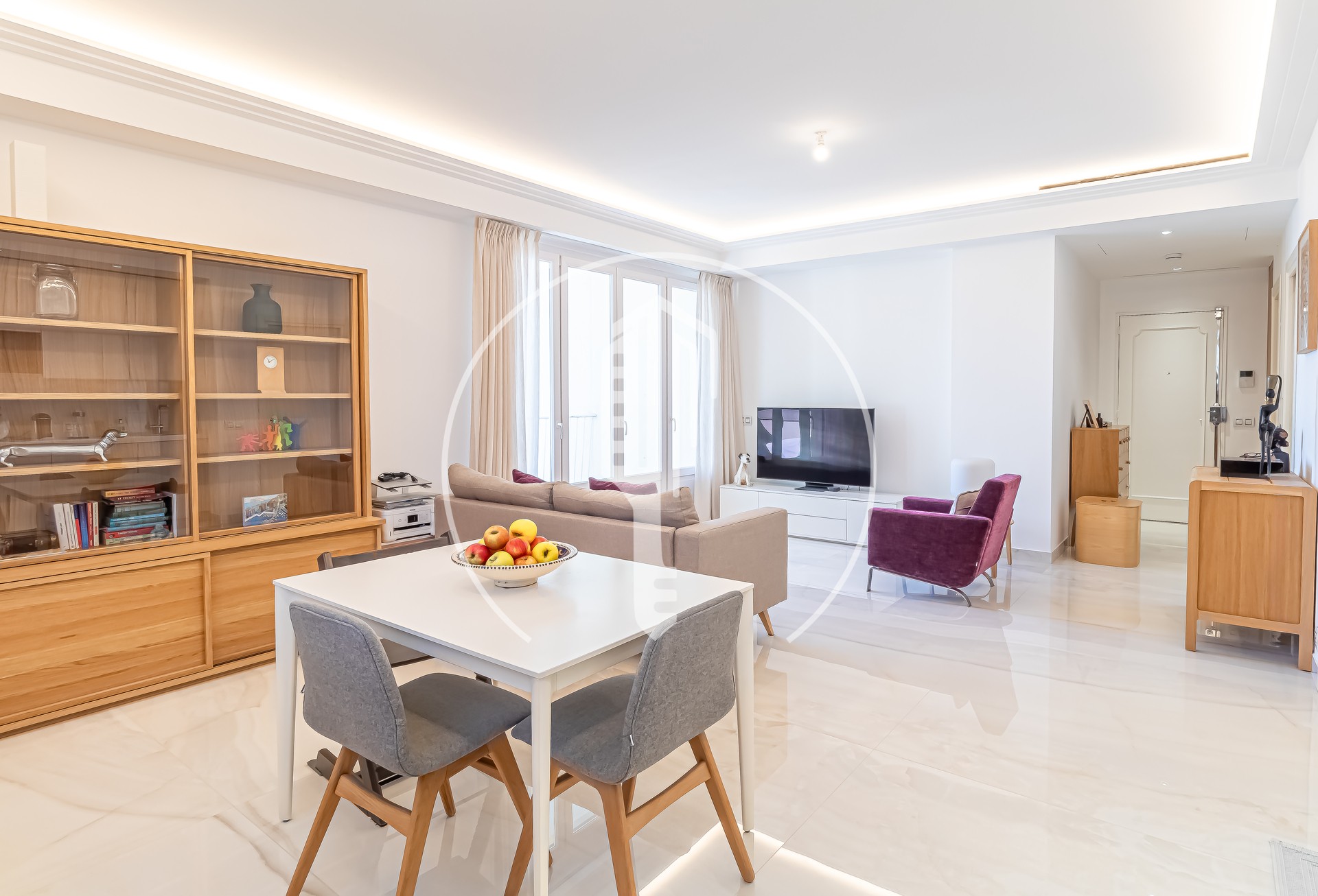 Entrance, living room with open plan kitchen, 2 bedrooms, bathroom, shower room, cupboards, terrace in front, balcony with laundry space, air conditionning.