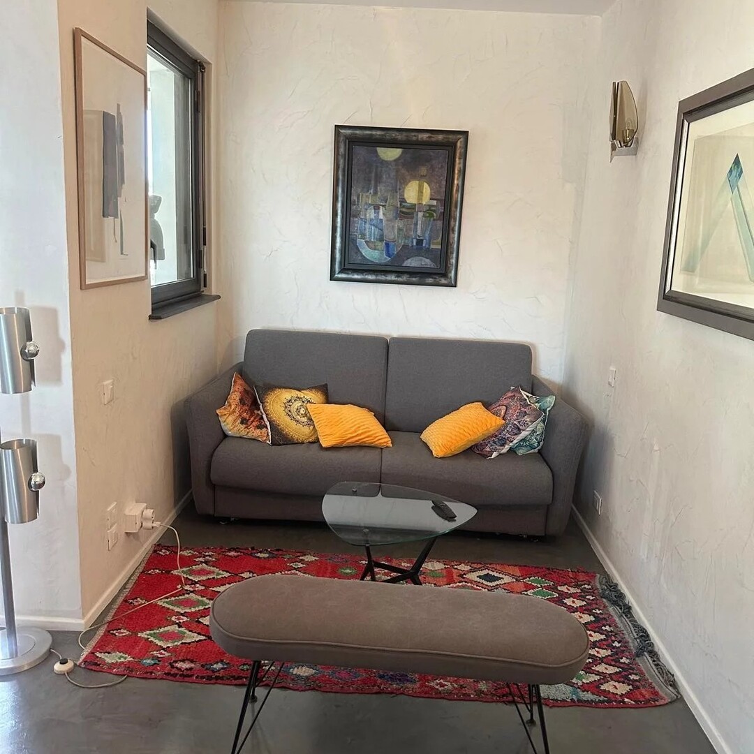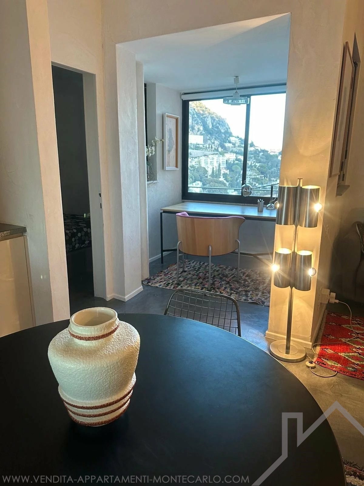 The studio, with an area of 40 m², includes an entrance hall with fitted wardrobe, a main room with an equipped kitchen, a sleeping area and a full shower room. It enjoys a view of the sea and Cap Martin. The studio is sold with a cellar and parking.