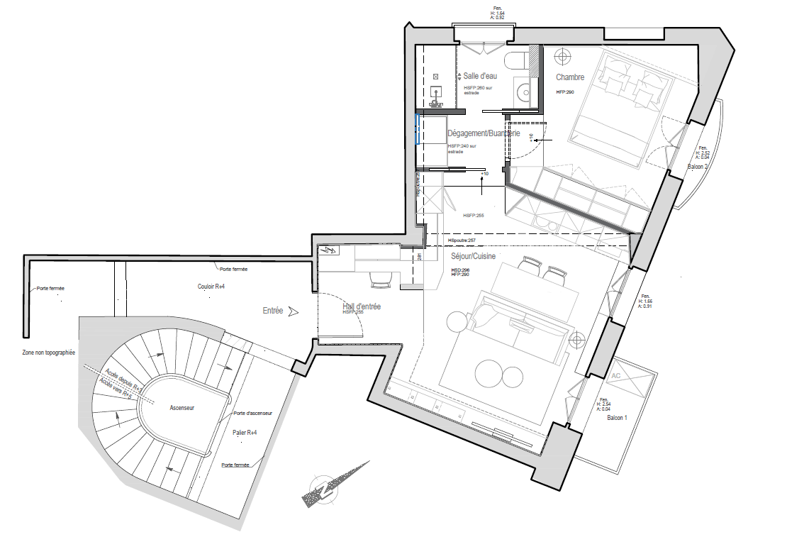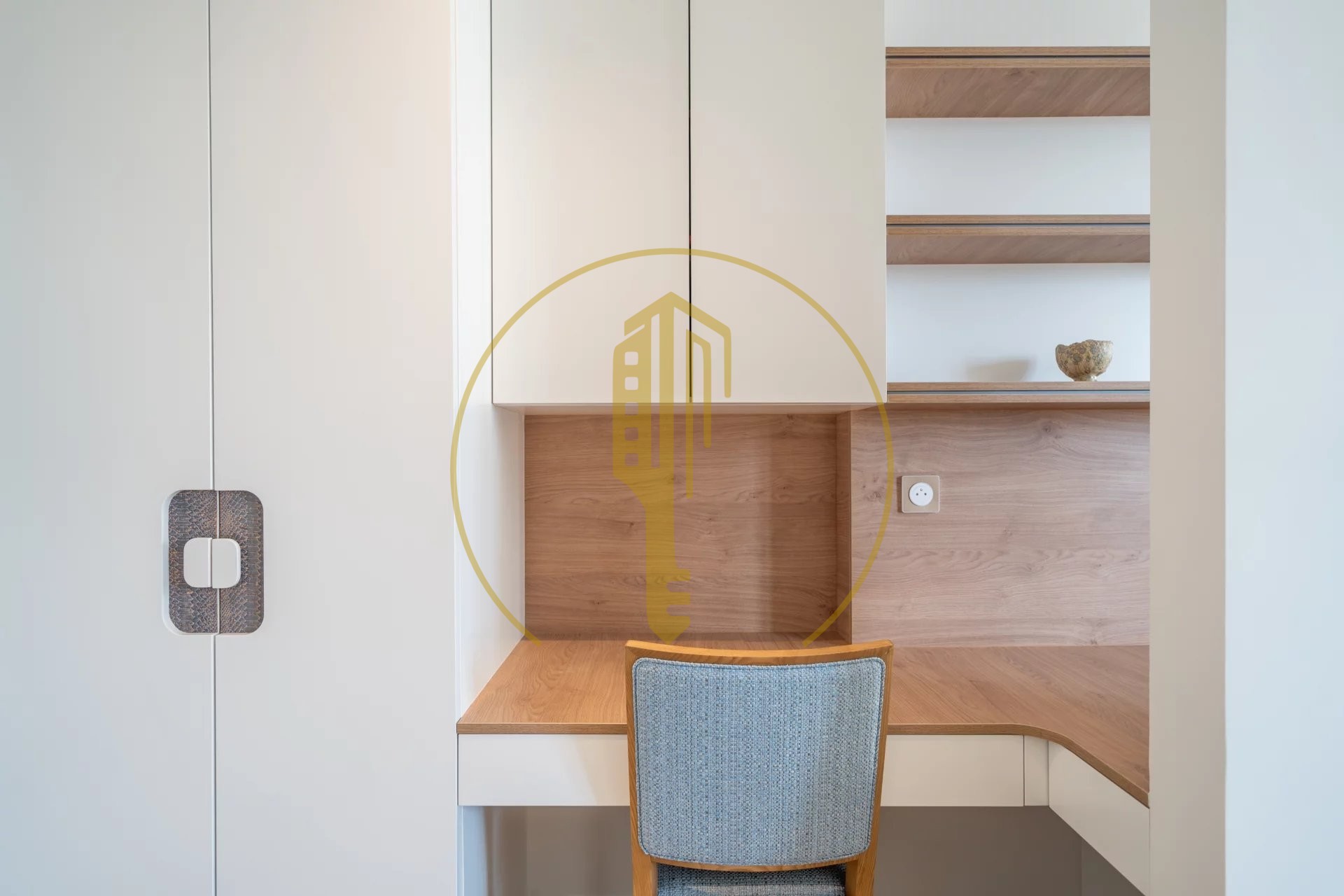 It is composed of an entrance hall with a study area, a living room with a balcony and a fitted kitchen, a bedroom with closets, a shower room and a laundry space.