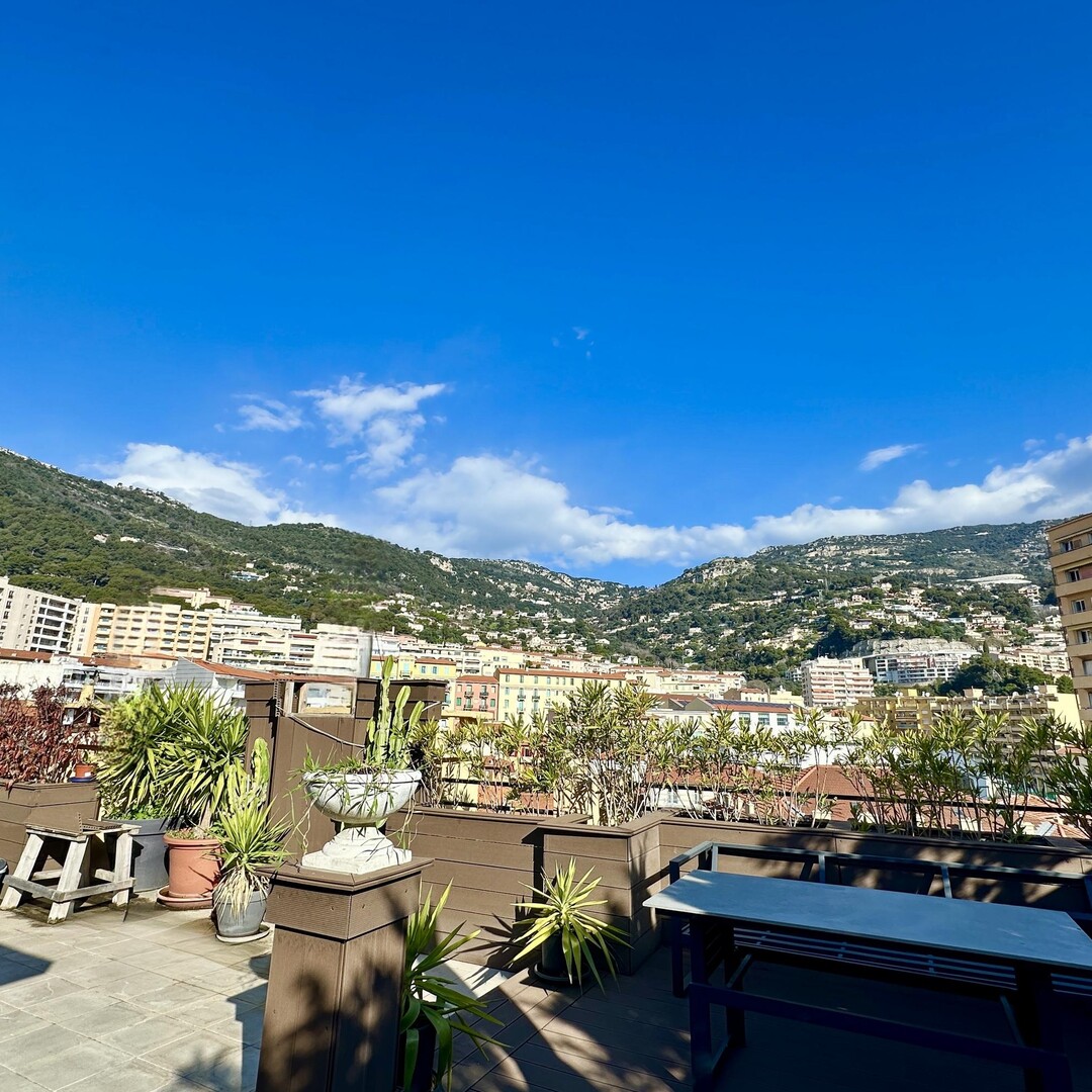 Penthouse with 2/3 rooms and a rooftop terrace in a charming bourgeois building located in the residential area of Boulevard de Belgique. This property features a beautiful entrance hall leading to a bright double living room, a fully-equipped, separate kitchen, a very pleasant terrace with a sea and Rock view, a master bedroom and a shower room. On the upper floor, there is an additional room, perfect for an office or a lounge, that opens onto a rooftop terrace with a bar and summer kitchen.