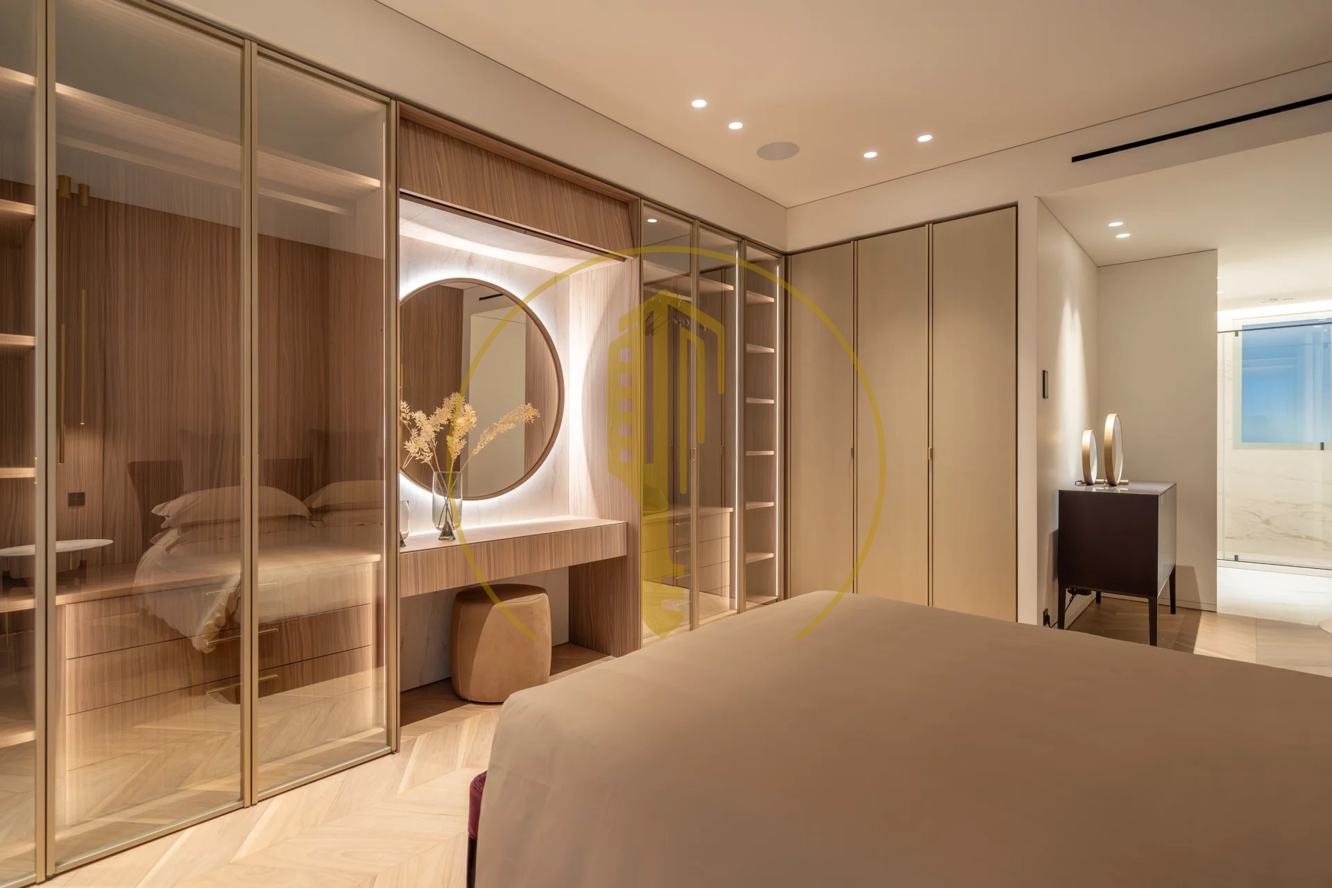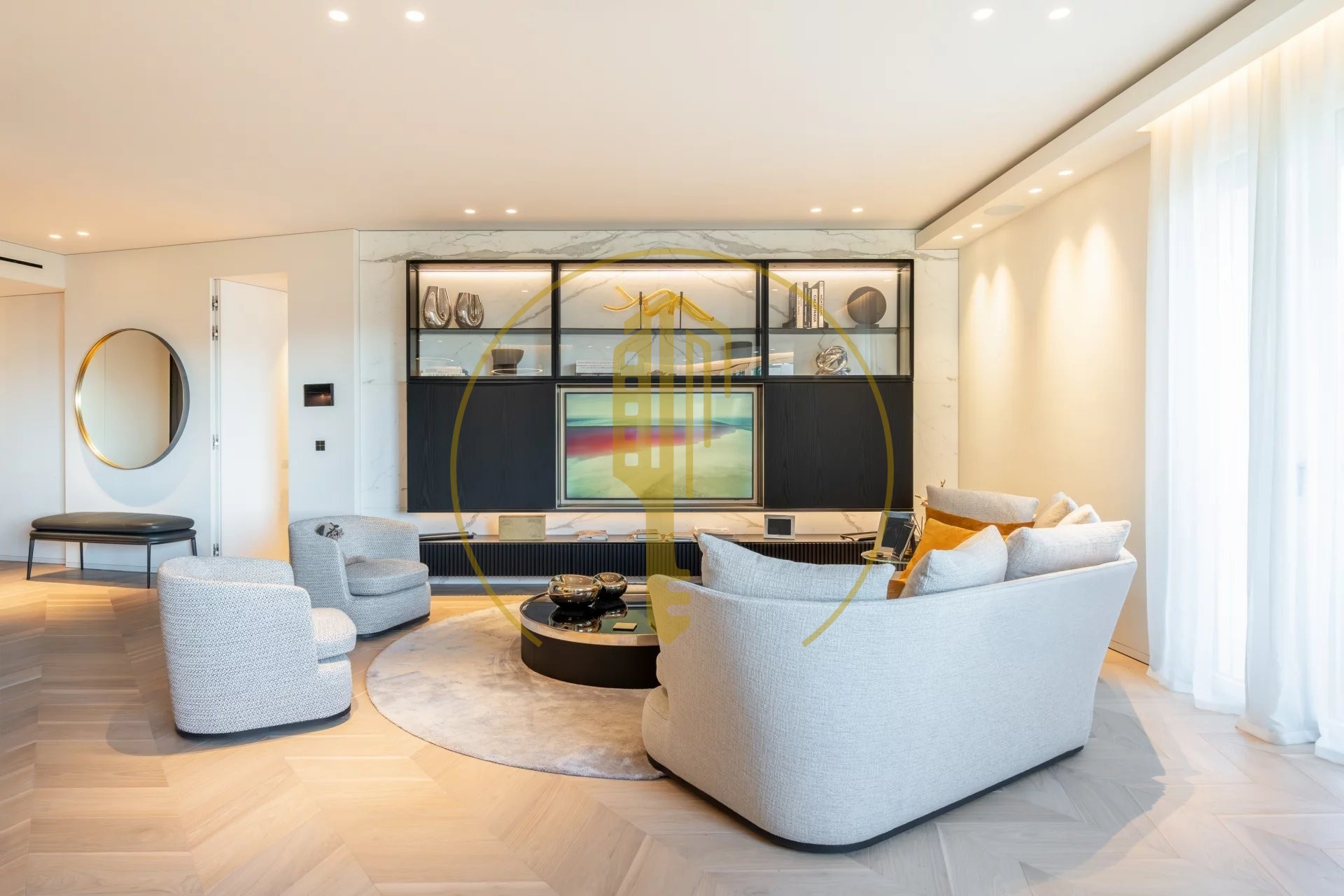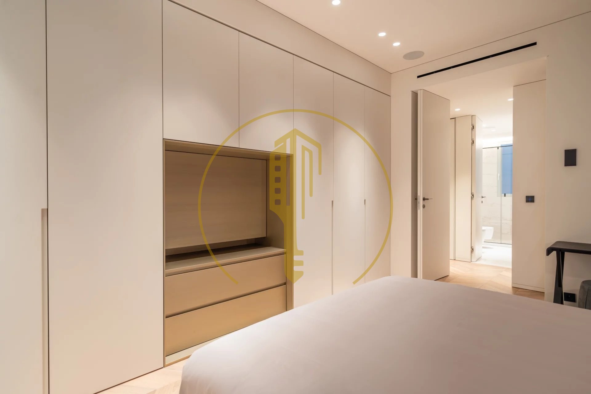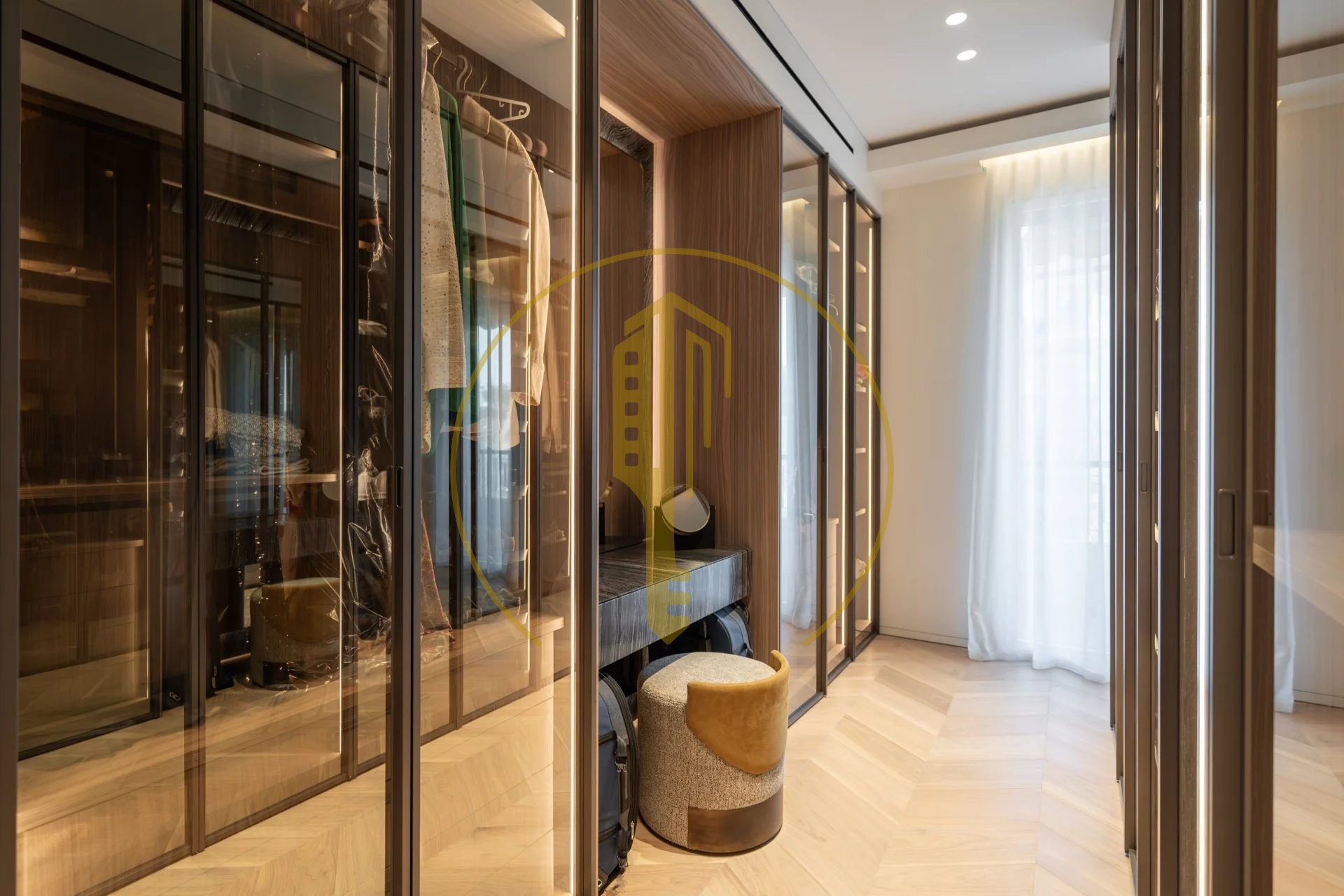 It is composed of an entrance hall, a bright living room with a balcony and a pleasant view of the Casino gardens, a semi-open and fully equipped kitchen, a master bedroom with a shower room and a large dressing room, two bedrooms each with their own dressing rooms and shower rooms, a guest toilet.
