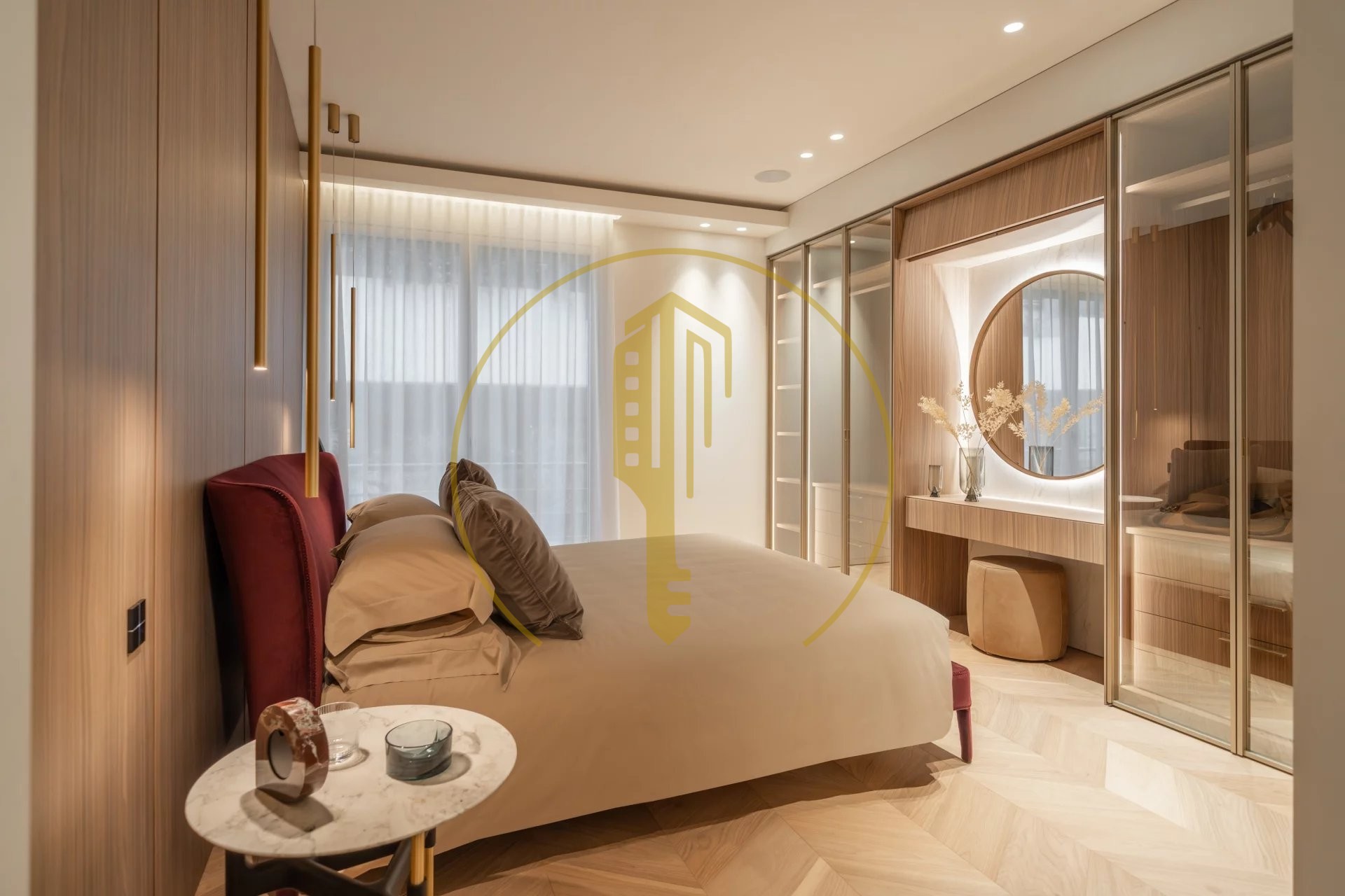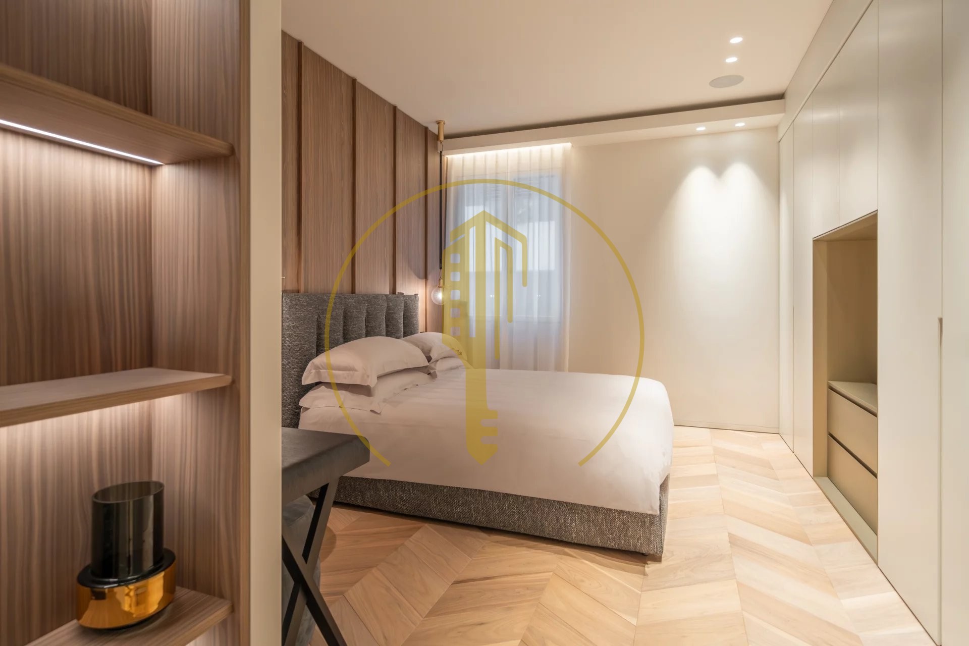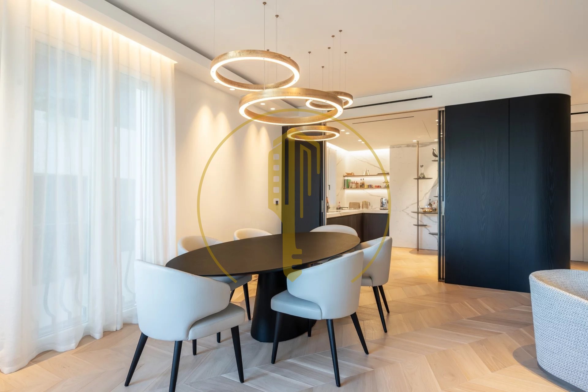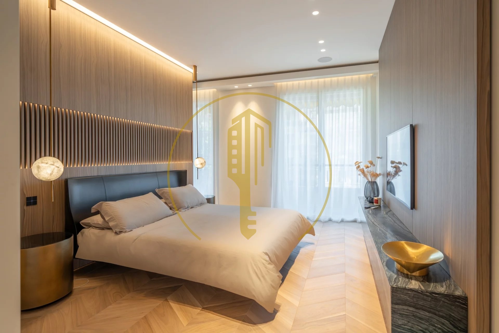 It is composed of an entrance hall, a bright living room with a balcony and a pleasant view of the Casino gardens, a semi-open and fully equipped kitchen, a master bedroom with a shower room and a large dressing room, two bedrooms each with their own dressing rooms and shower rooms, a guest toilet.