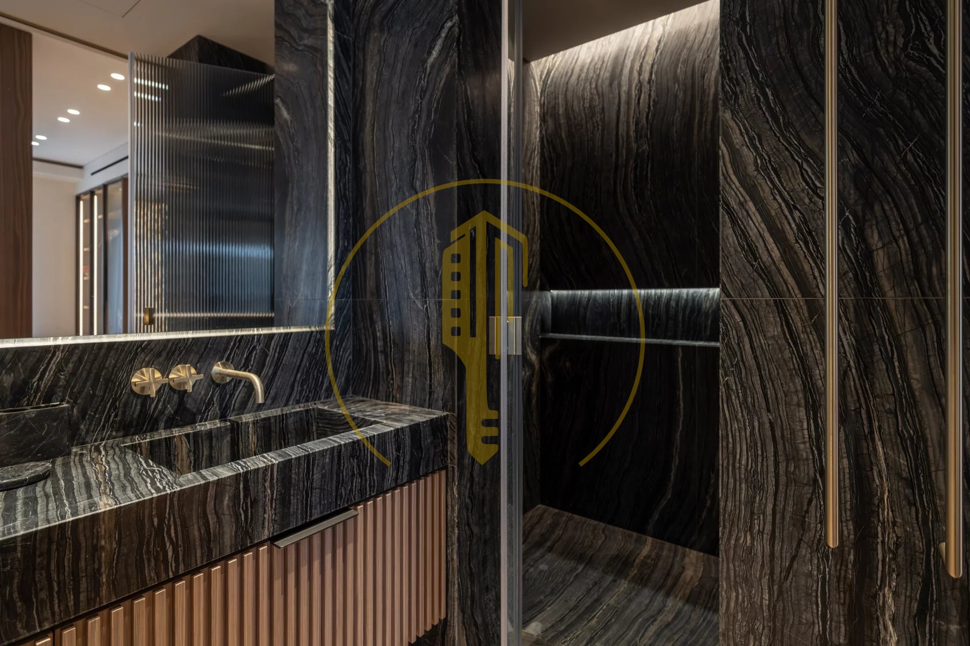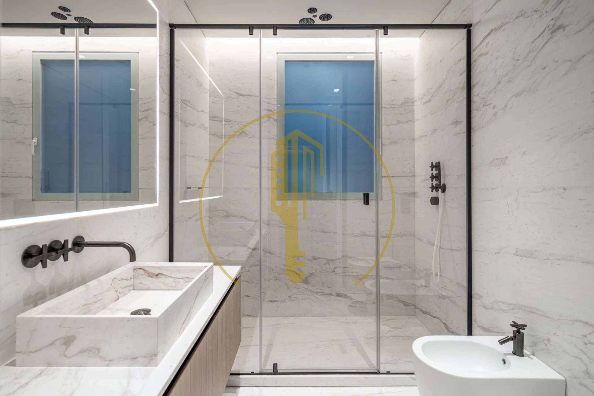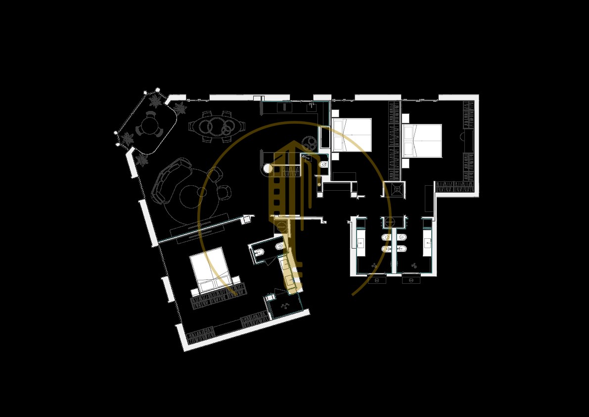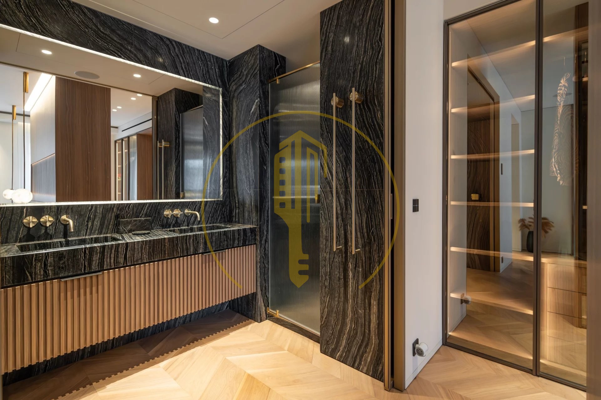 It is composed of an entrance hall, a bright living room with a balcony and a pleasant view of the Casino gardens, a semi-open and fully equipped kitchen, a master bedroom with a shower room and a large dressing room, two bedrooms each with their own dressing rooms and shower rooms, a guest toilet.