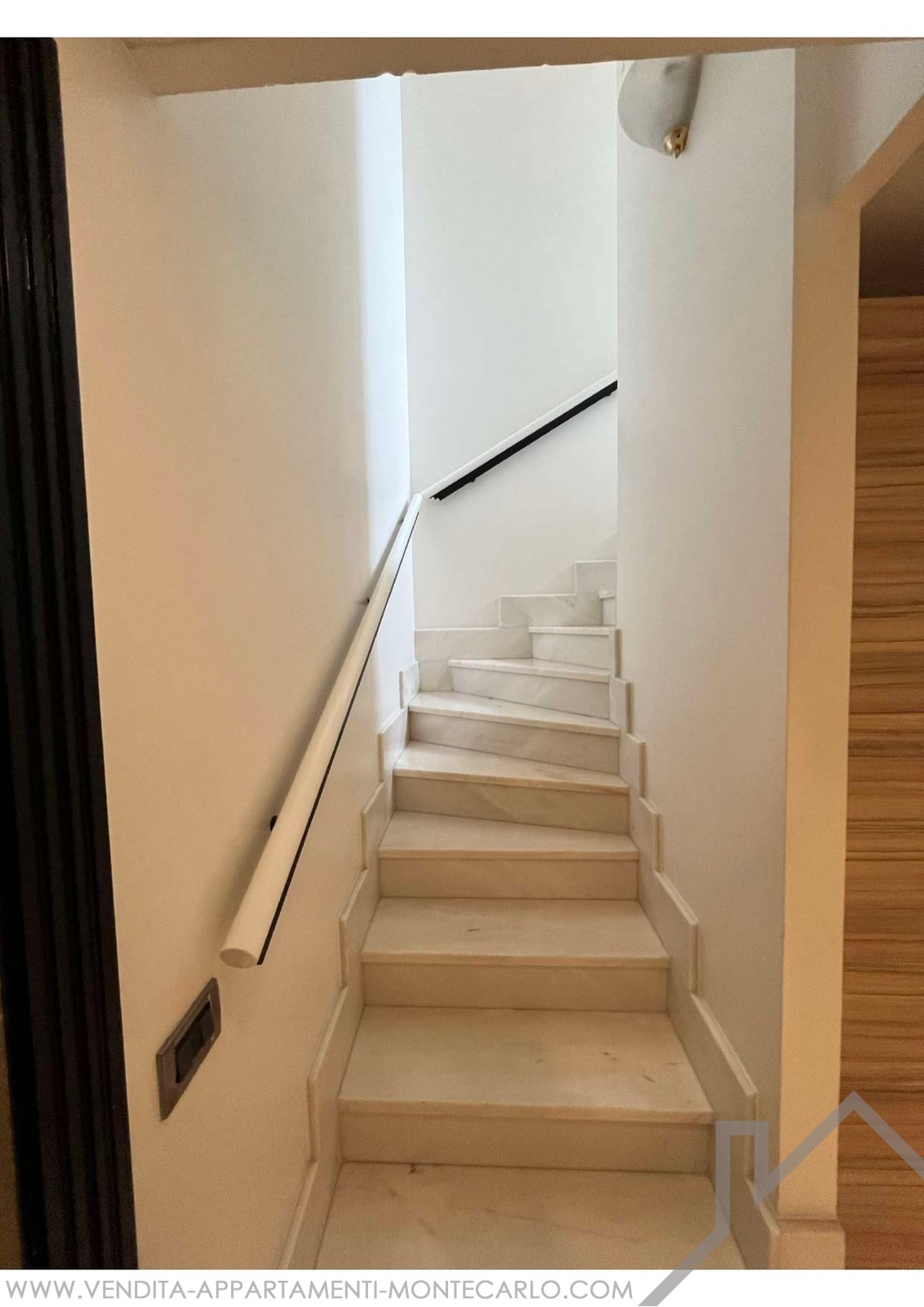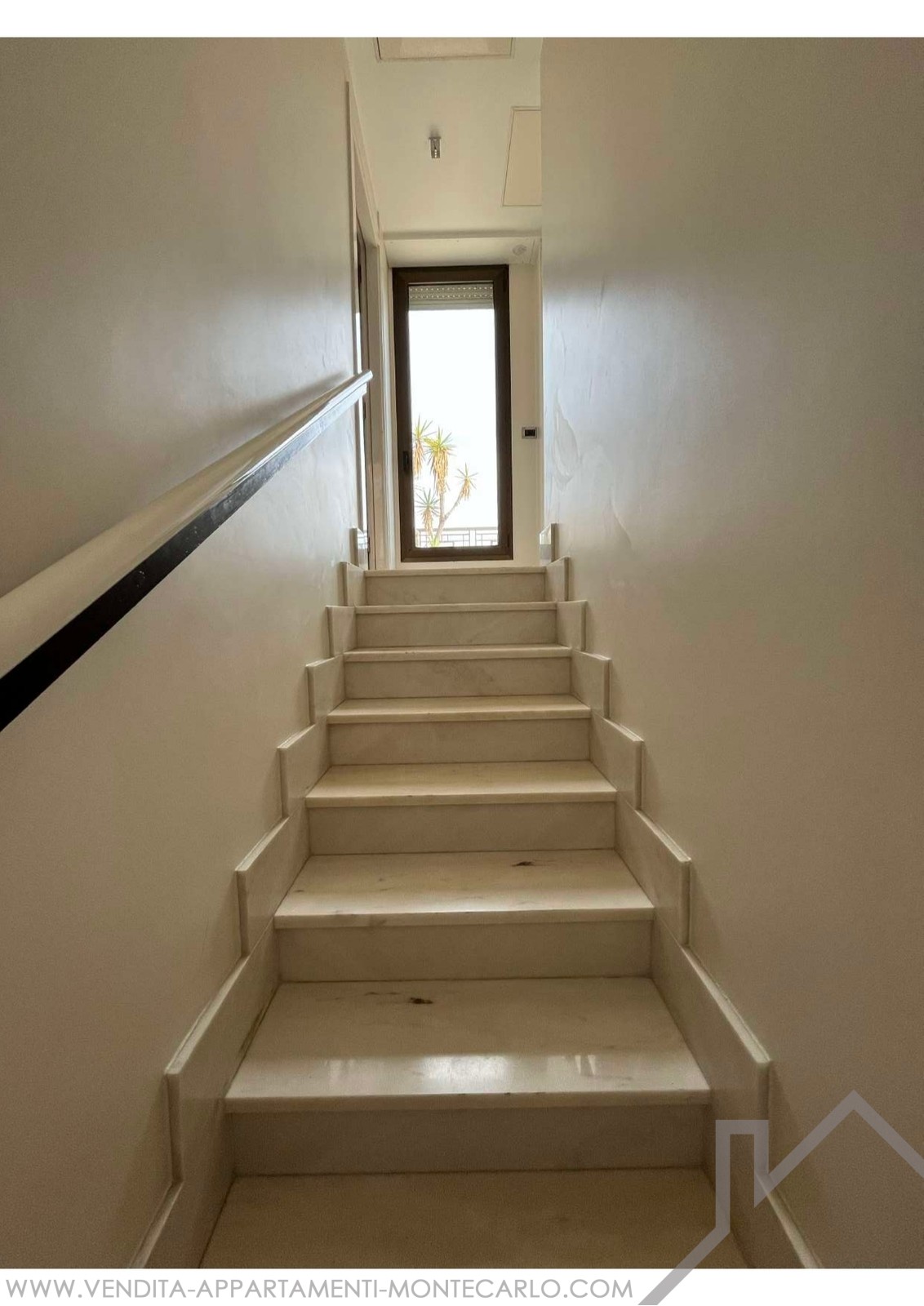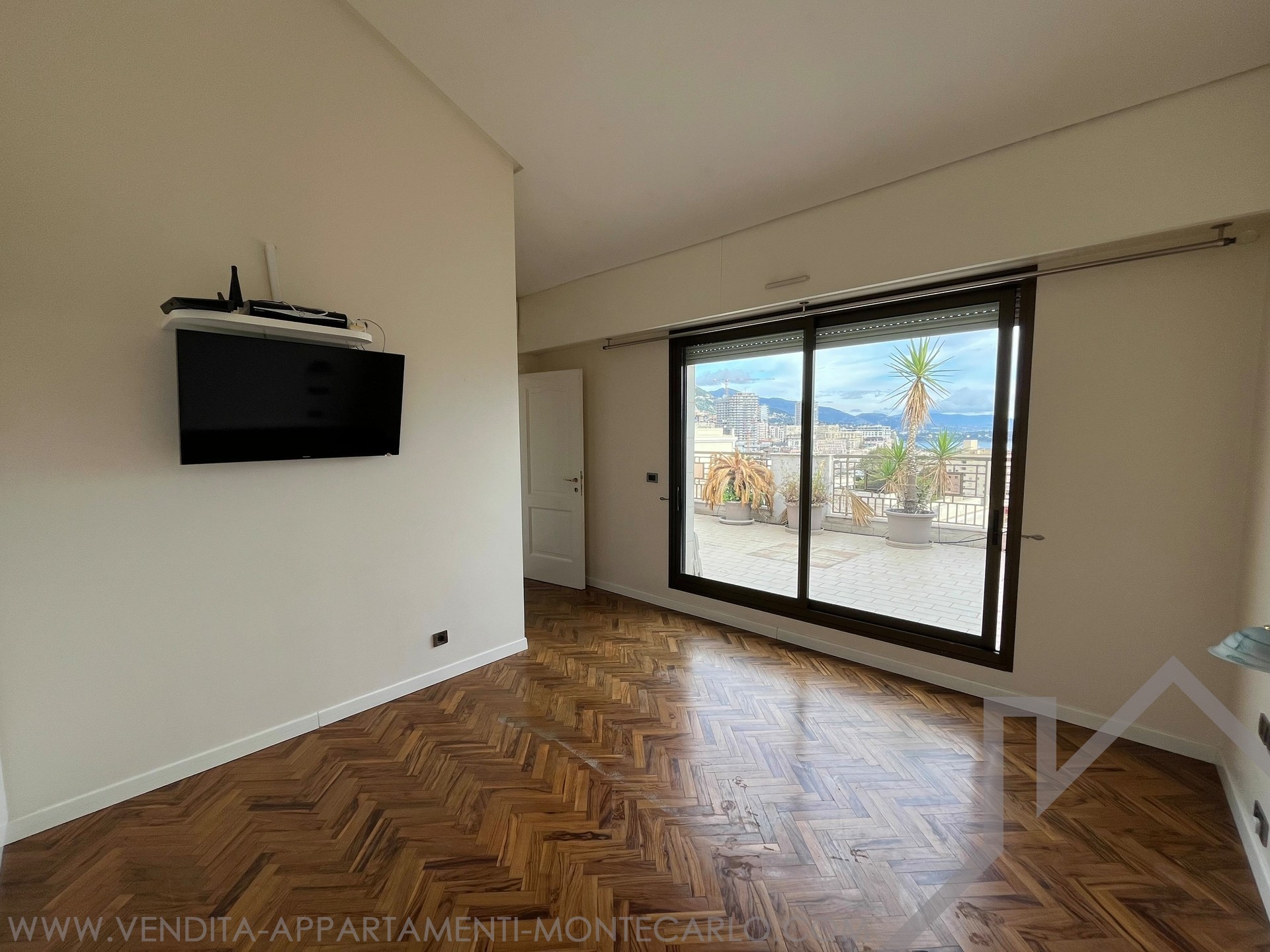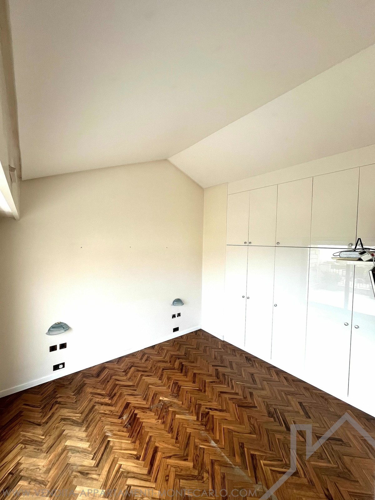 A refined staircase leads to the upper floor, the building's top floor where you will find a master bedroom with an en-suite bathroom and a large bay window opening onto a vast terrace. Enjoy breathtaking views of the sea, the Rock, and Roquebrune. A second bright bedroom, also with an en-suite bathroom, is dual-aspect with a window offering a sea view and a French door leading to a small balcony at the rear. The volumes of the bedrooms are particularly remarkable, thanks to generous ceiling heights, providing a sense of space and natural light.