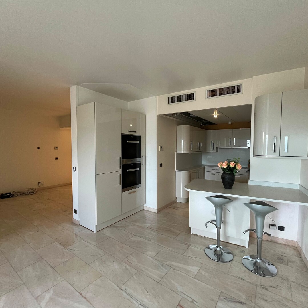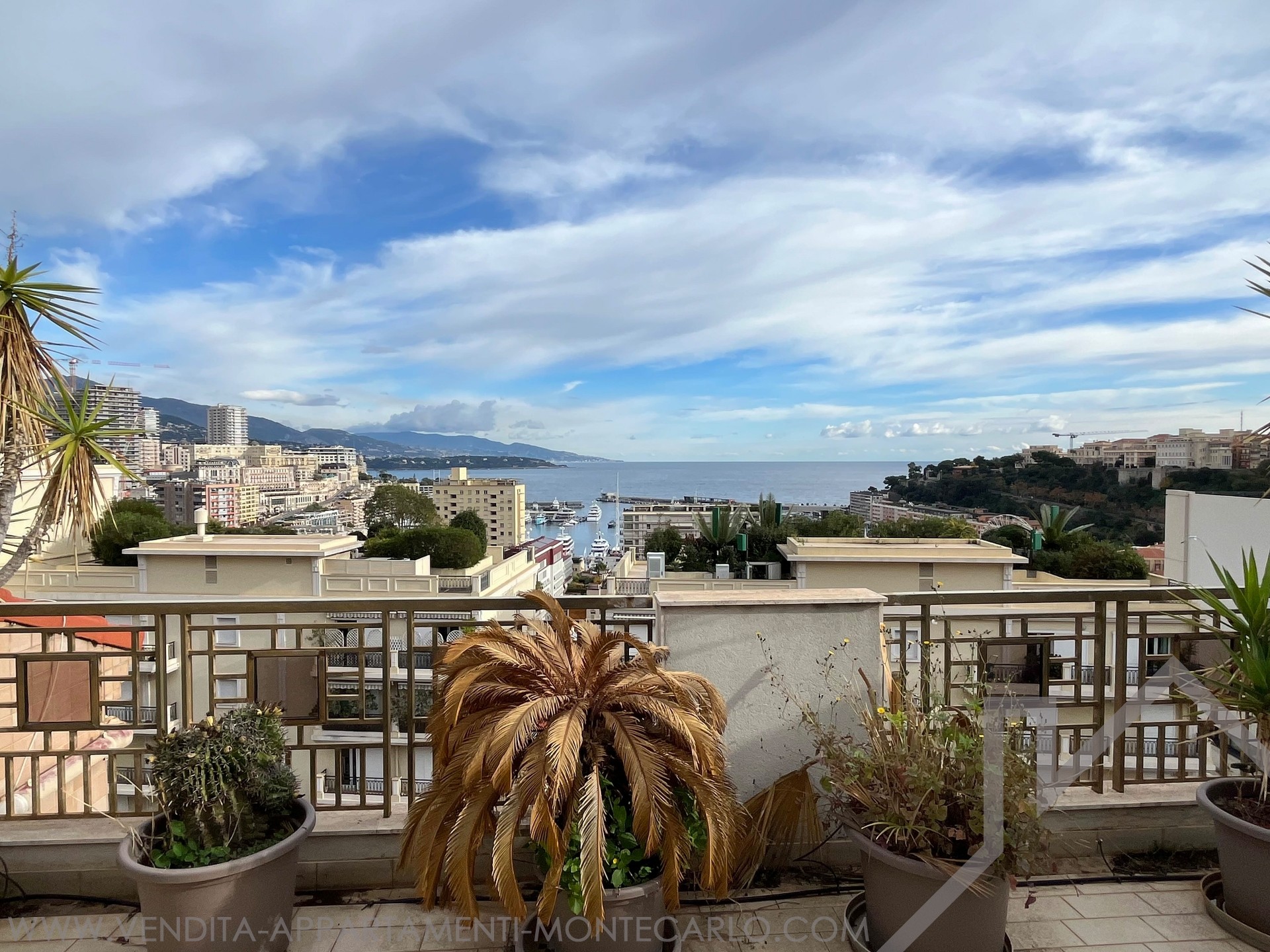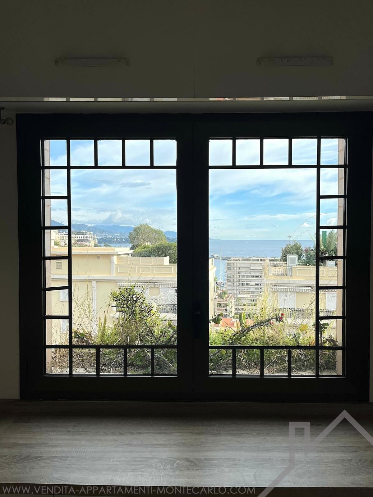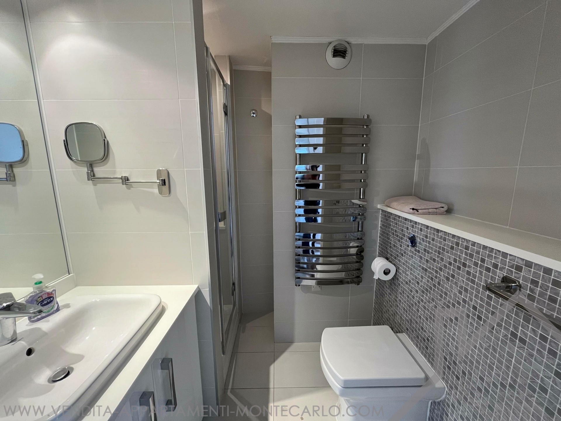 A refined staircase leads to the upper floor, the building's top floor where you will find a master bedroom with an en-suite bathroom and a large bay window opening onto a vast terrace. Enjoy breathtaking views of the sea, the Rock, and Roquebrune. A second bright bedroom, also with an en-suite bathroom, is dual-aspect with a window offering a sea view and a French door leading to a small balcony at the rear. The volumes of the bedrooms are particularly remarkable, thanks to generous ceiling heights, providing a sense of space and natural light.