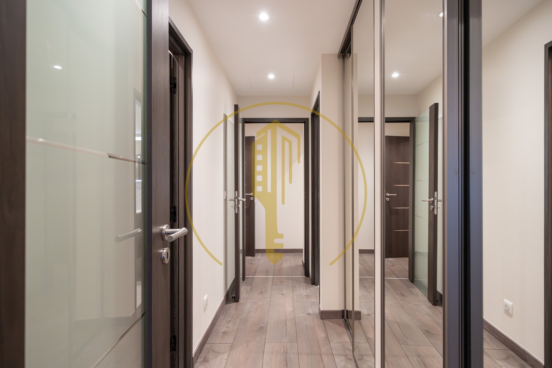 It comprises an entrance hall with fitted closets, a living room opening onto a balcony, an open-plan fully equipped kitchen, two bedrooms with adjoining closets, two shower rooms, and an additional bedroom with a closet and bathroom.