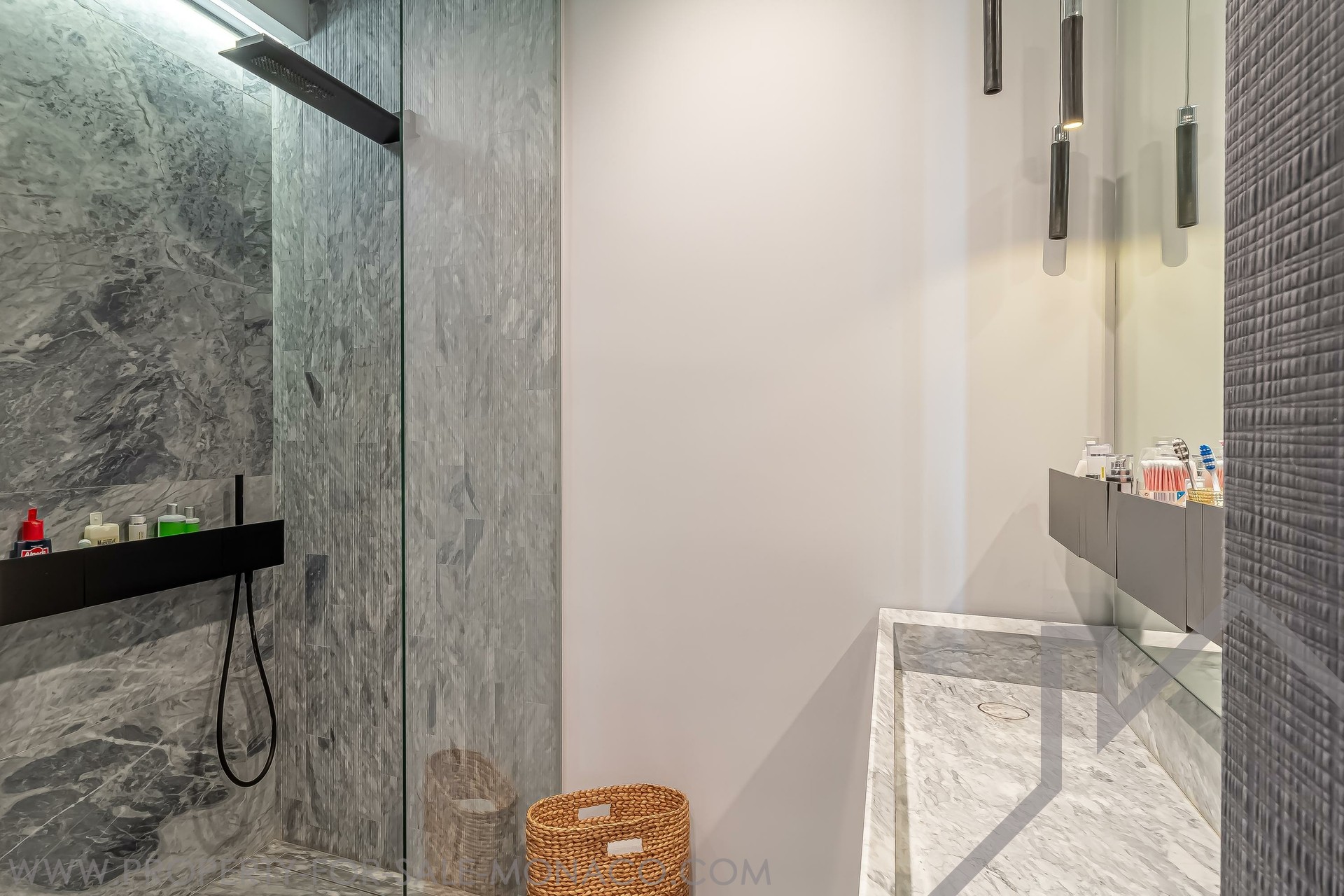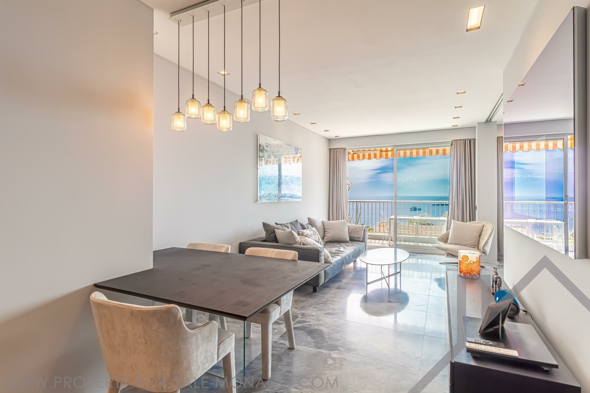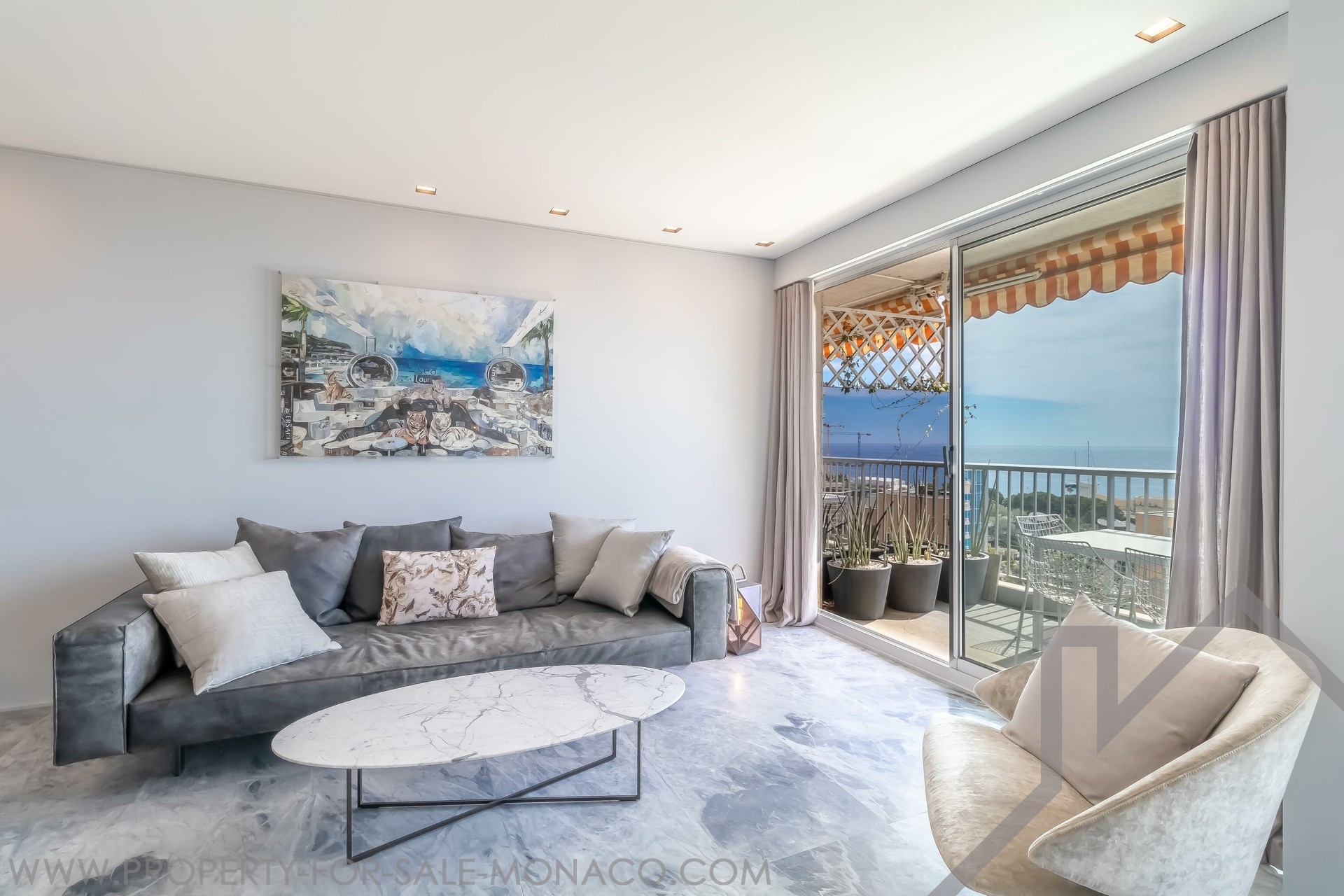 In the Château d'Azur building, this high-floor apartment has been fully renovated with high-quality materials. It offers a lovely view of the sea.