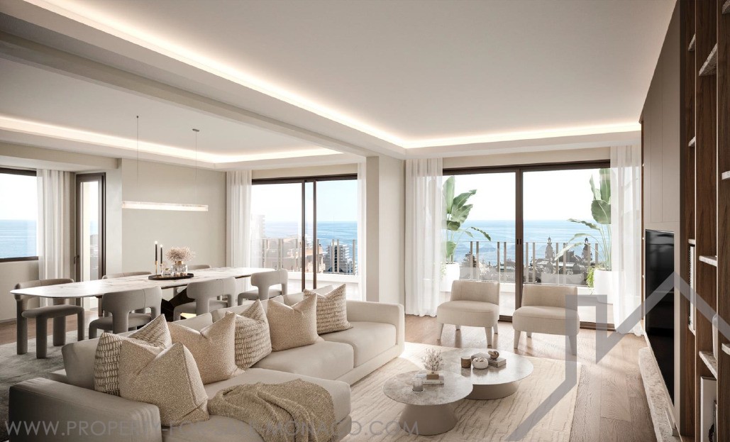 an entrance, a bright living room opening onto a large terrace of more than 30 m² offering a breathtaking view of the sea and the Casino, a fitted and equipped kitchen, as well as two en-suite bedrooms with their bathrooms and a guest toilet.