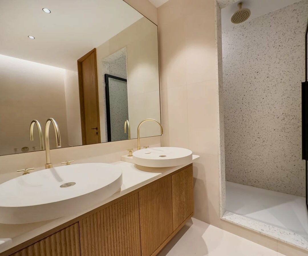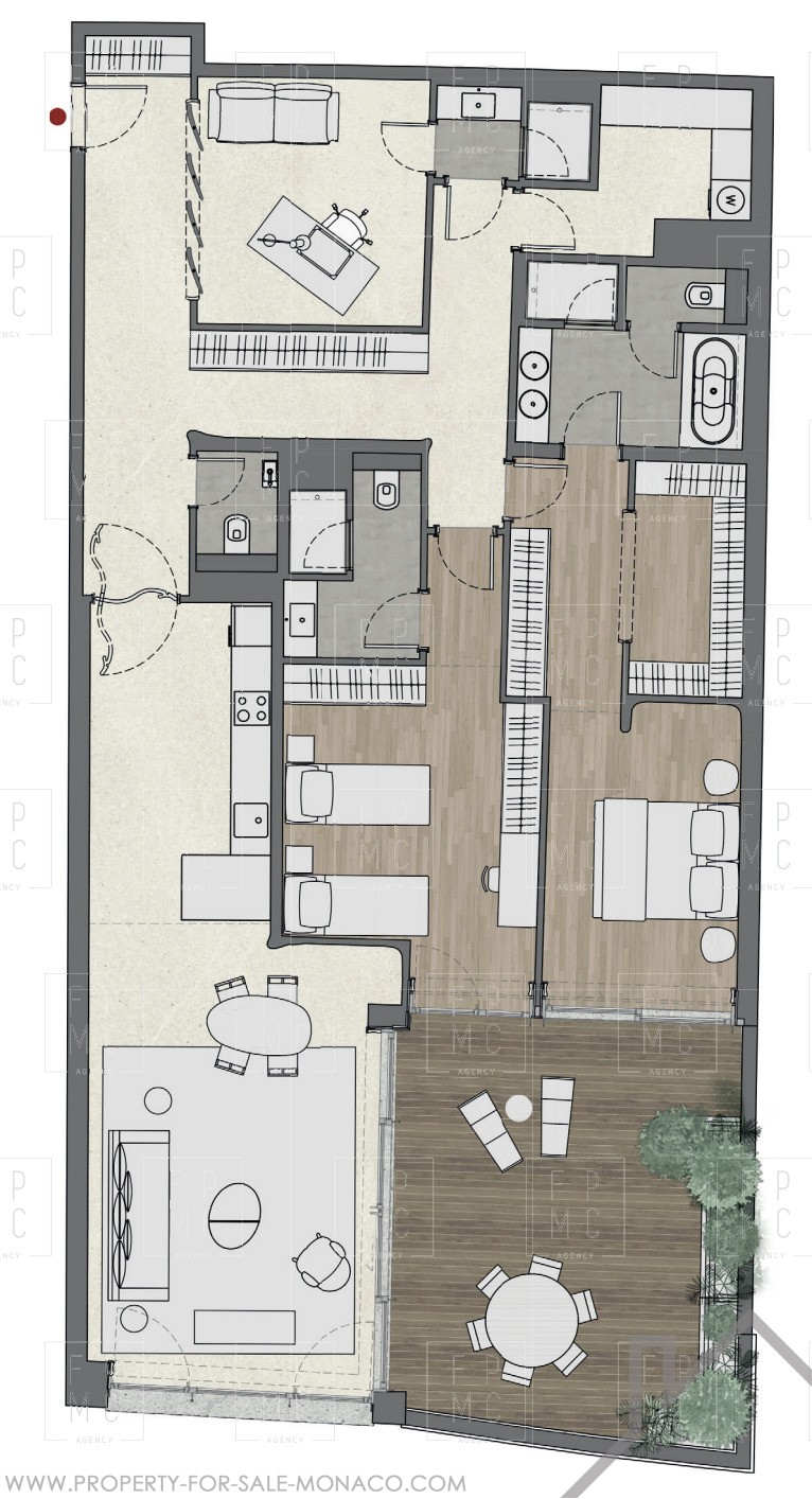 This 3-room apartment comprises an entrance hall leading to a living/dining room with open kitchen, a spacious master bedroom with dressing room and bathroom, a second bedroom with shower room, a storeroom, a guest toilet and dressing room, and a terrace.