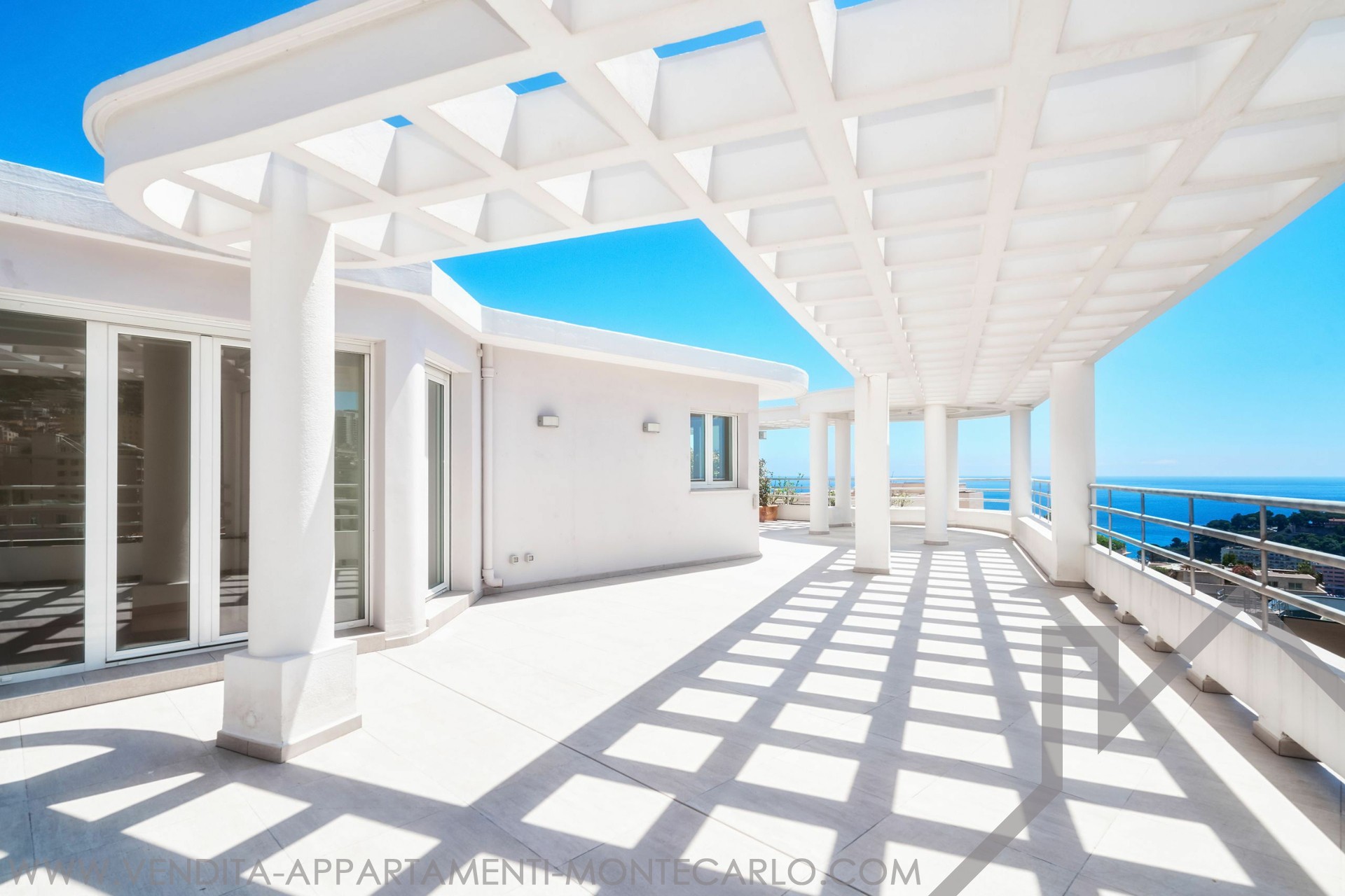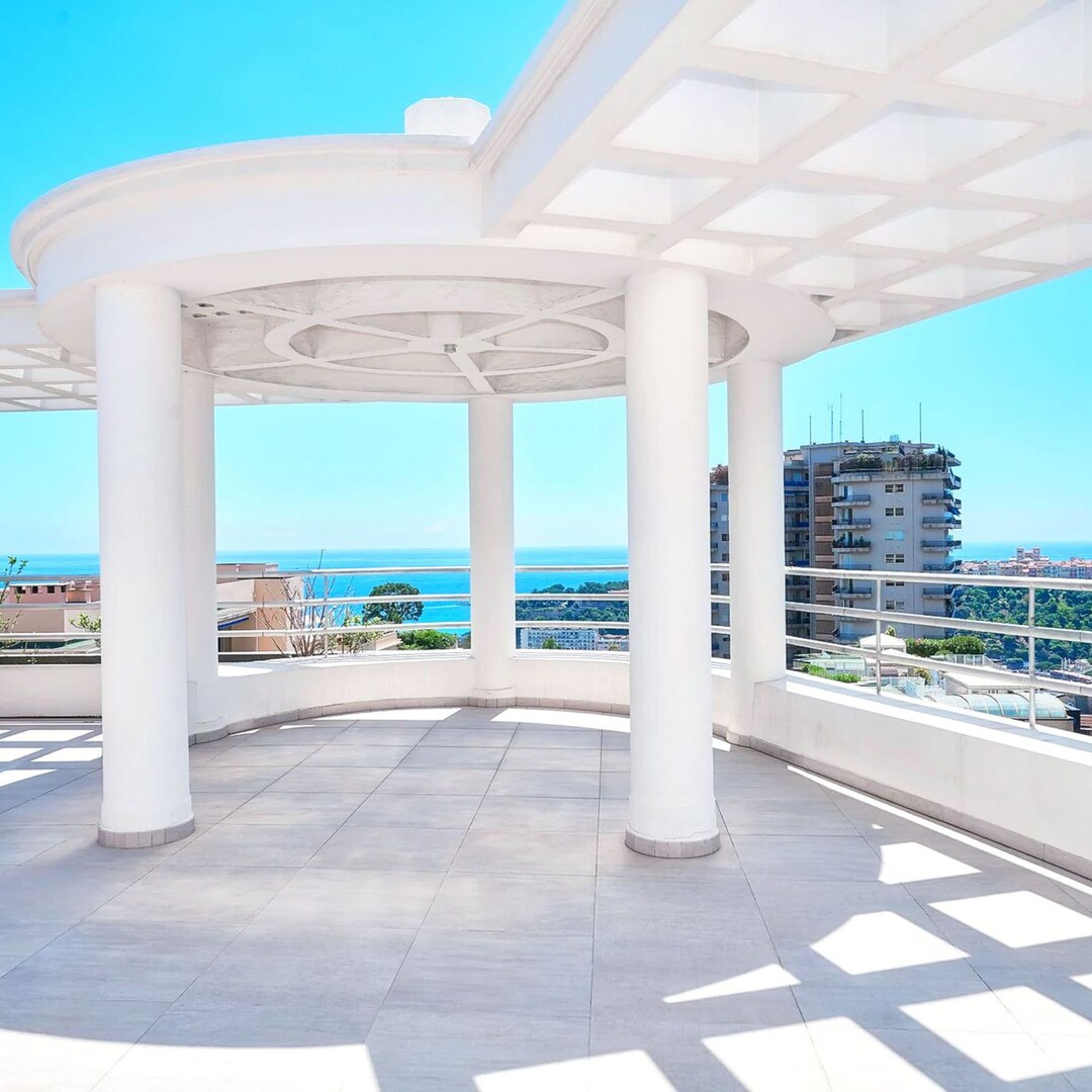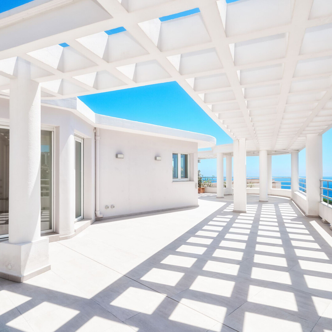 EXCLUSIVE Spacious Penthouse/Duplex with panoramic sea views and a large circular rooftop terrace: First level: entrance hall, guest toilet, double living/dining room, equipped kitchen, 2 bedrooms with en-suite bathrooms, 1 maid's room with shower, plenty of closets. 2 terraces. Upper level: 1 large bedroom, 1 bathroom with walk-in closet, an office. Garage for 3 cars, 1 cellar.