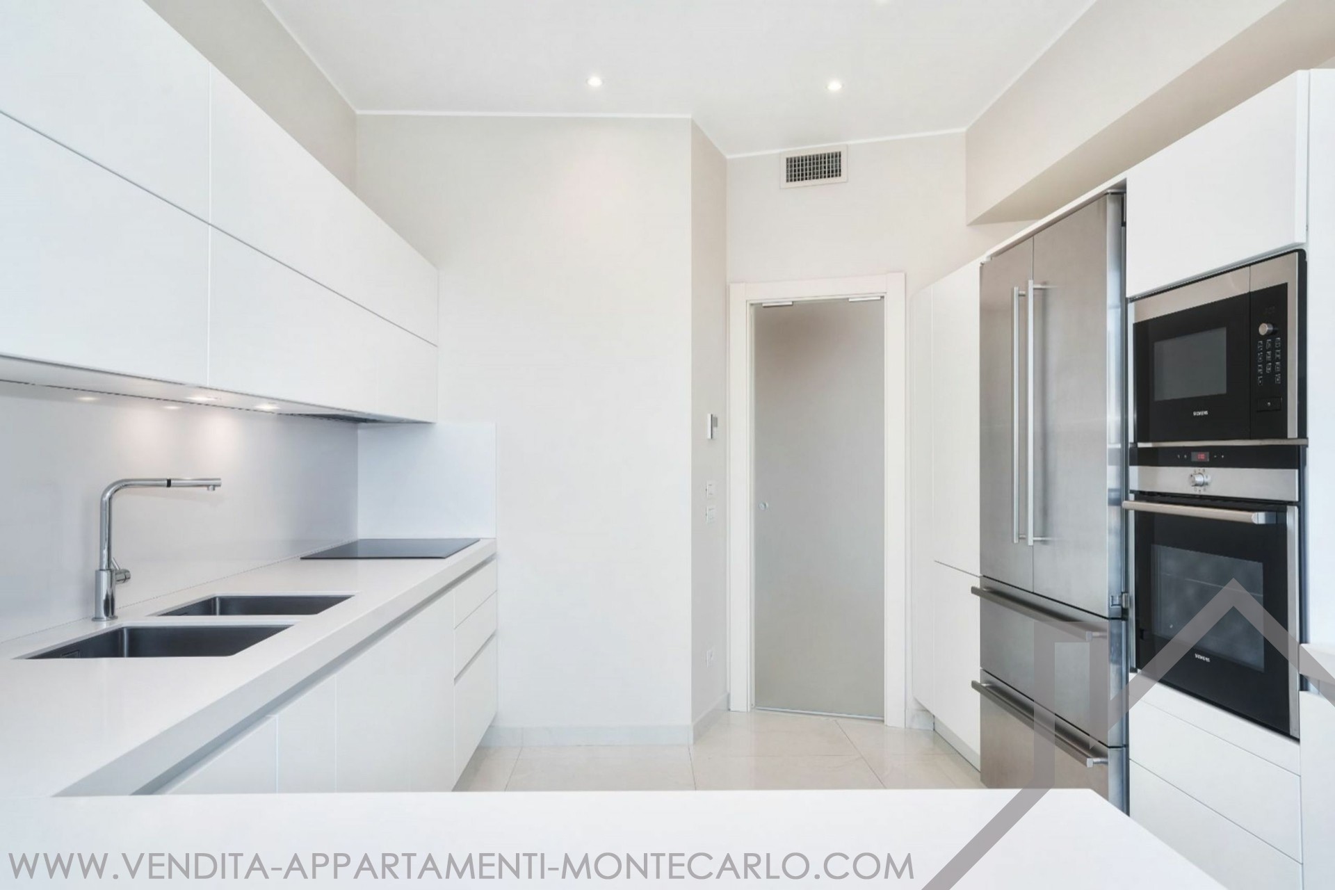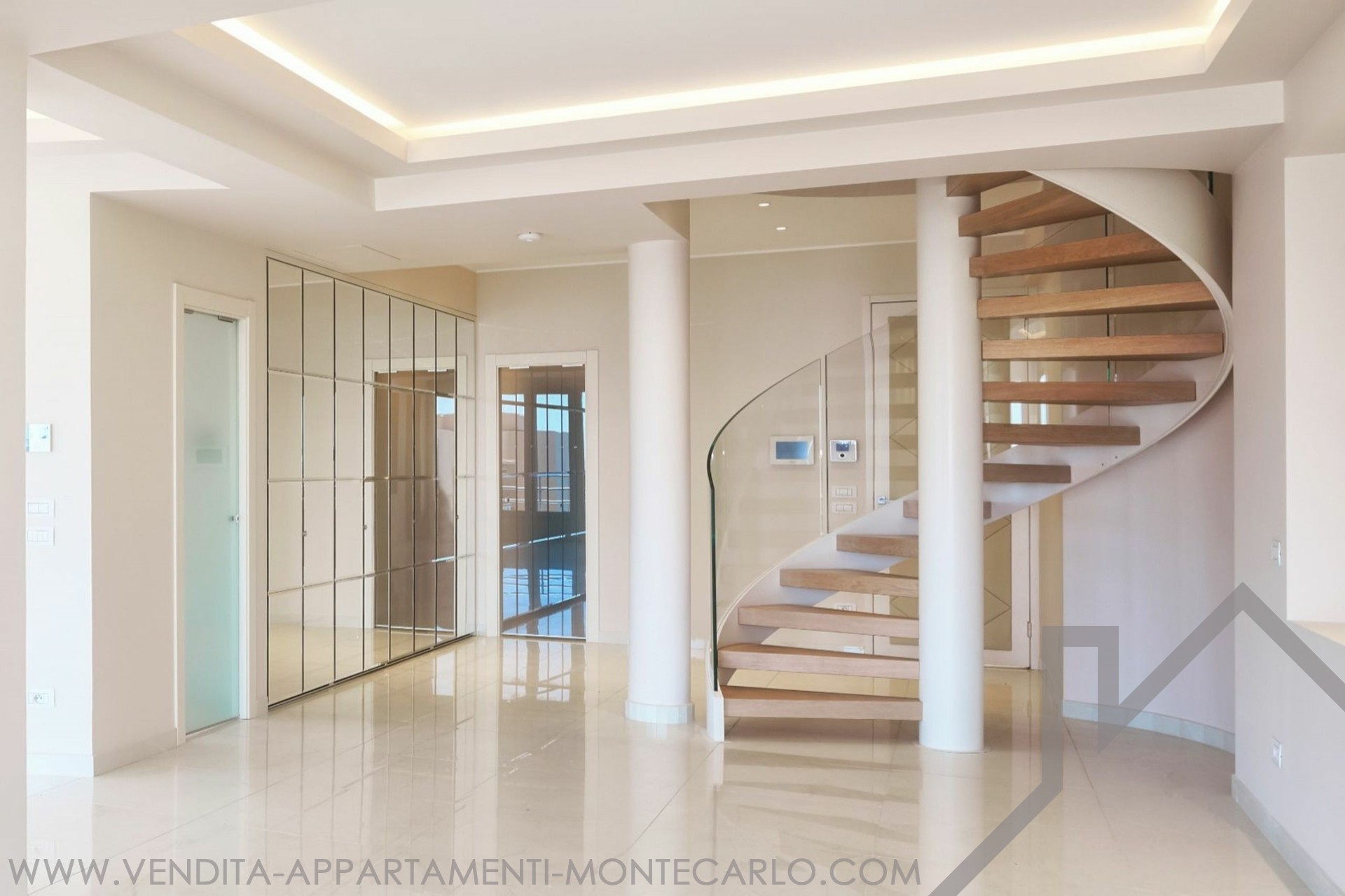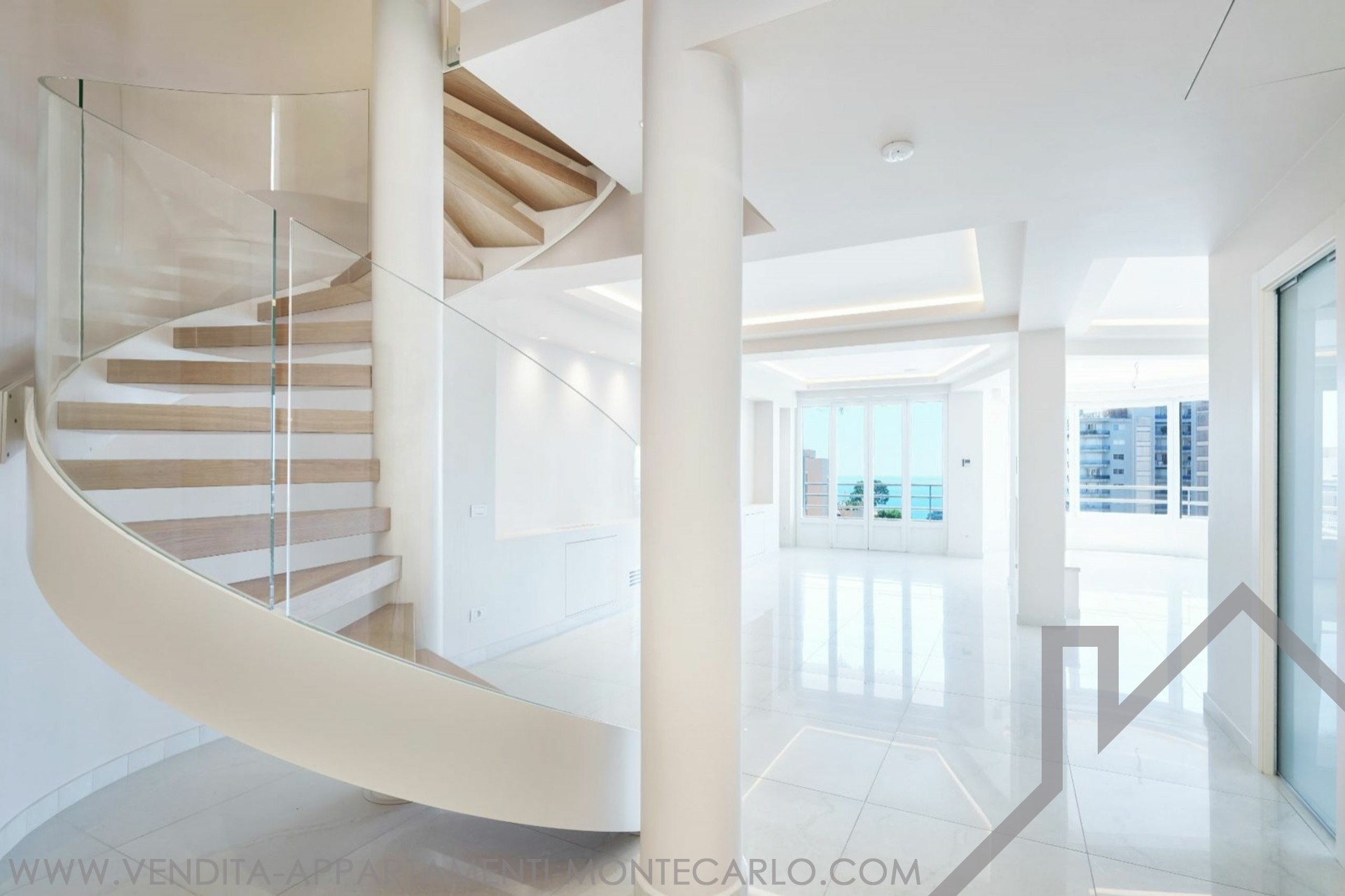 EXCLUSIVE Spacious Penthouse/Duplex with panoramic sea views and a large circular rooftop terrace: First level: entrance hall, guest toilet, double living/dining room, equipped kitchen, 2 bedrooms with en-suite bathrooms, 1 maid's room with shower, plenty of closets. 2 terraces. Upper level: 1 large bedroom, 1 bathroom with walk-in closet, an office. Garage for 3 cars, 1 cellar.