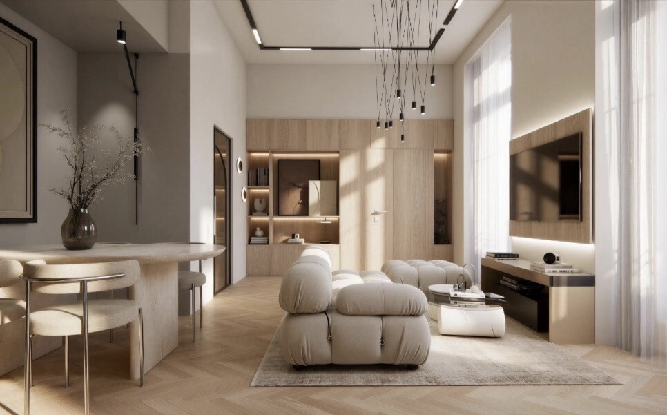 The living room, bathed in natural light, opens onto an elegant and perfectly integrated kitchen area, ideal for entertaining in a chic and friendly setting. The room, a real cocoon, invites you to relax with a warm and sophisticated atmosphere. A modern bathroom completes this set in style.
