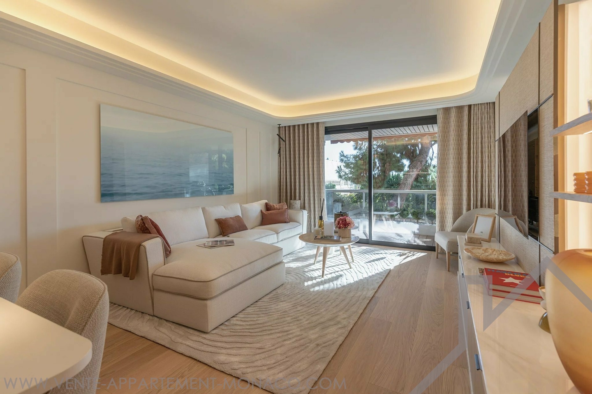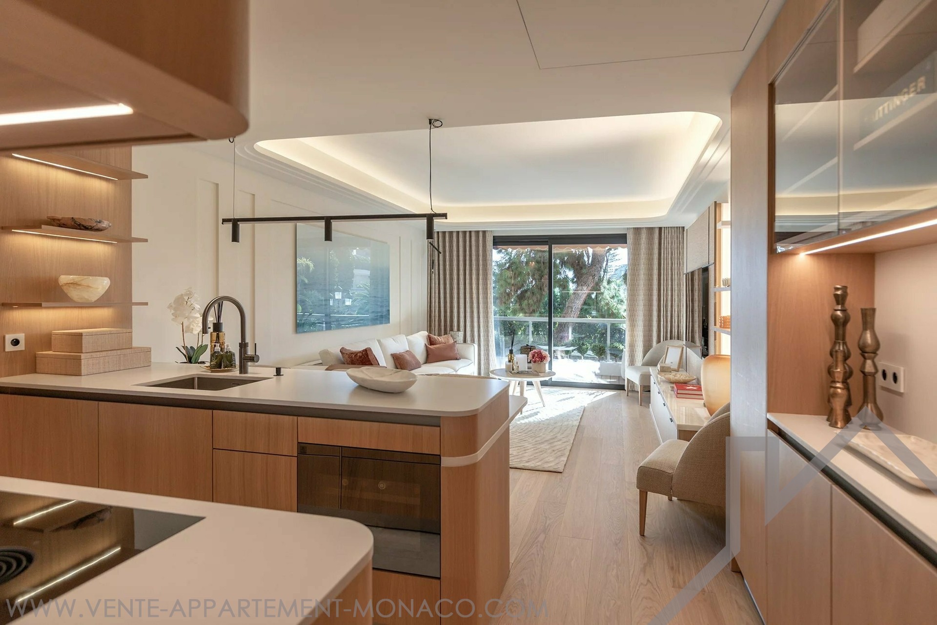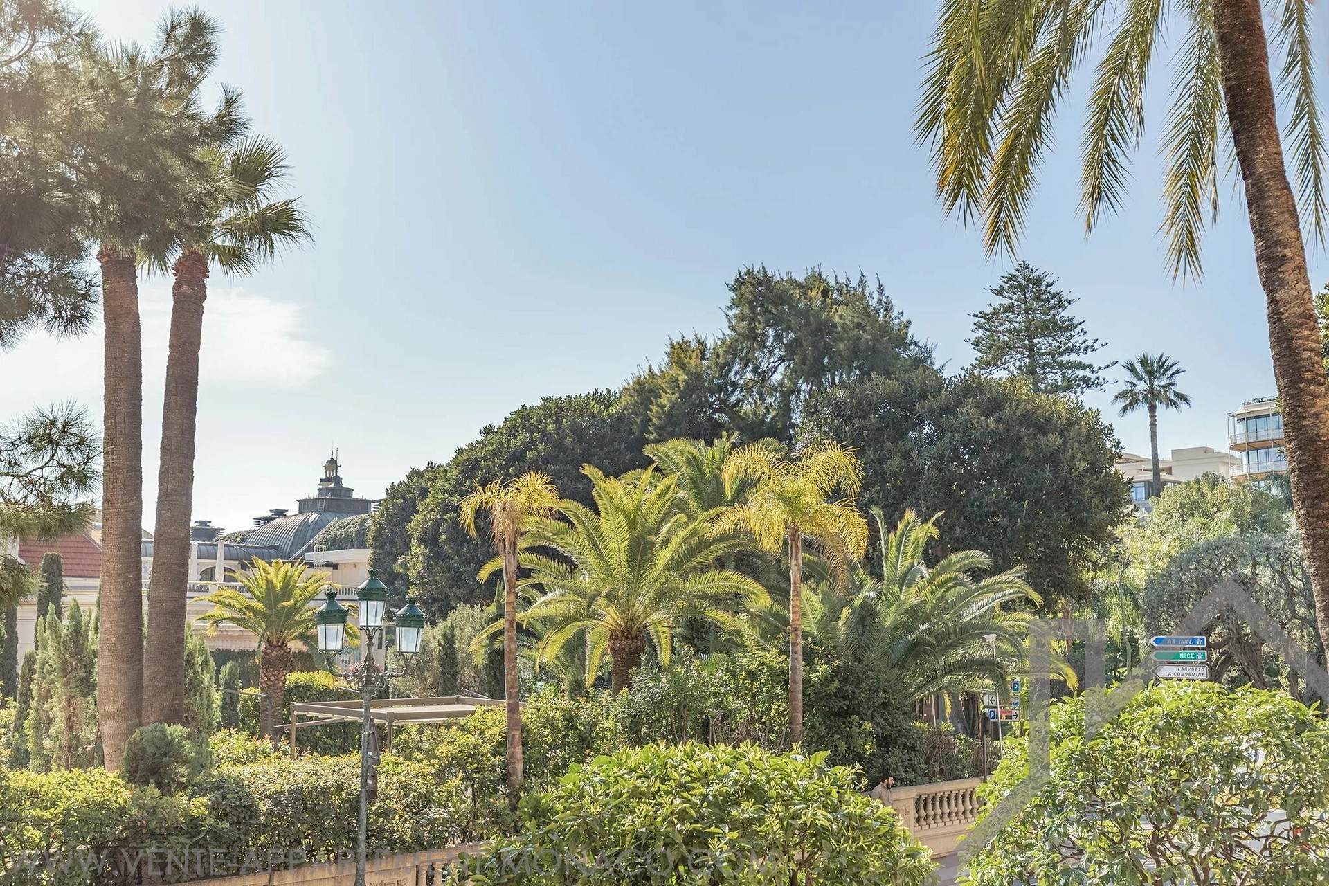 At the front, the living room and kitchen open onto a deep terrace with a view of the Casino de Monaco. The two bedrooms open onto a second, landscaped terrace.