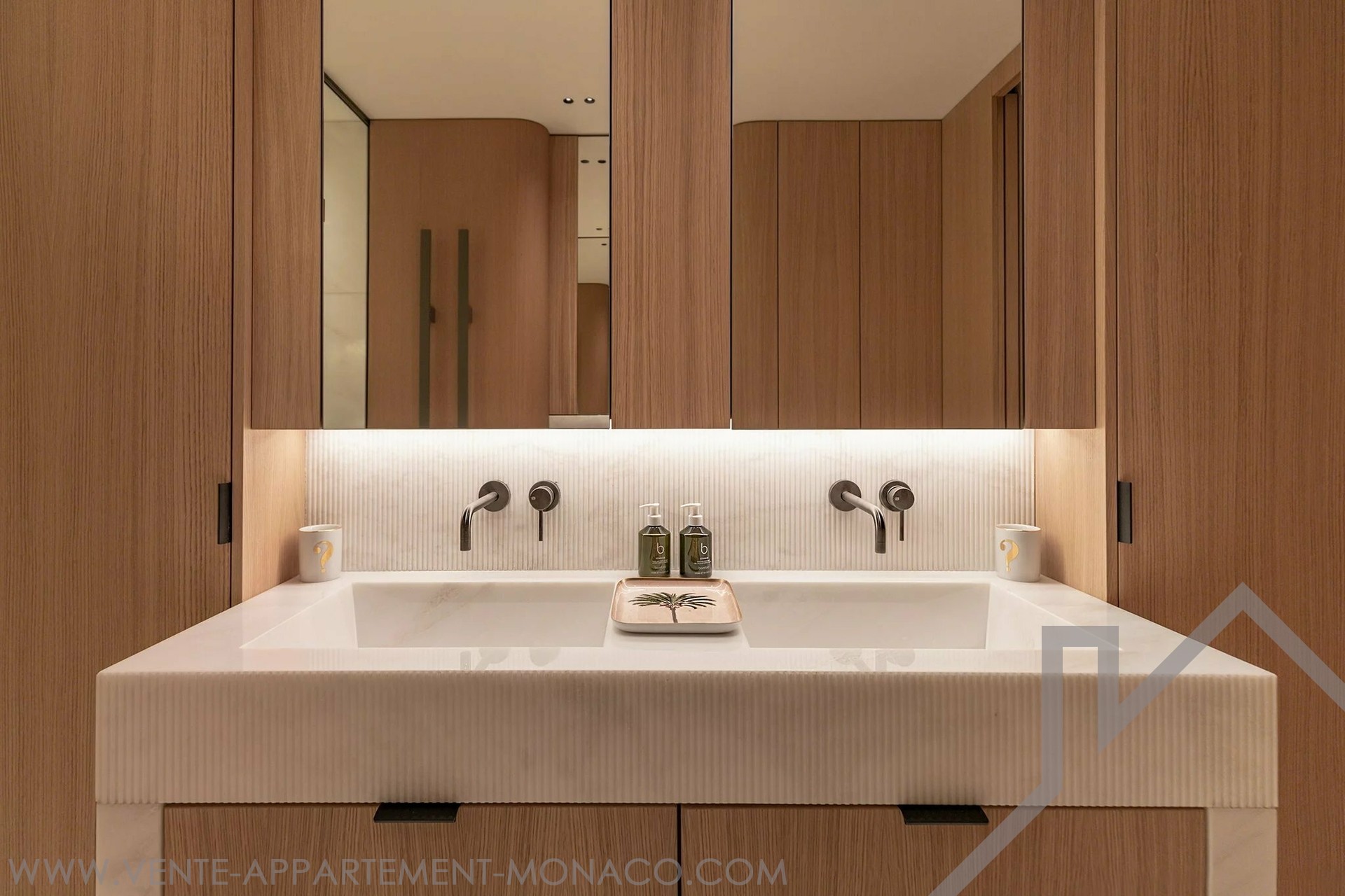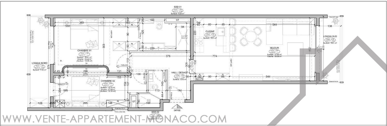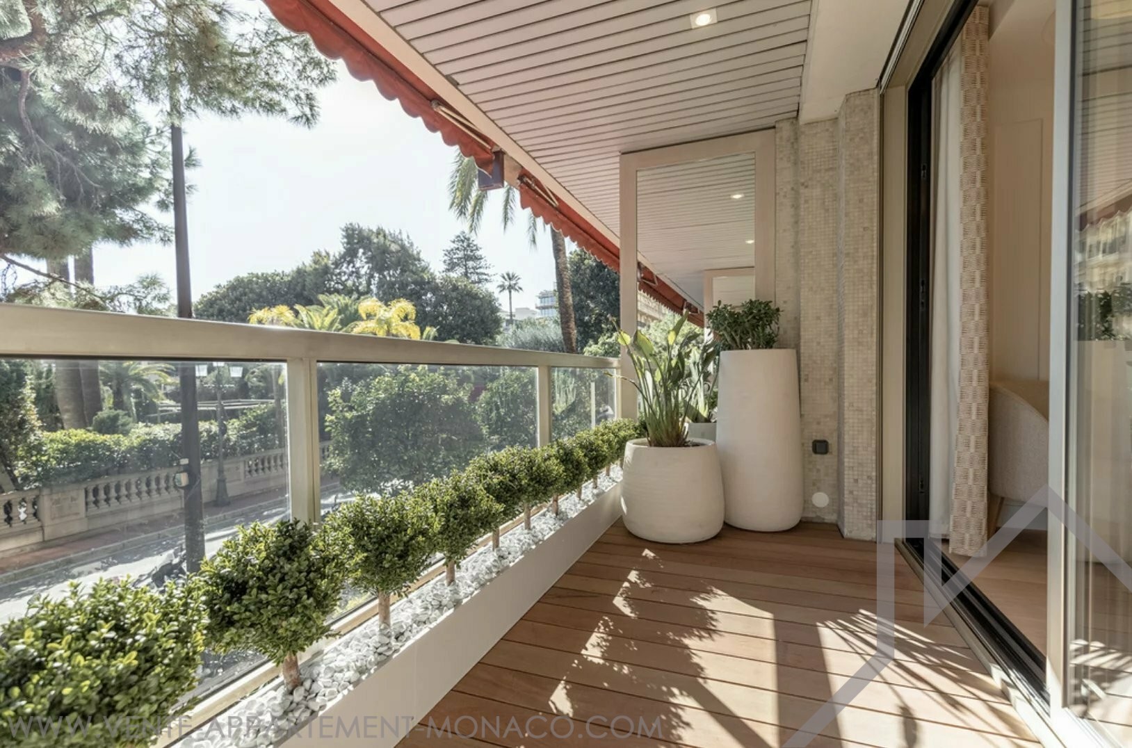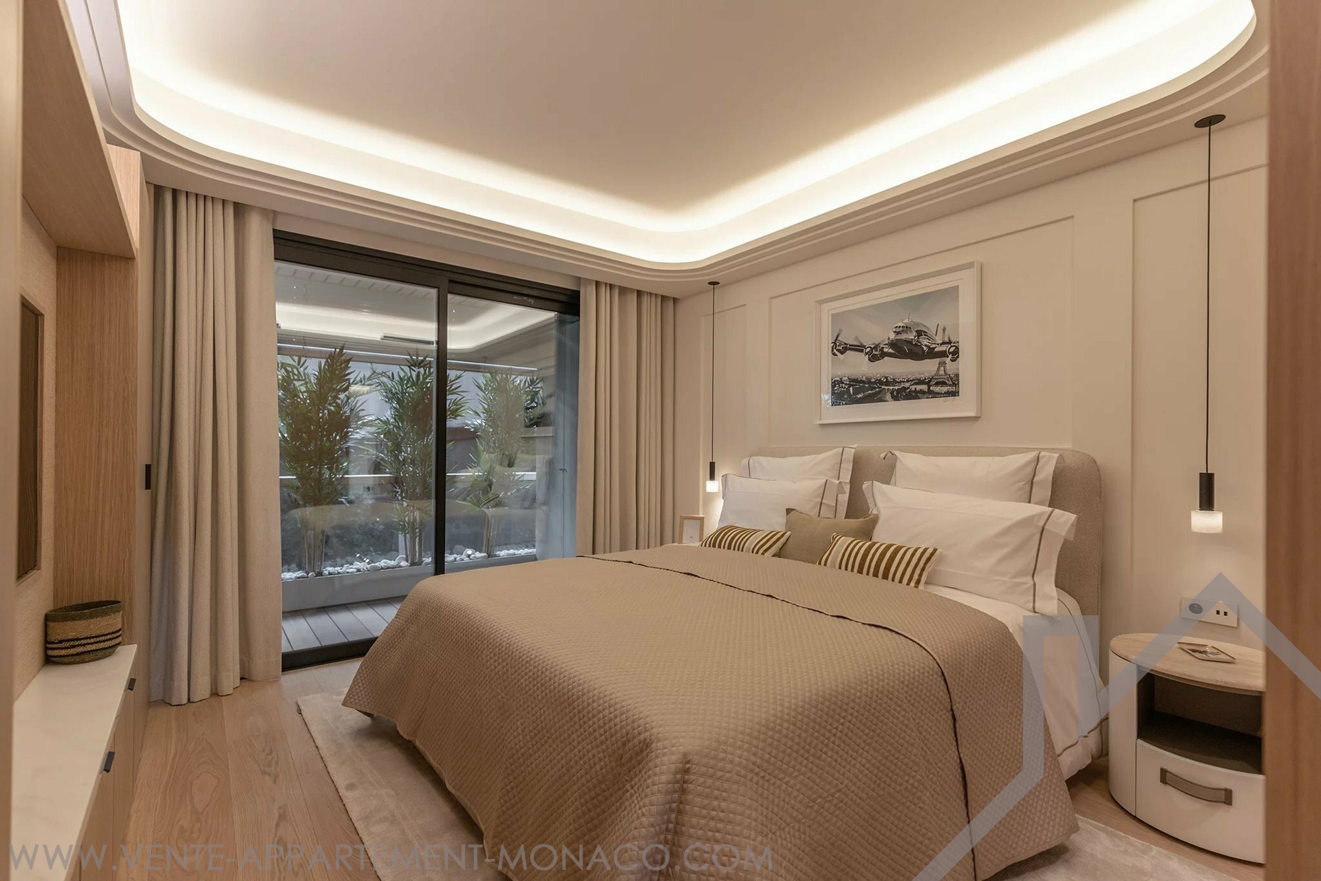At the front, the living room and kitchen open onto a deep terrace with a view of the Casino de Monaco. The two bedrooms open onto a second, landscaped terrace.