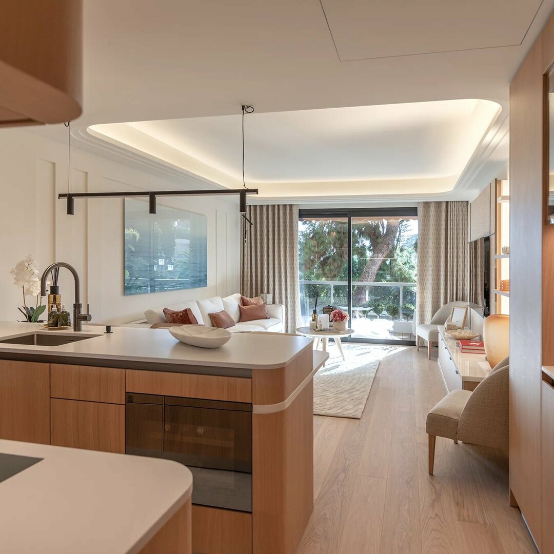 Upon entering, you will discover an elegant entrance hall that leads into a luxurious living room, featuring a Bulthaup American kitchen. The living room opens onto a landscaped terrace with a view of the Casino square. The refined furnishings are complemented by beautiful custom woodwork.