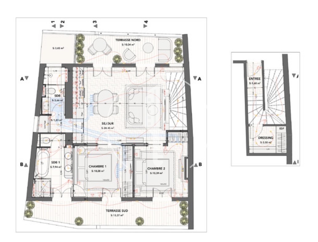 The sleeping area includes two bedrooms, each with its own bathroom or shower room, with access to two lovely terraces, including a veranda bringing a beautiful light to the whole.