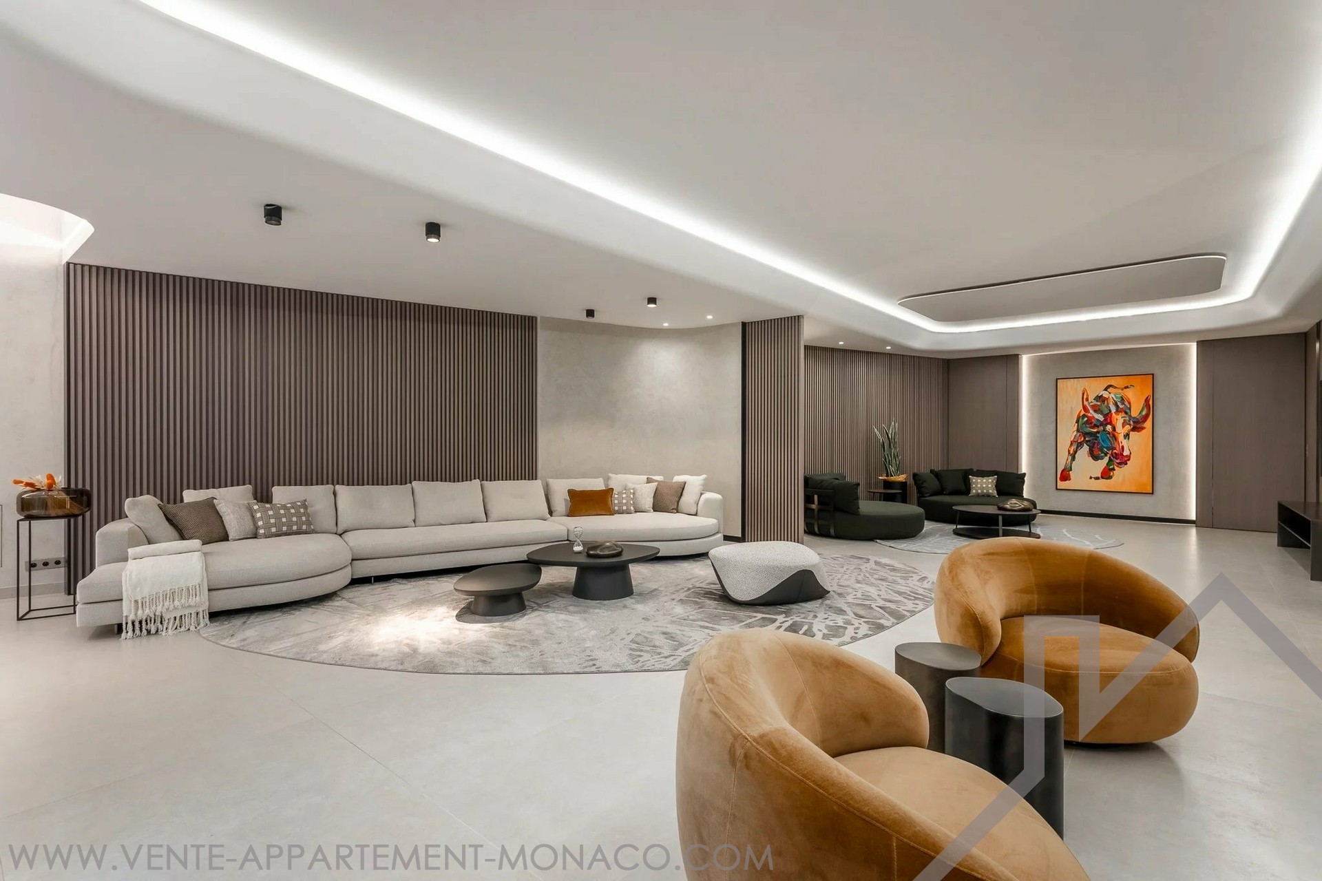 The main living space, with an area of around 300 m², boasts impressive volumes and high ceilings, creating a majestic yet intimate atmosphere. On this floor, you'll find a modern, fully-equipped open-plan kitchen, a patio adorned with a water wall, and a vast dining room. The villa also boasts two elegant lounges: one dedicated to the TV area and the other, warmer, with a fireplace. A superb private fitness area completes this exceptional offer.