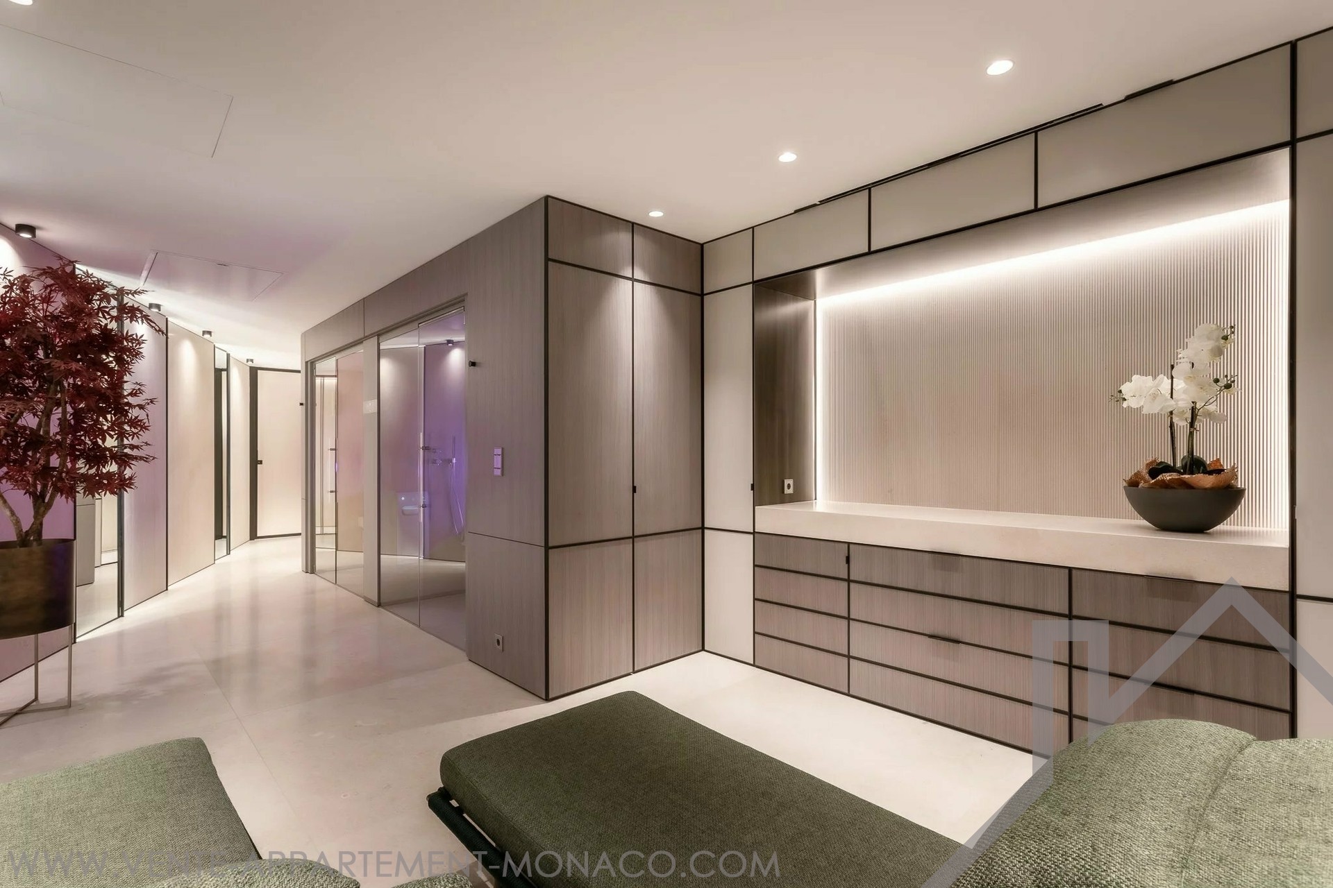 1st floor: master bedroom with dressing room and en suite bathroom, plus access to a fully equipped spa area with sauna, hammam and relaxation room. There's also a magnificent private office area.