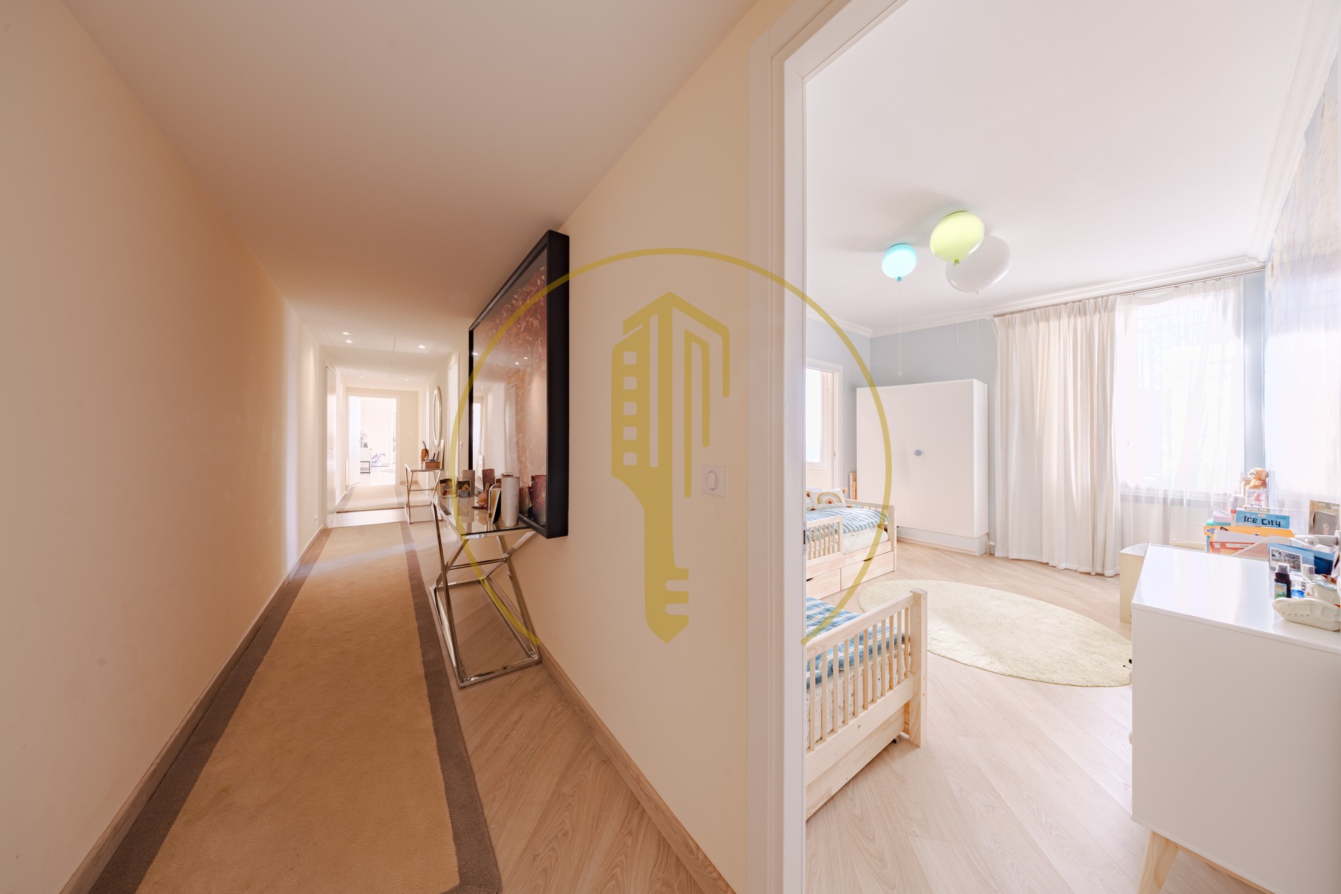 The sleeping area includes four bedrooms, each with its own en-suite bathroom or shower room, including a master suite with bathroom. A dressing room that can be converted into an additional bedroom as well as an additional room ideal for an office complete the layout.