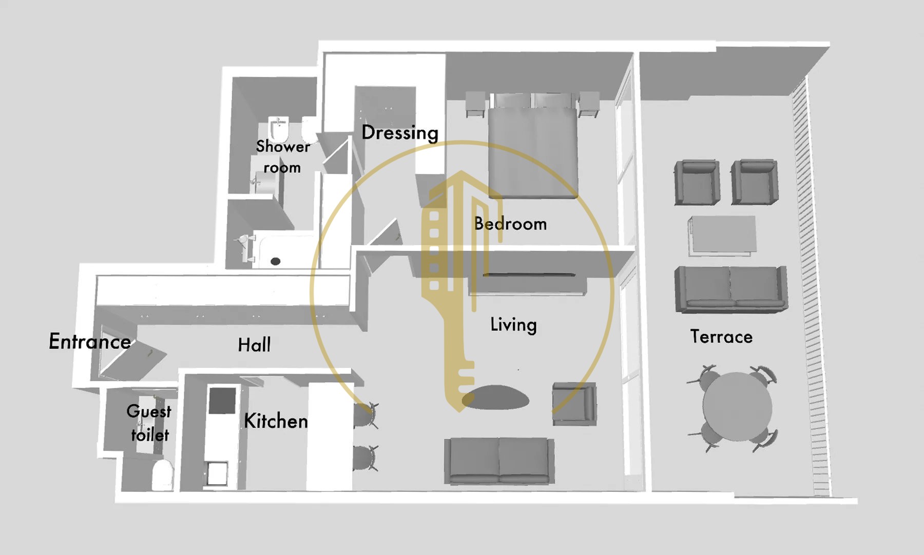 The marble floor adds a distinguished touch to the apartment. The fully-equipped open-plan kitchen features a white marble worktop and dining table with touches of gold.The living area and bedroom open onto a deep south-facing terrace with sea views.