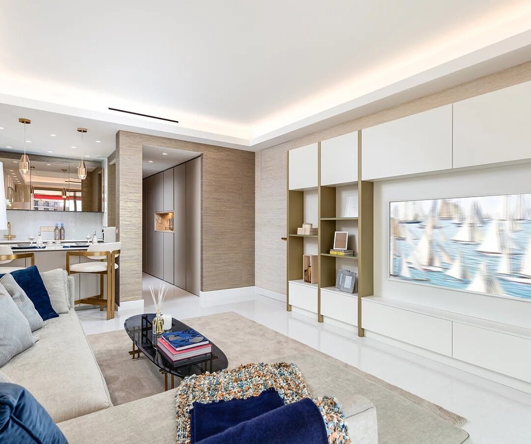 The entrance to this apartment immediately reveals the refinement of the product, and continues into the luminous living room, decorated and furnished with particular attention to detail.