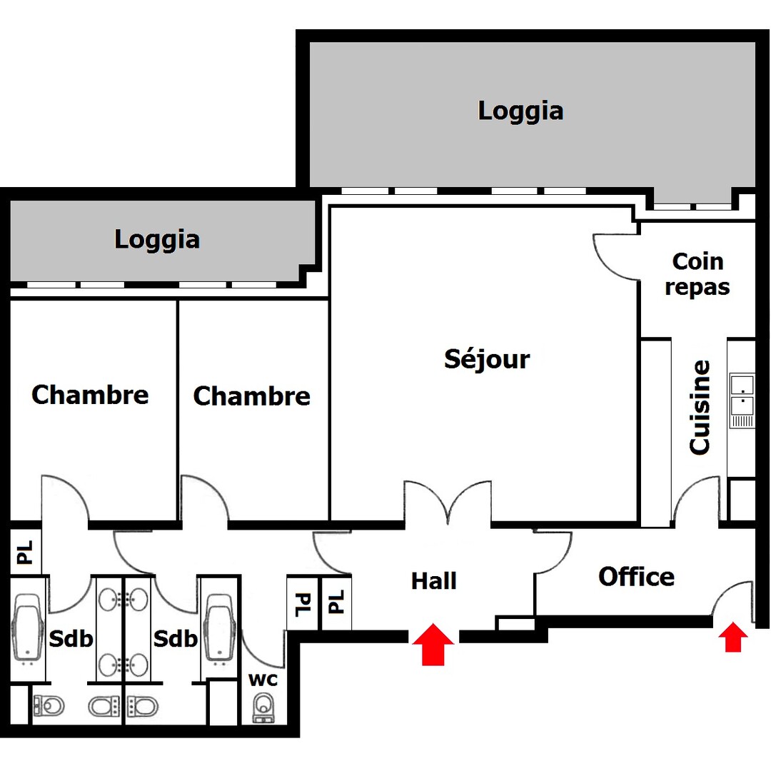 Entrance, kitchen equipped with dining area, pantry, living room, two bedrooms, two bathrooms, guest services, cupboards, loggias