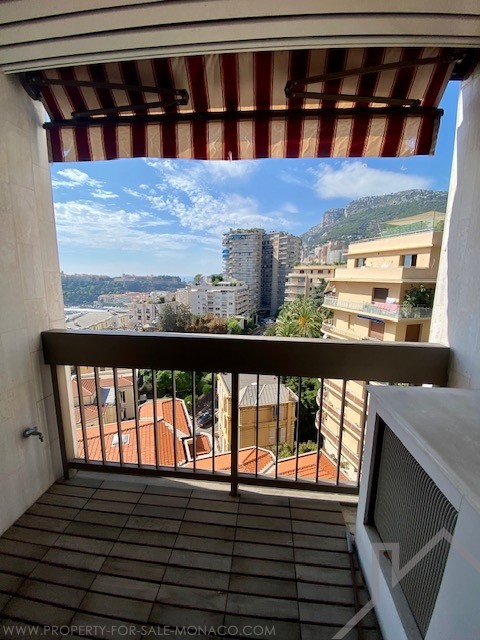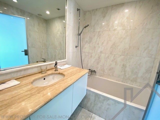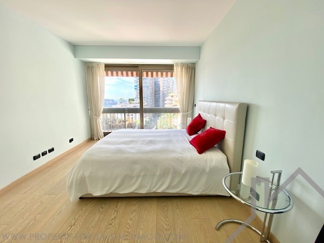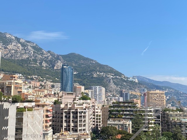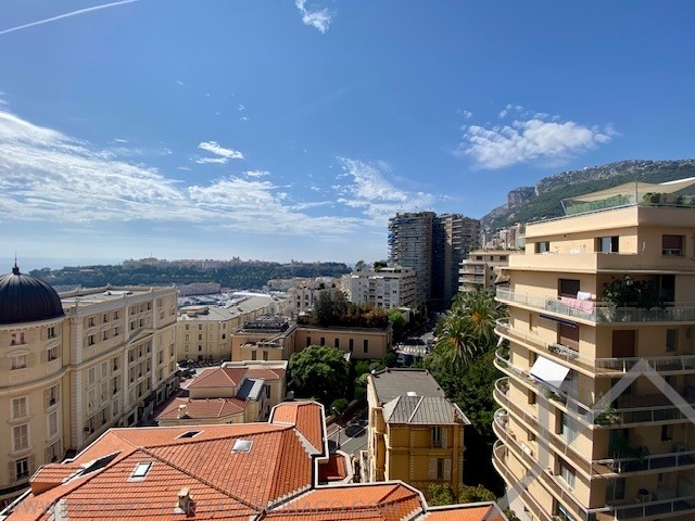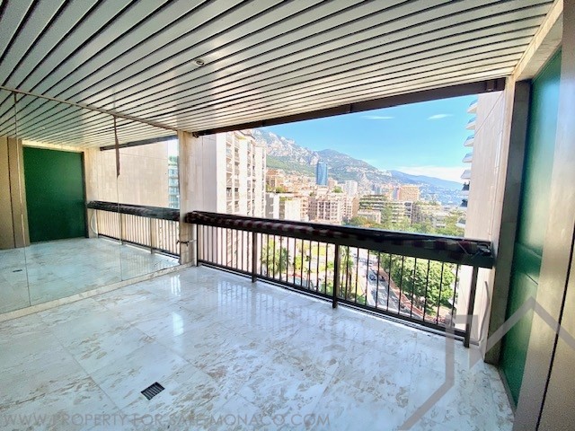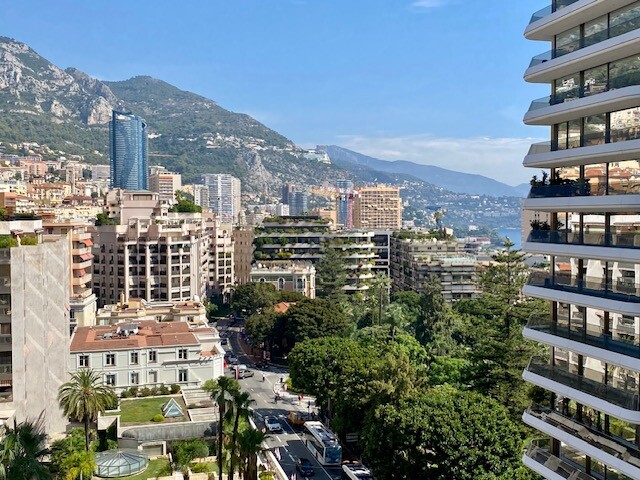 Floor-Through with double exposure, quiet (except during Grand Prix) and Sunny. Completely renovated by one of Monaco's leading decorators with high-end materials, air-con, marble floor. It consists of an entrance with cupboards, large living room with fitted kitchen opening onto large terrace on the garden side of the Casino, guest toilet, bedroom with dressing room and bathroom en suite, a spare bedroom with loggia and shower room, with both bedrooms overlooking west with wide view of the Old Town, mountains, and the Mediterranean. Large basement store-room and double parking included.
