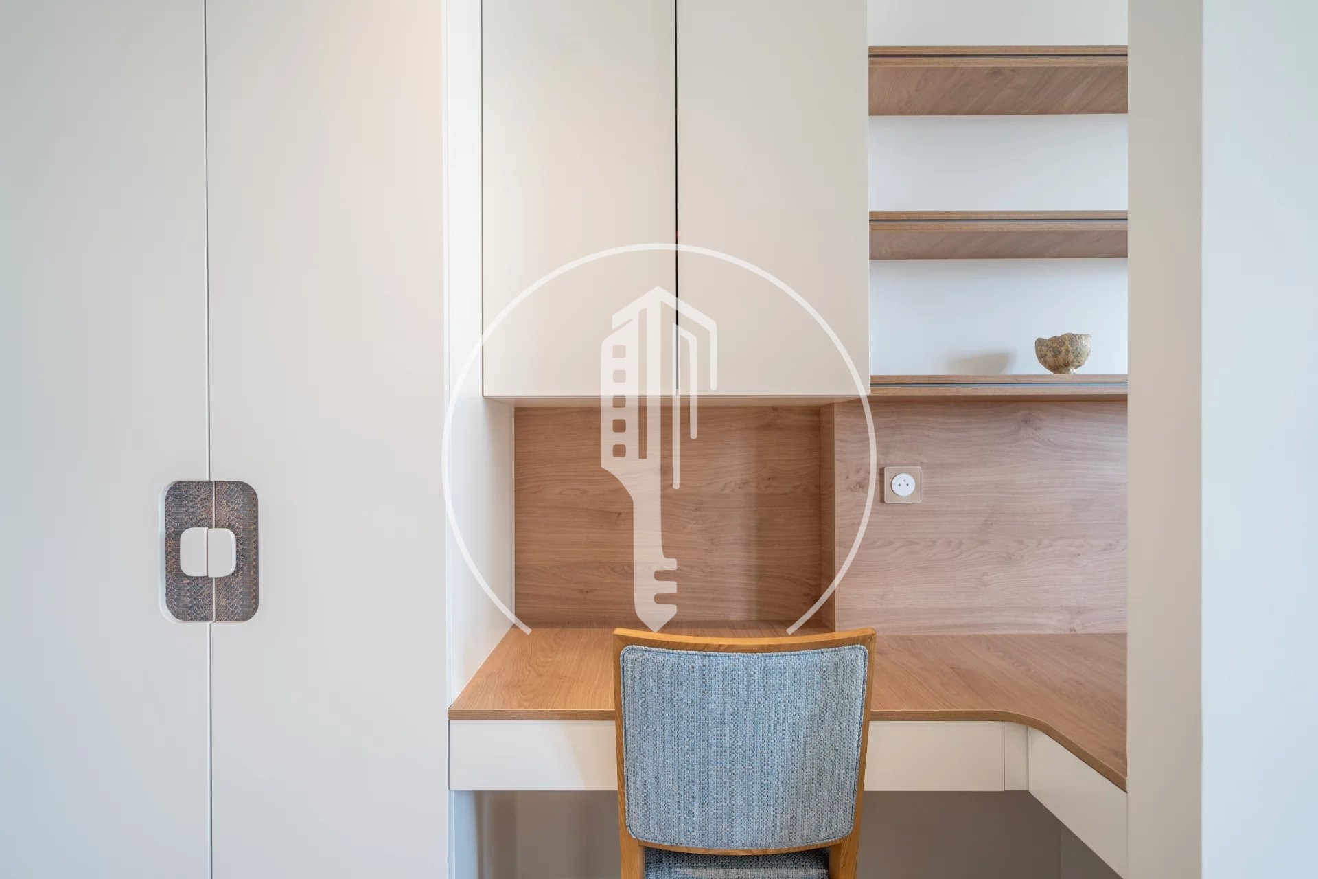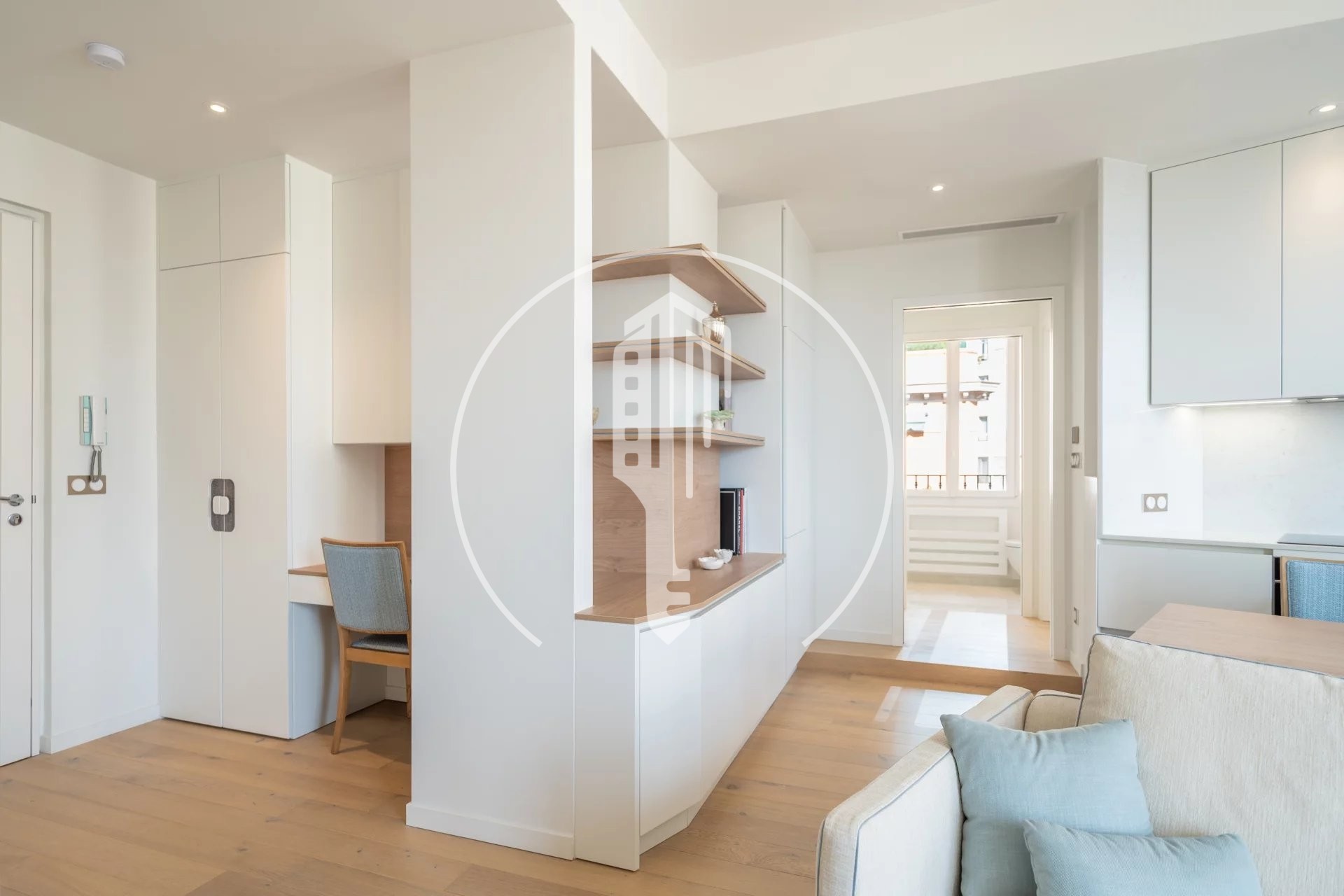 It is composed of an entrance hall with a study area, a living room with a balcony and a fitted kitchen, a bedroom with closets, a shower room and a laundry space.