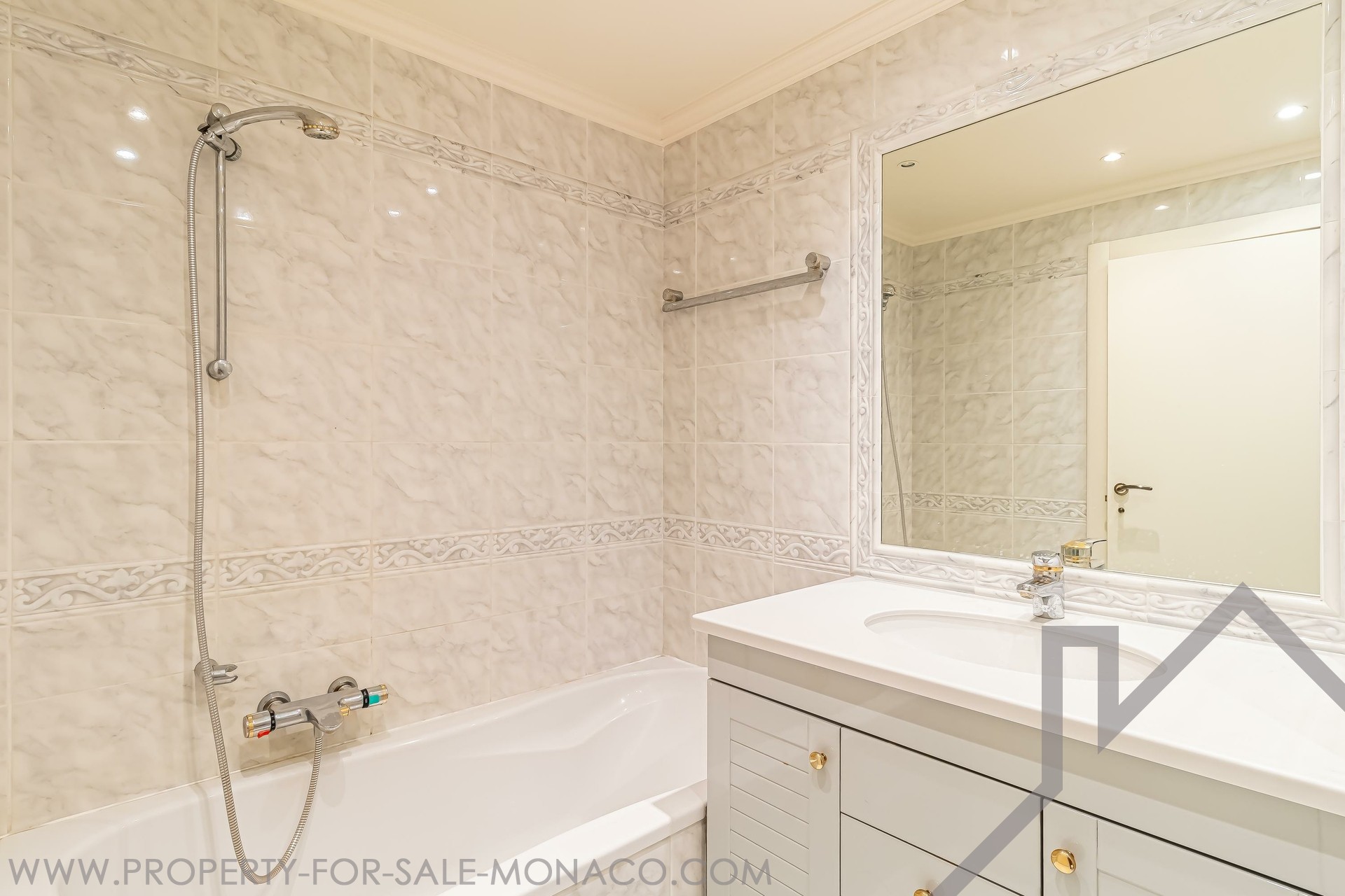 Offering excellent renovation potential, the apartment features an entrance hall, a fitted kitchen, a double living room, two bedrooms each with its own bathroom and a guest toilet. Each room opens onto a wrap-around terrace.