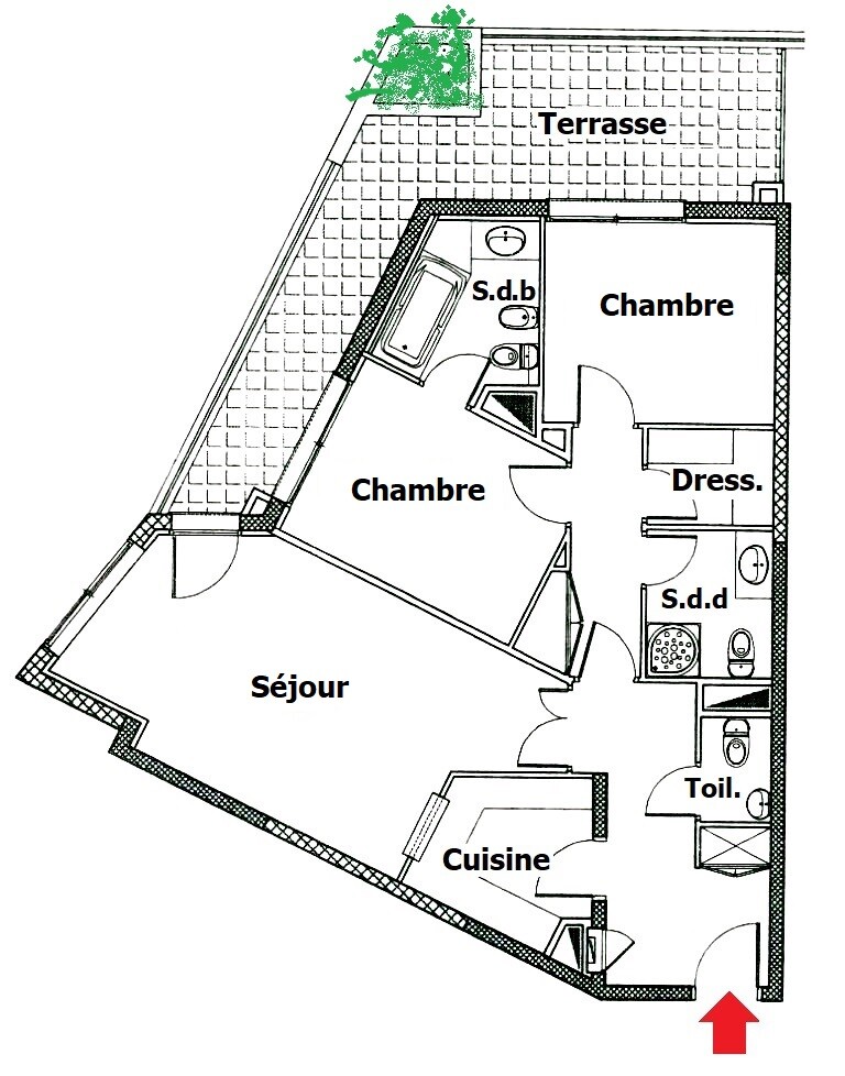 Entrance with cupboard, fully equipped kitchen, living room, 2 bedrooms, bathroom, shower room, guest toilet, dressing room, large terrace