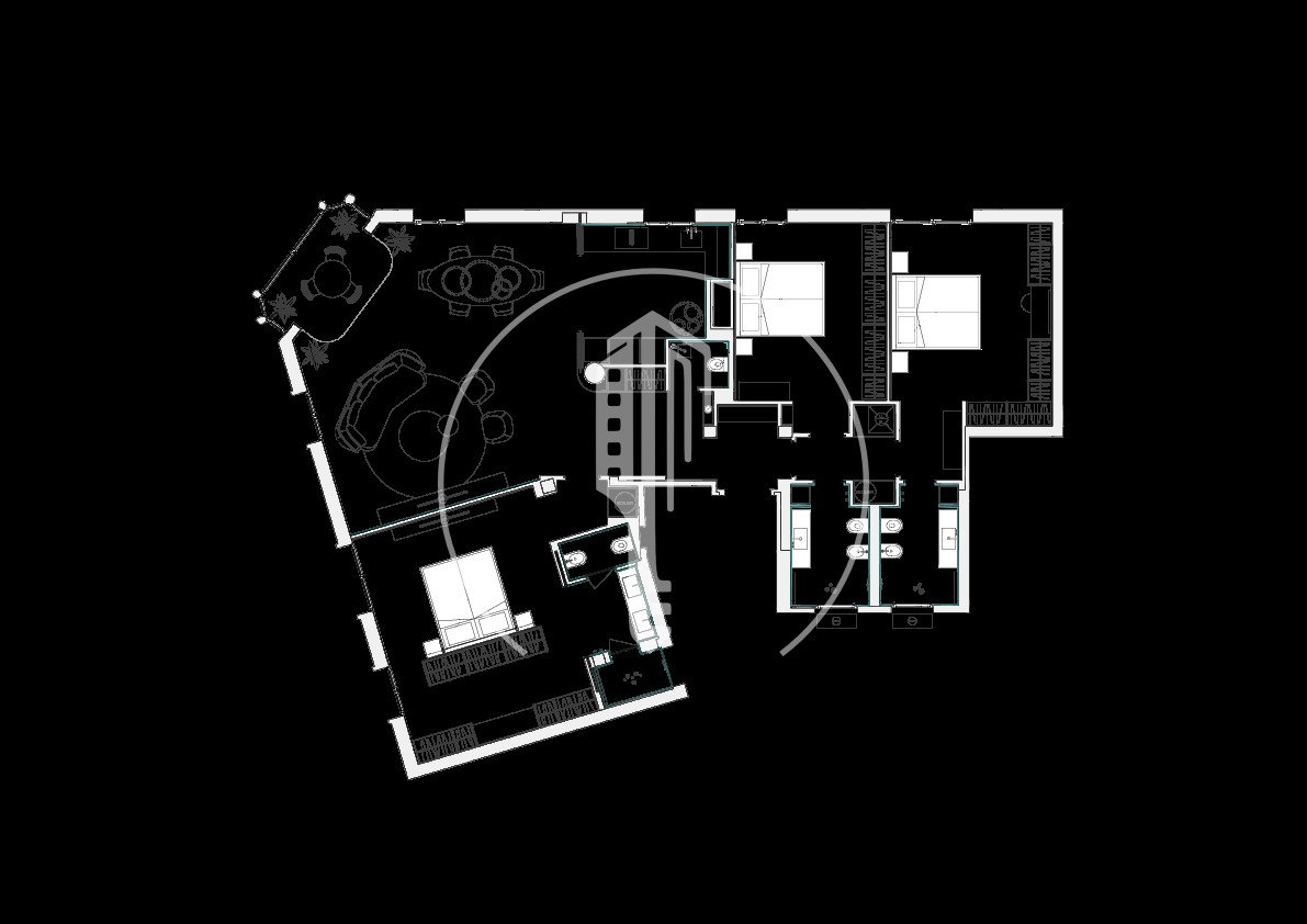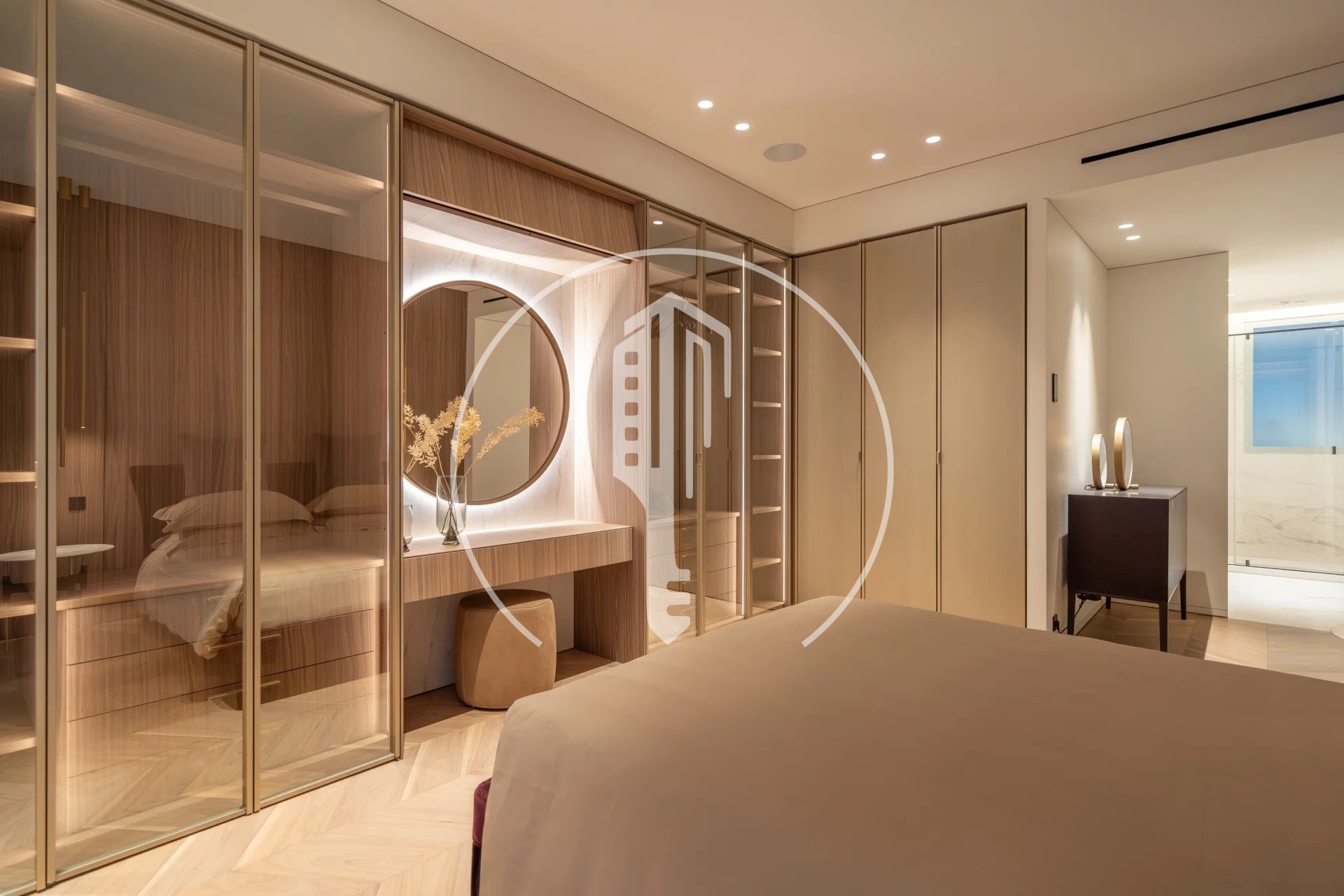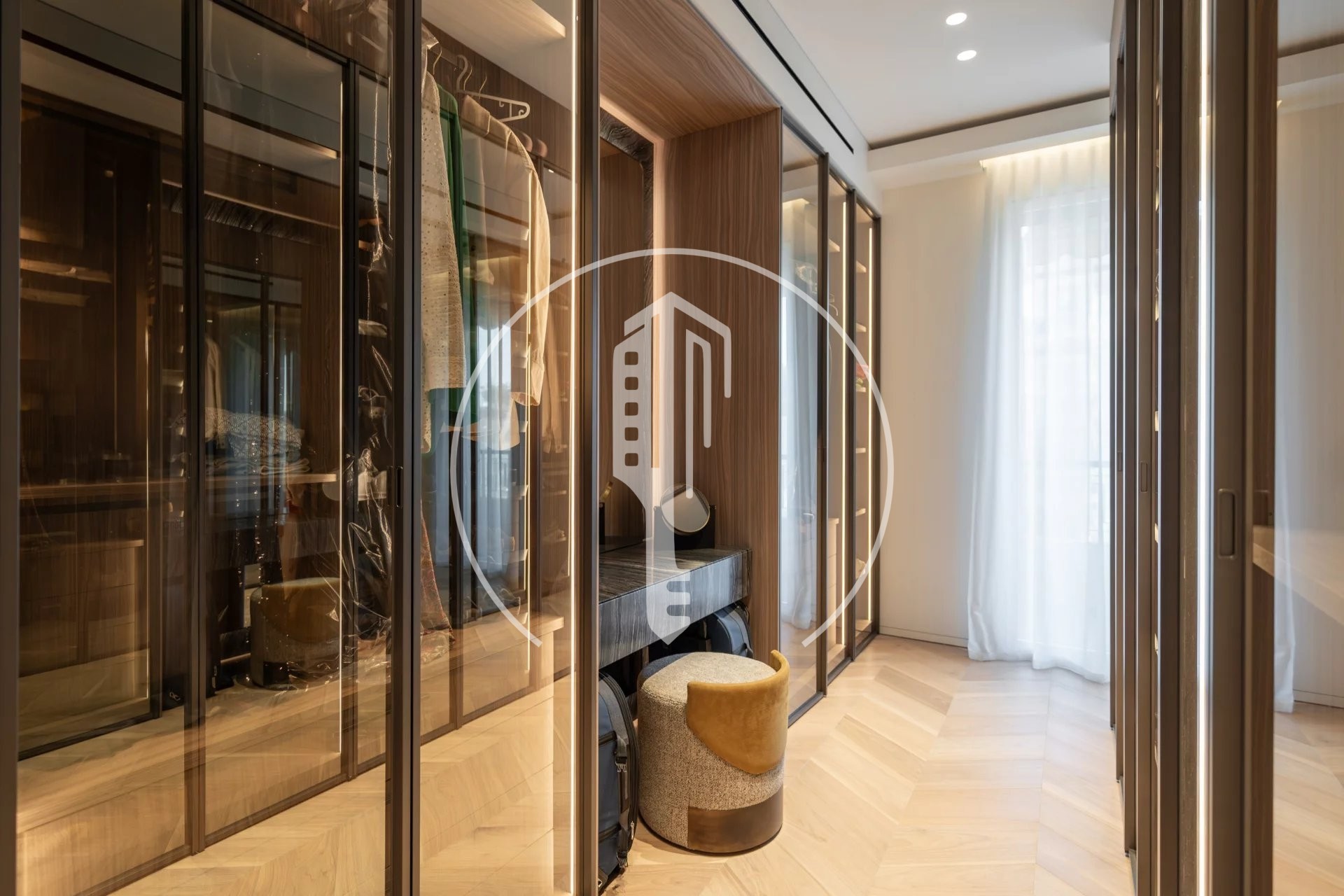 It is composed of an entrance hall, a bright living room with a balcony and a pleasant view of the Casino gardens, a semi-open and fully equipped kitchen, a master bedroom with a shower room and a large dressing room, two bedrooms each with their own dressing rooms and shower rooms, a guest toilet.
