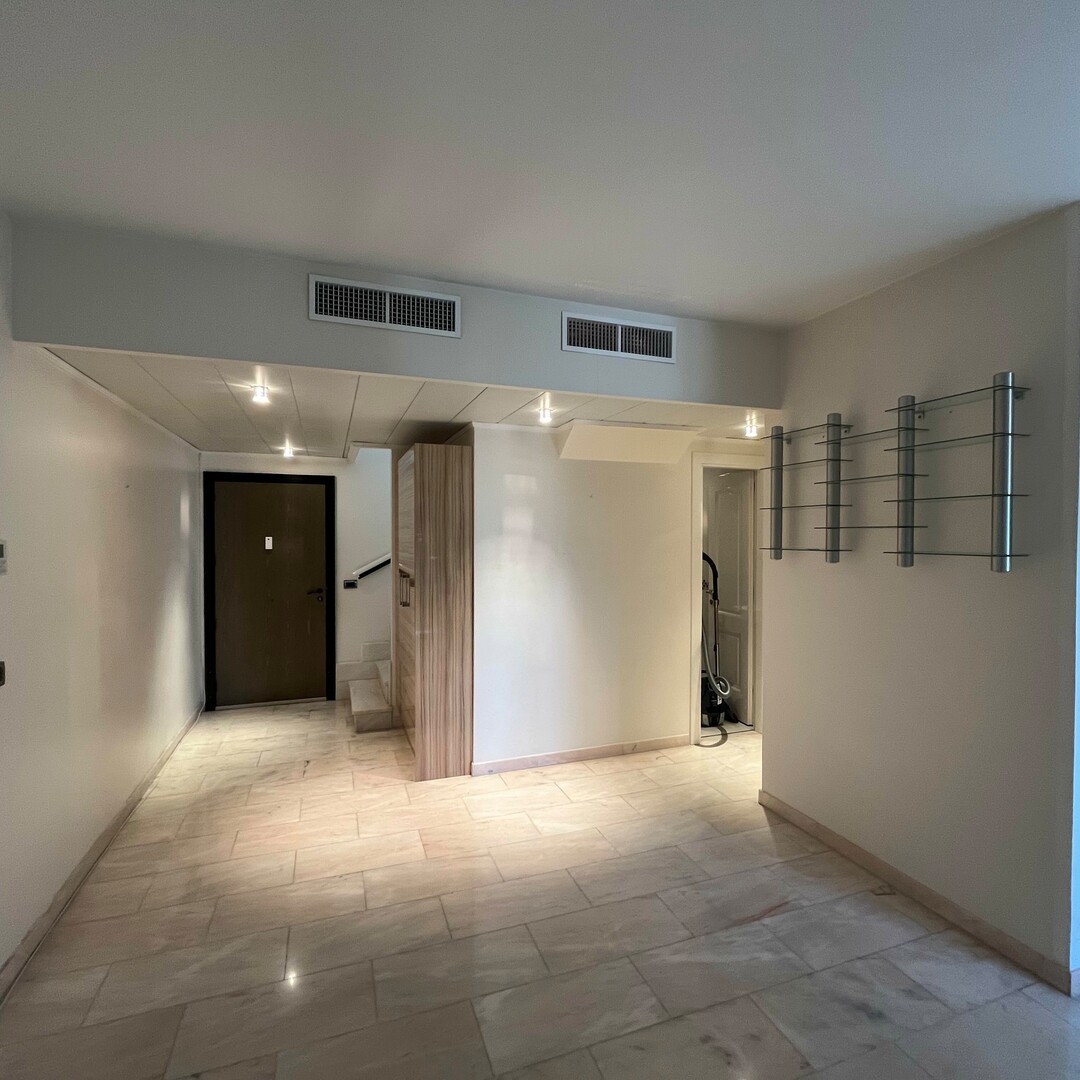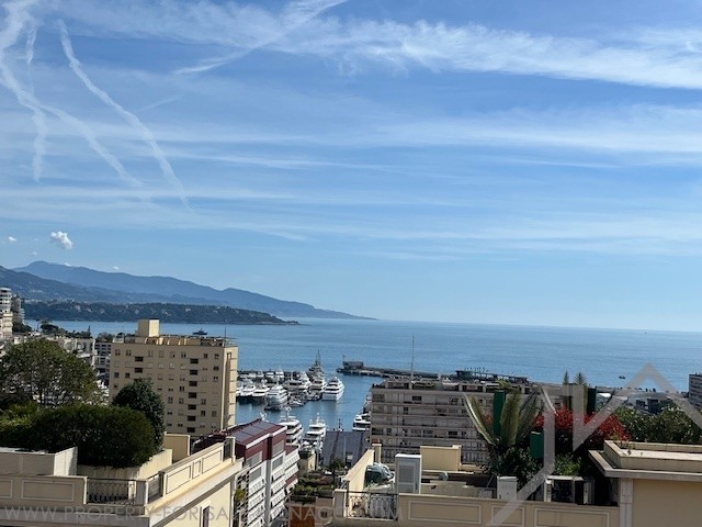 A refined staircase leads to the upper floor, the building's top floor where you will find a master bedroom with an en-suite bathroom and a large bay window opening onto a vast terrace. Enjoy breathtaking views of the sea, the Rock, and Roquebrune. A second bright bedroom, also with an en-suite bathroom, is dual-aspect with a window offering a sea view and a French door leading to a small balcony at the rear. The volumes of the bedrooms are particularly remarkable, thanks to generous ceiling heights, providing a sense of space and natural light.