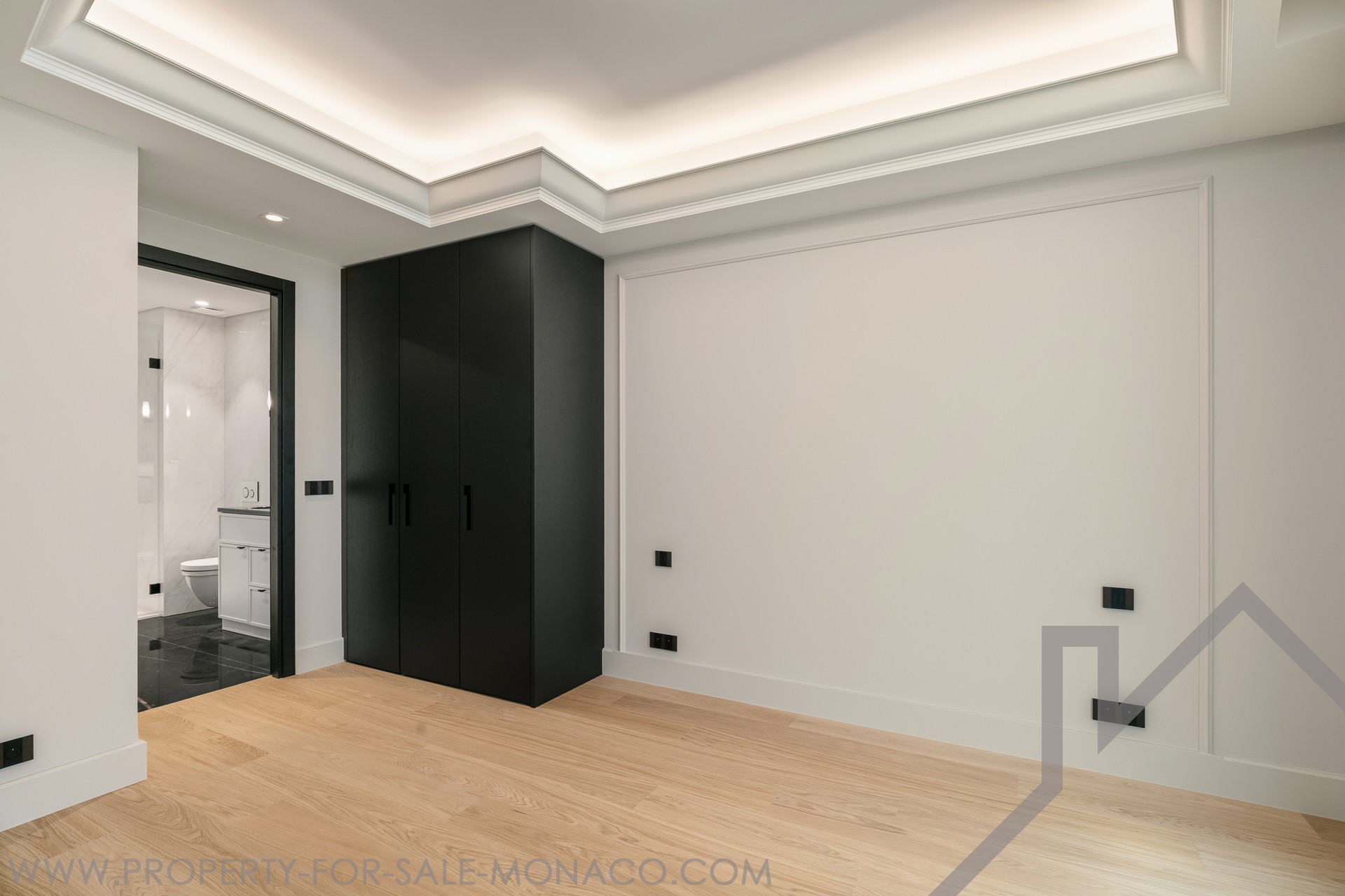 The bedroom has a fitted closet with interior lighting, parquet flooring, a molded headboard and a shower room with double basins.