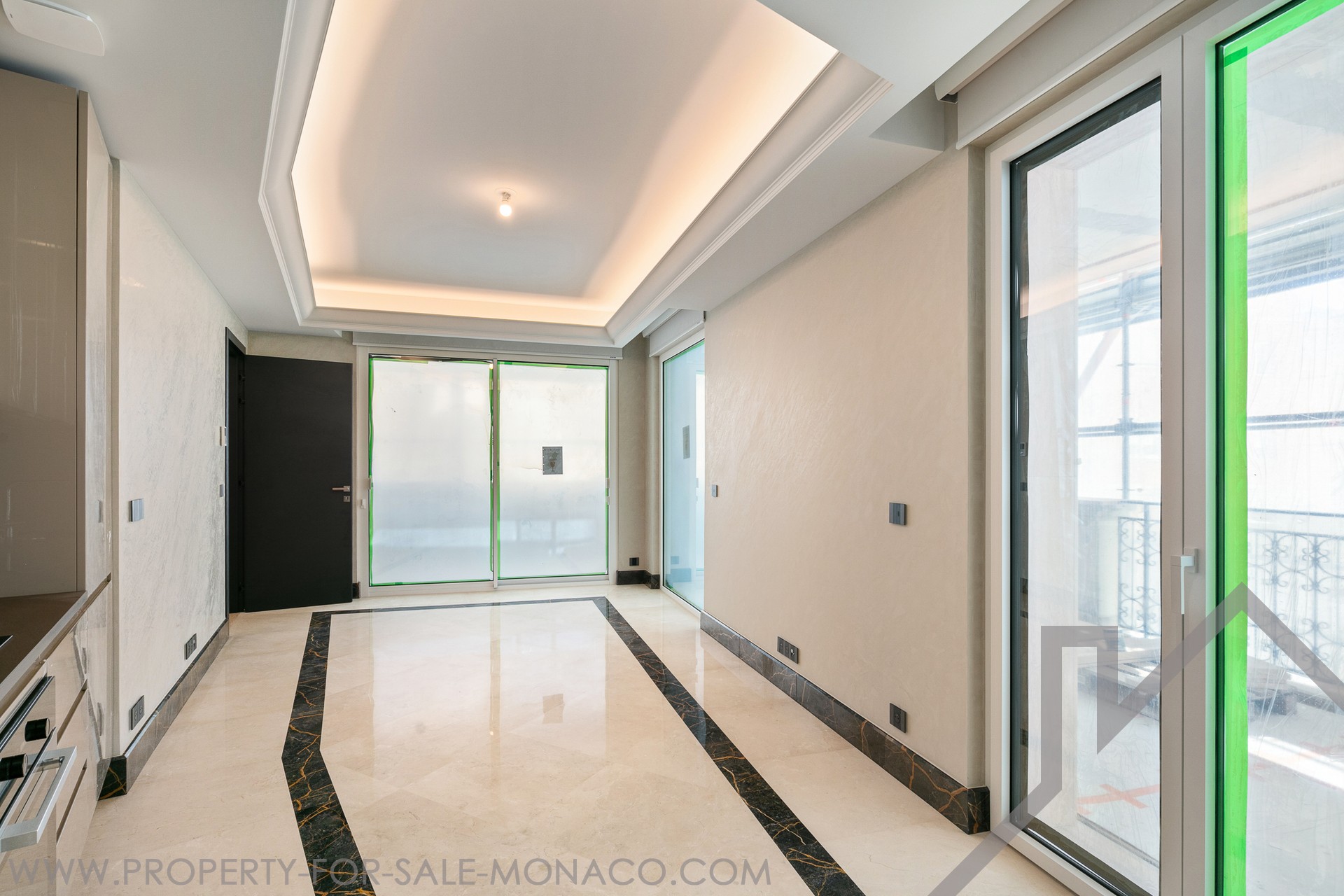The bright living room features two different marble floors, stucco walls and a backlit cornice ceiling.