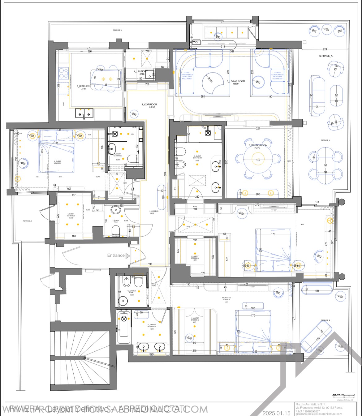 - Three bedrooms, each with a private bathroom, a dressing room, and outdoor access.