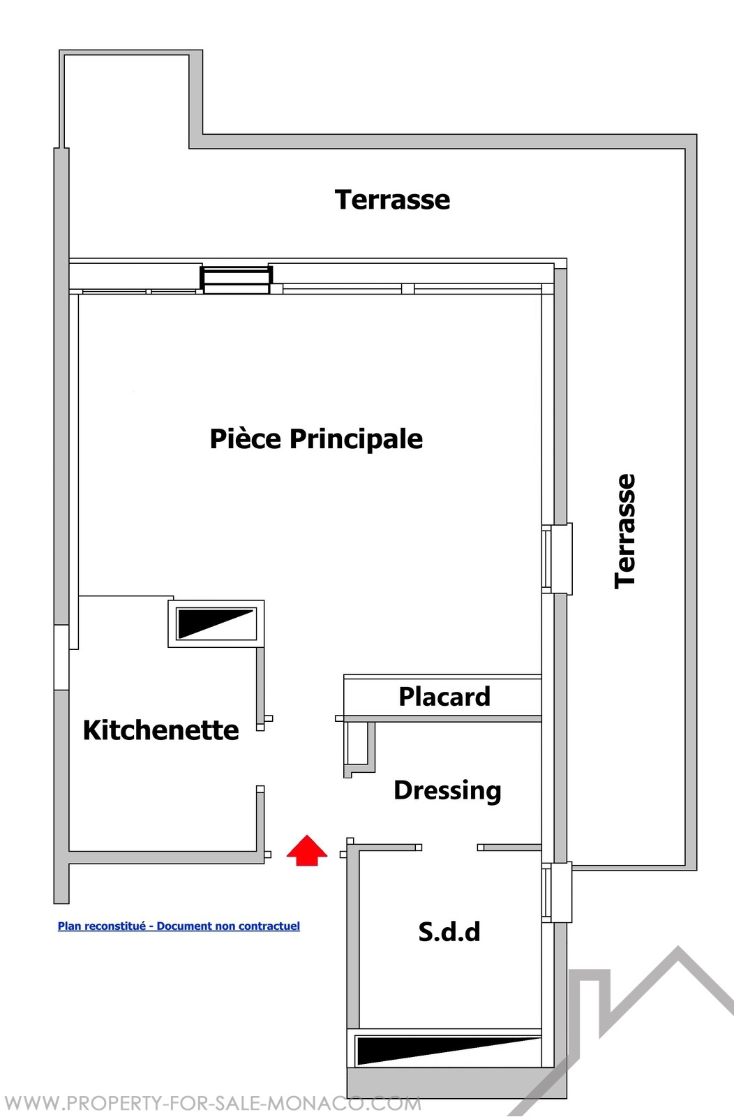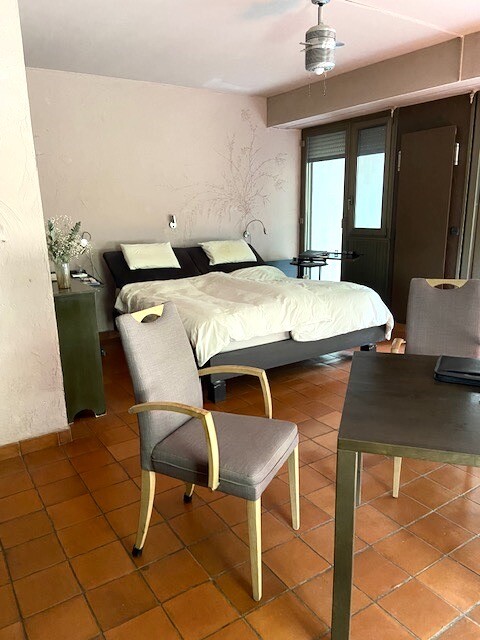 Entrance, equipped kitchenette, main room with cupboard, dressing, shower room, air conditioning, double glazing, circular terrace in freehold