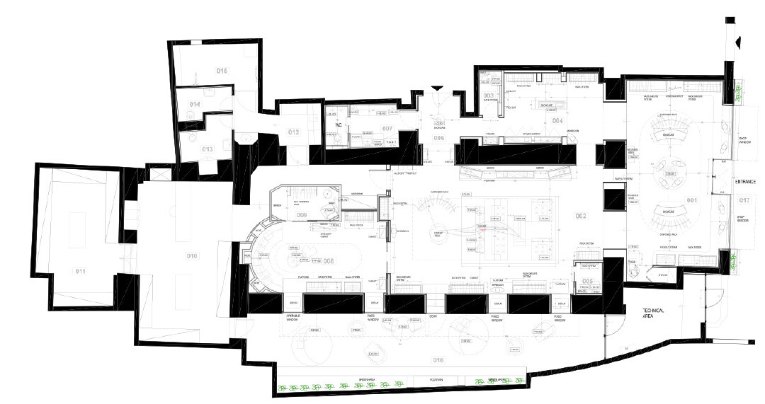 - an entrance, a large lounge, a VIP lounge, a small lounge with its fitting room, 1 powder room, a men's and women's toilet, a kitchen area, an office, a workshop, a storage space and a private terrace