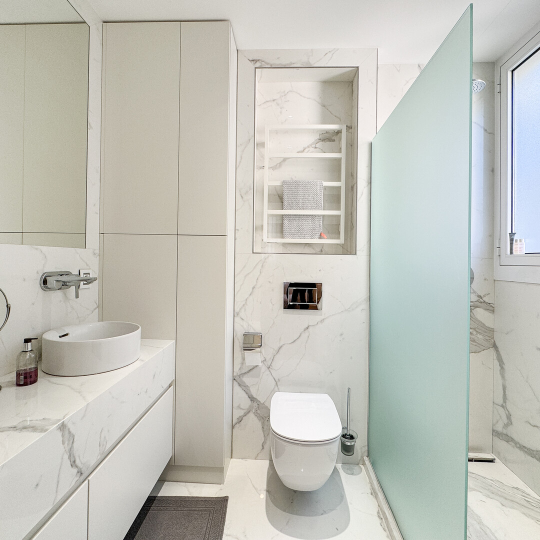 The kitchen, fully equipped and furnished, will seduce you with its functionality and contemporary style. The marble bathroom, with its double washbasin, embodies elegance and comfort. The entire apartment is air-conditioned for optimum comfort in all seasons.