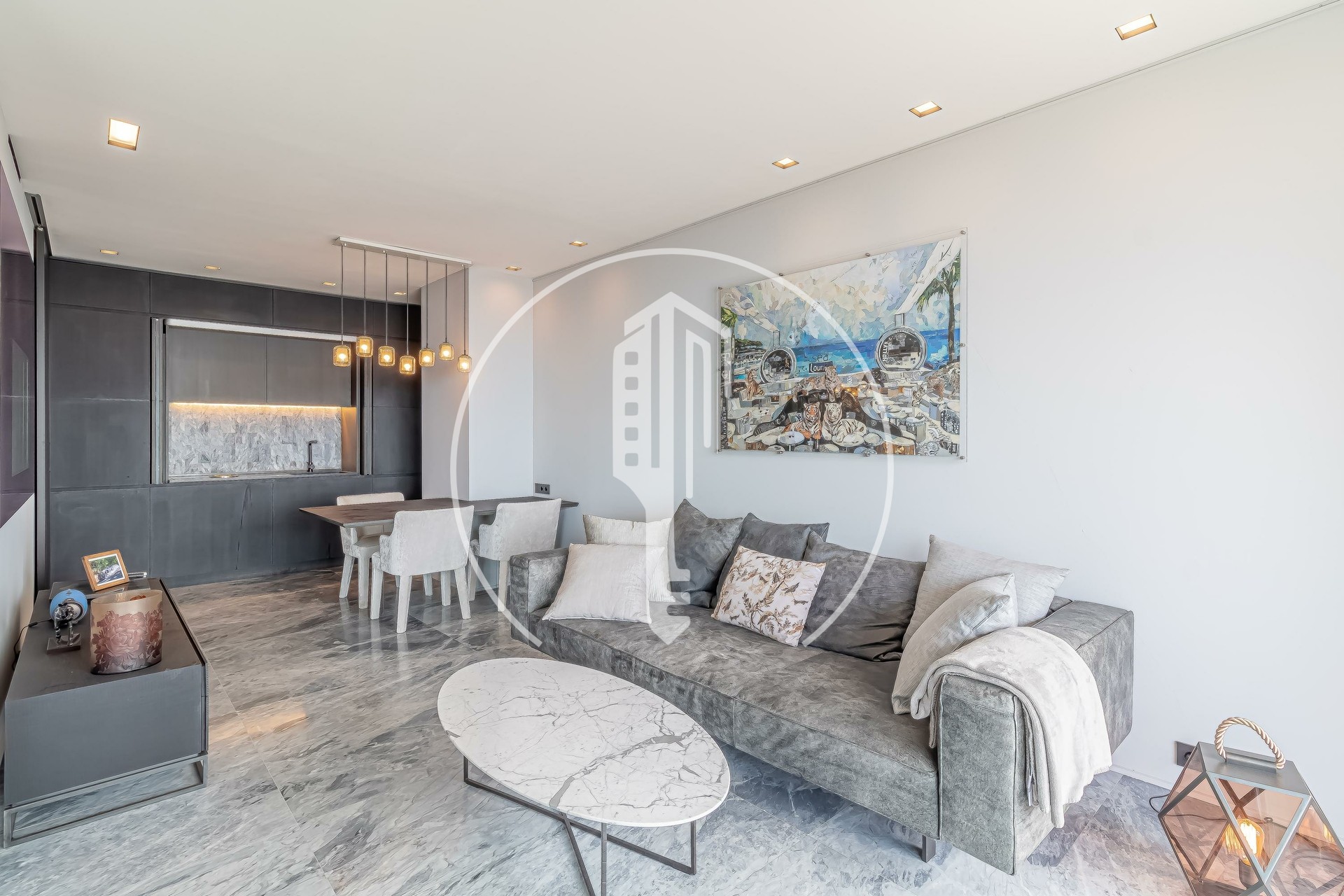 In the Château d'Azur building, this high-floor apartment has been fully renovated with high-quality materials. It offers a lovely view of the sea.