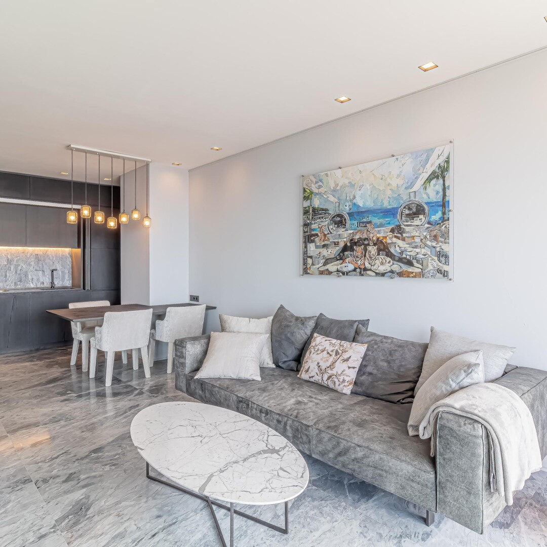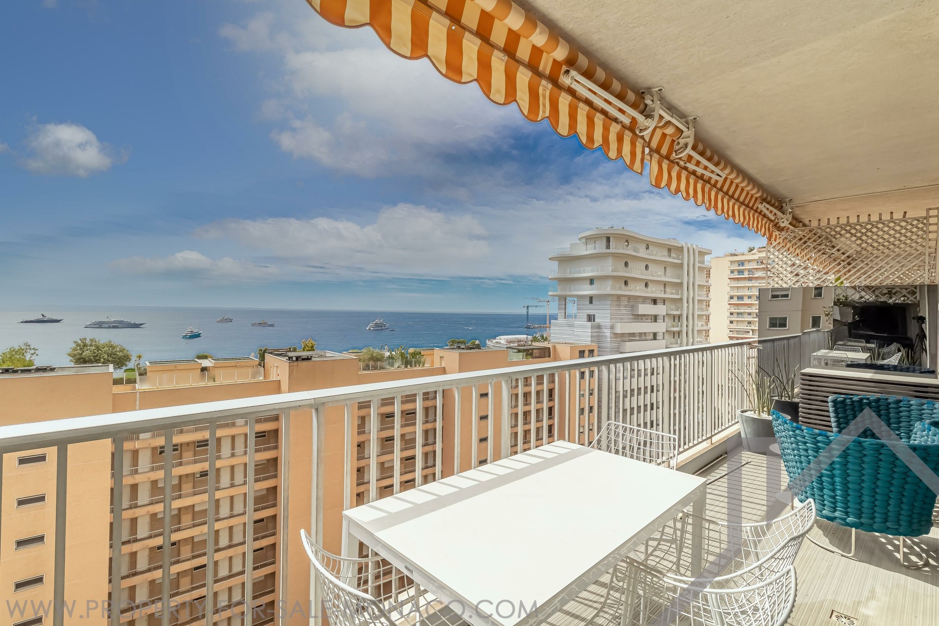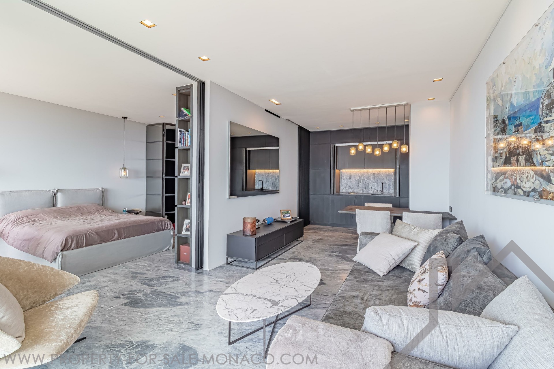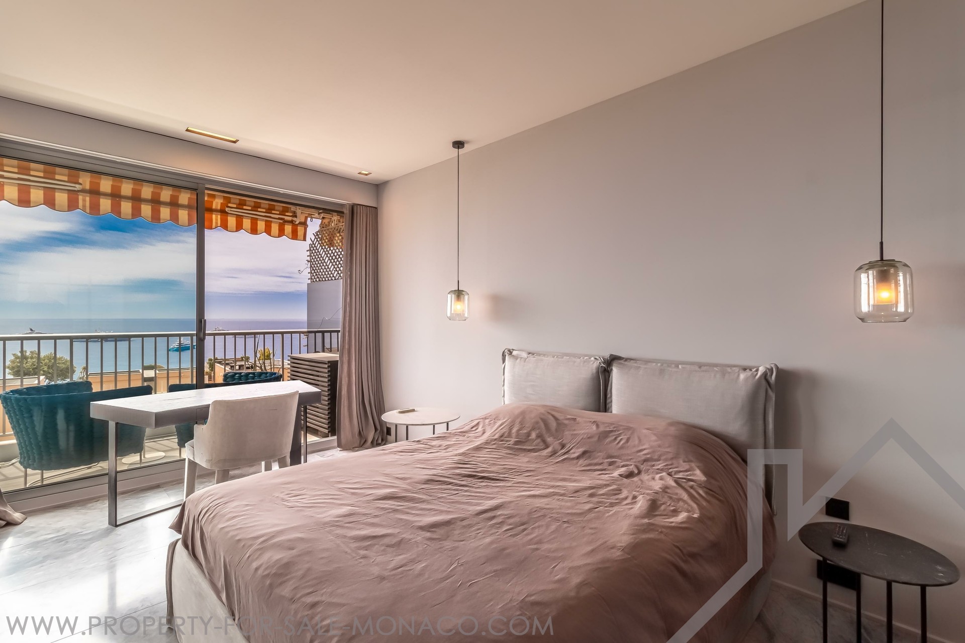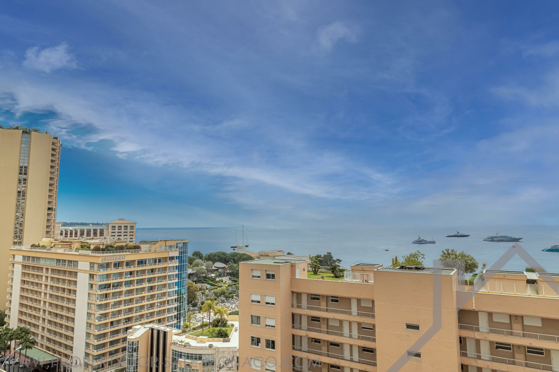 In the Château d'Azur building, this high-floor apartment has been fully renovated with high-quality materials. It offers a lovely view of the sea.