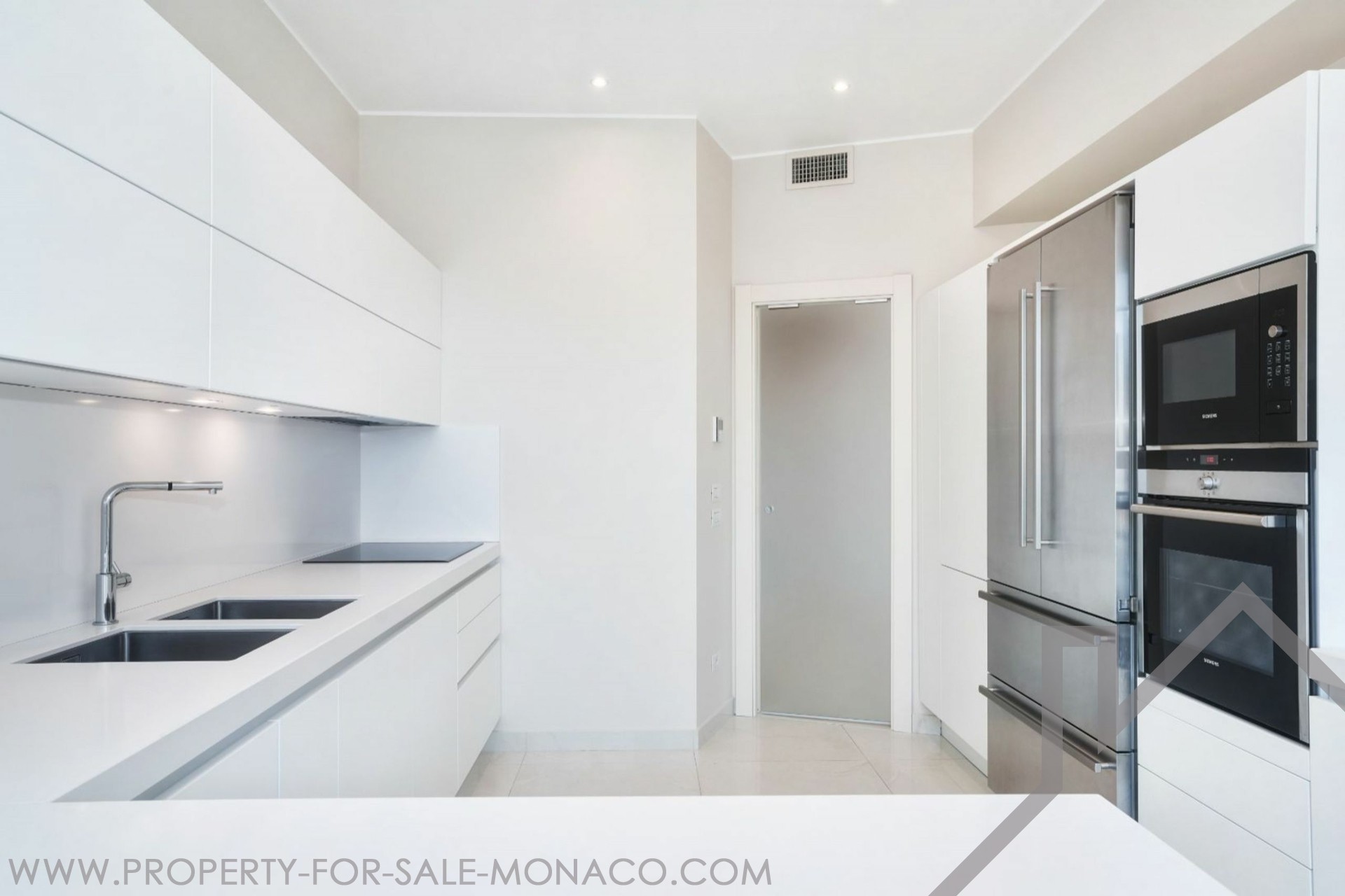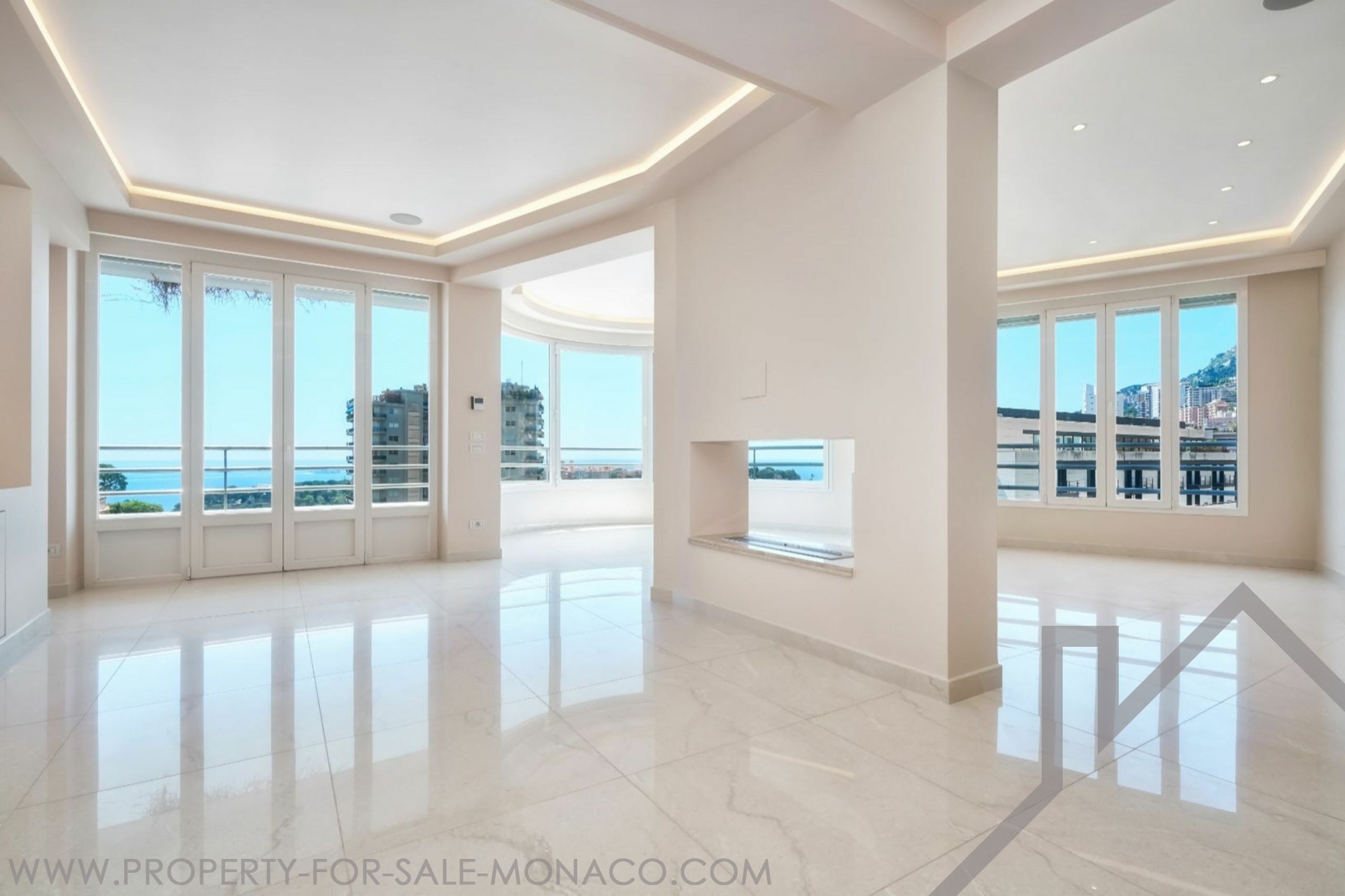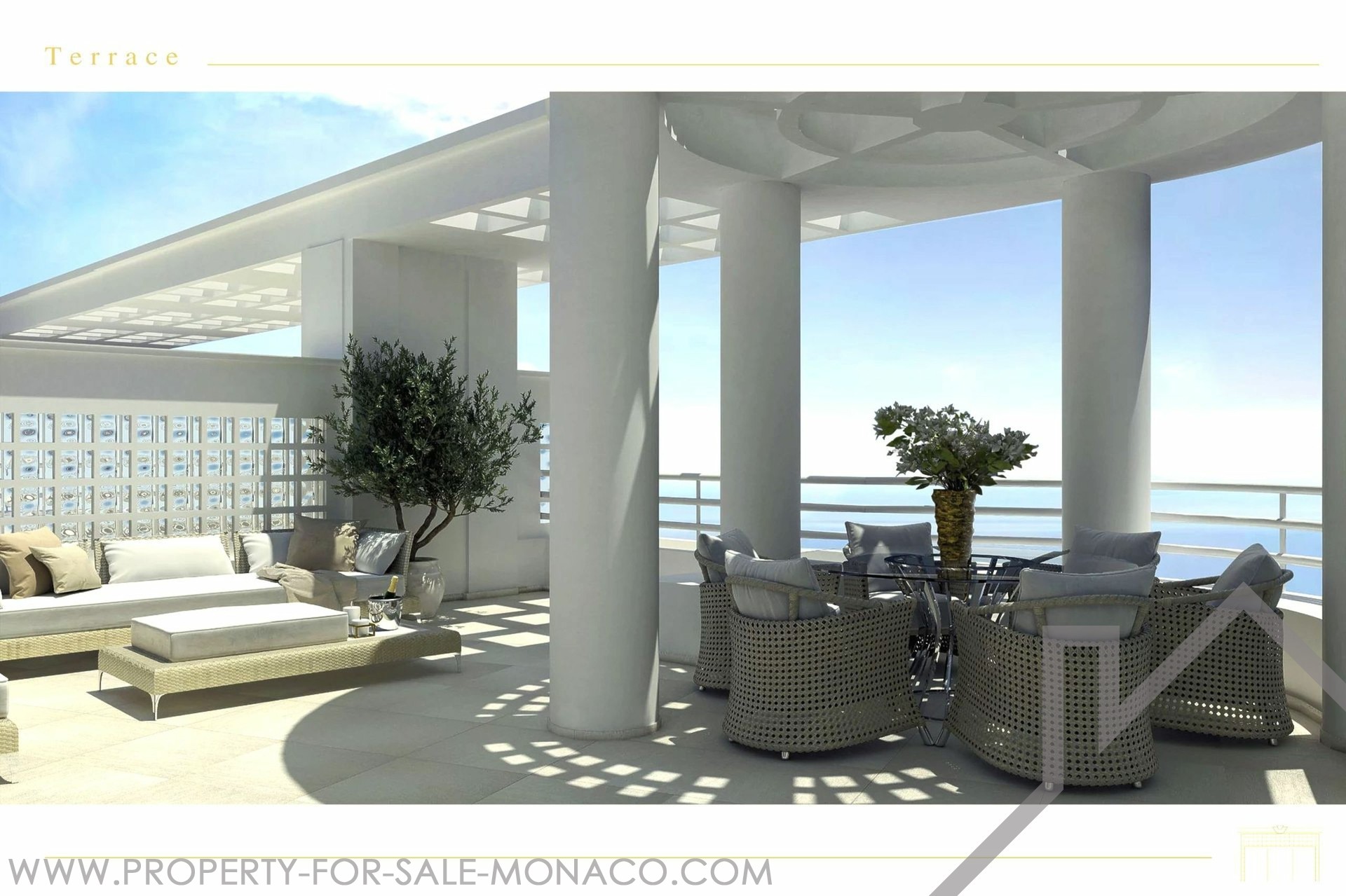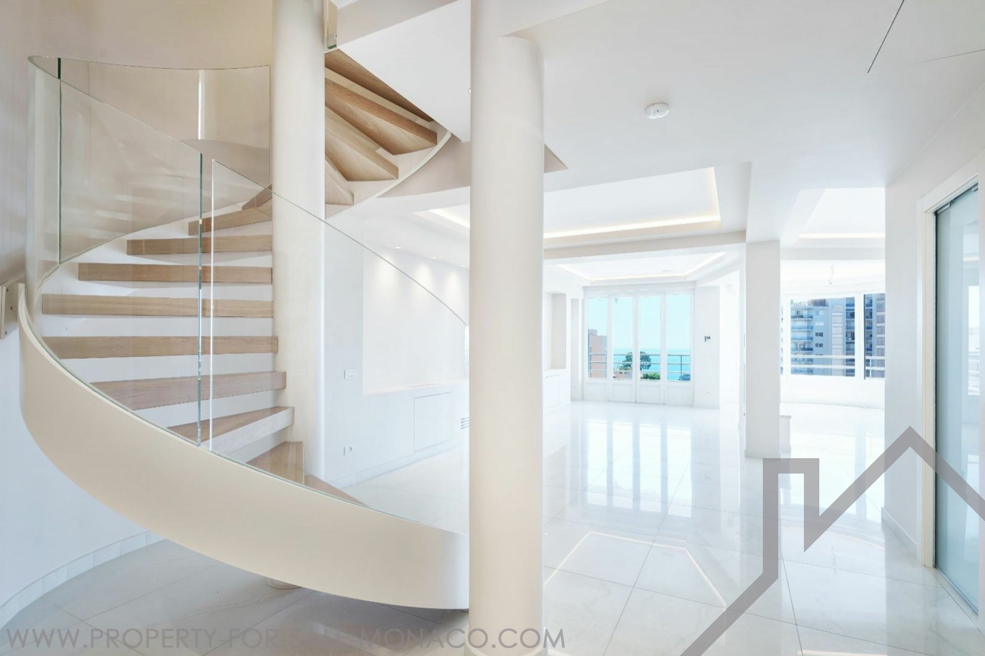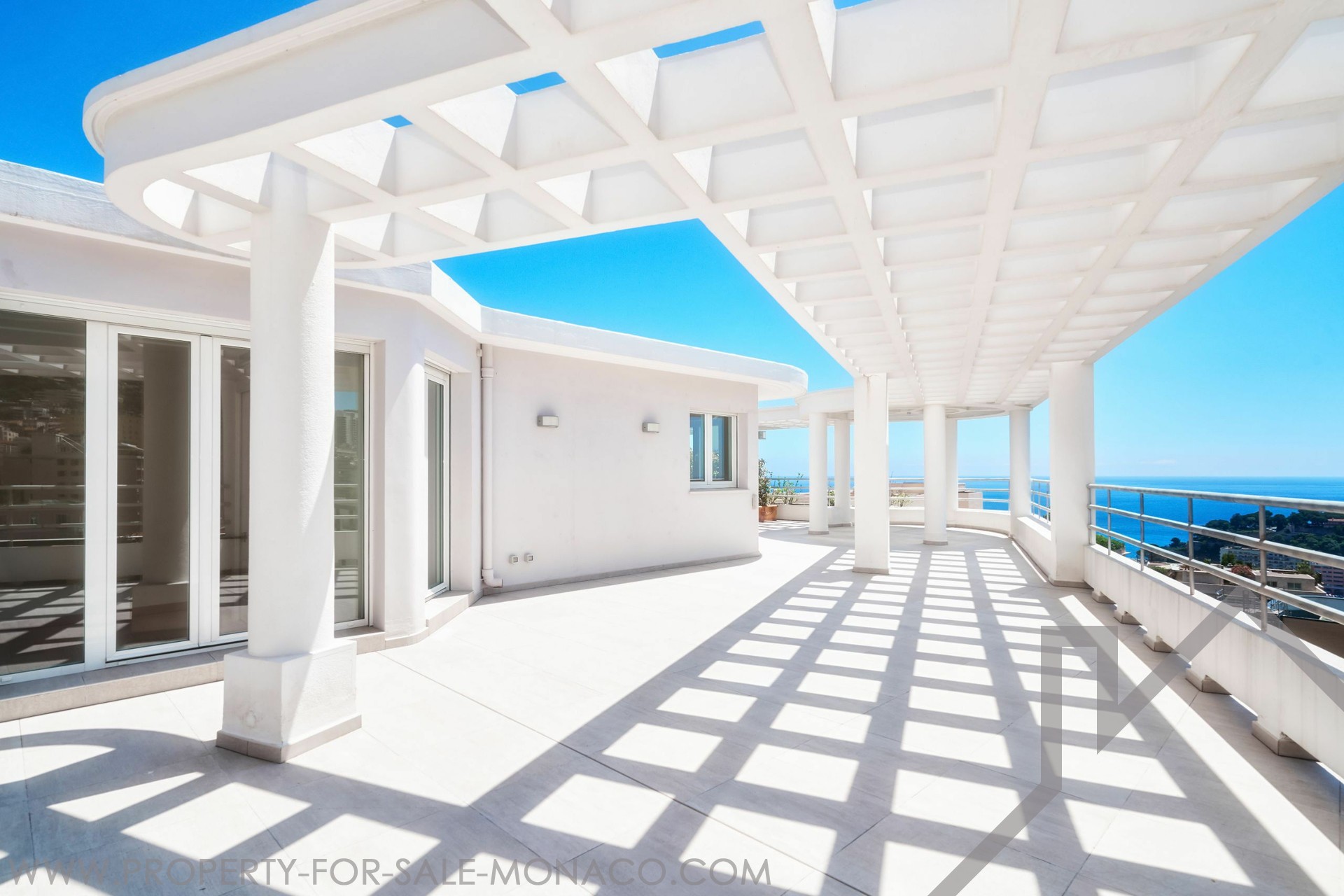 EXCLUSIVE Spacious Penthouse/Duplex with panoramic sea views and a large circular rooftop terrace: First level: entrance hall, guest toilet, double living/dining room, equipped kitchen, 2 bedrooms with en-suite bathrooms, 1 maid's room with shower, plenty of closets. 2 terraces. Upper level: 1 large bedroom, 1 bathroom with walk-in closet, an office. Garage for 3 cars, 1 cellar.