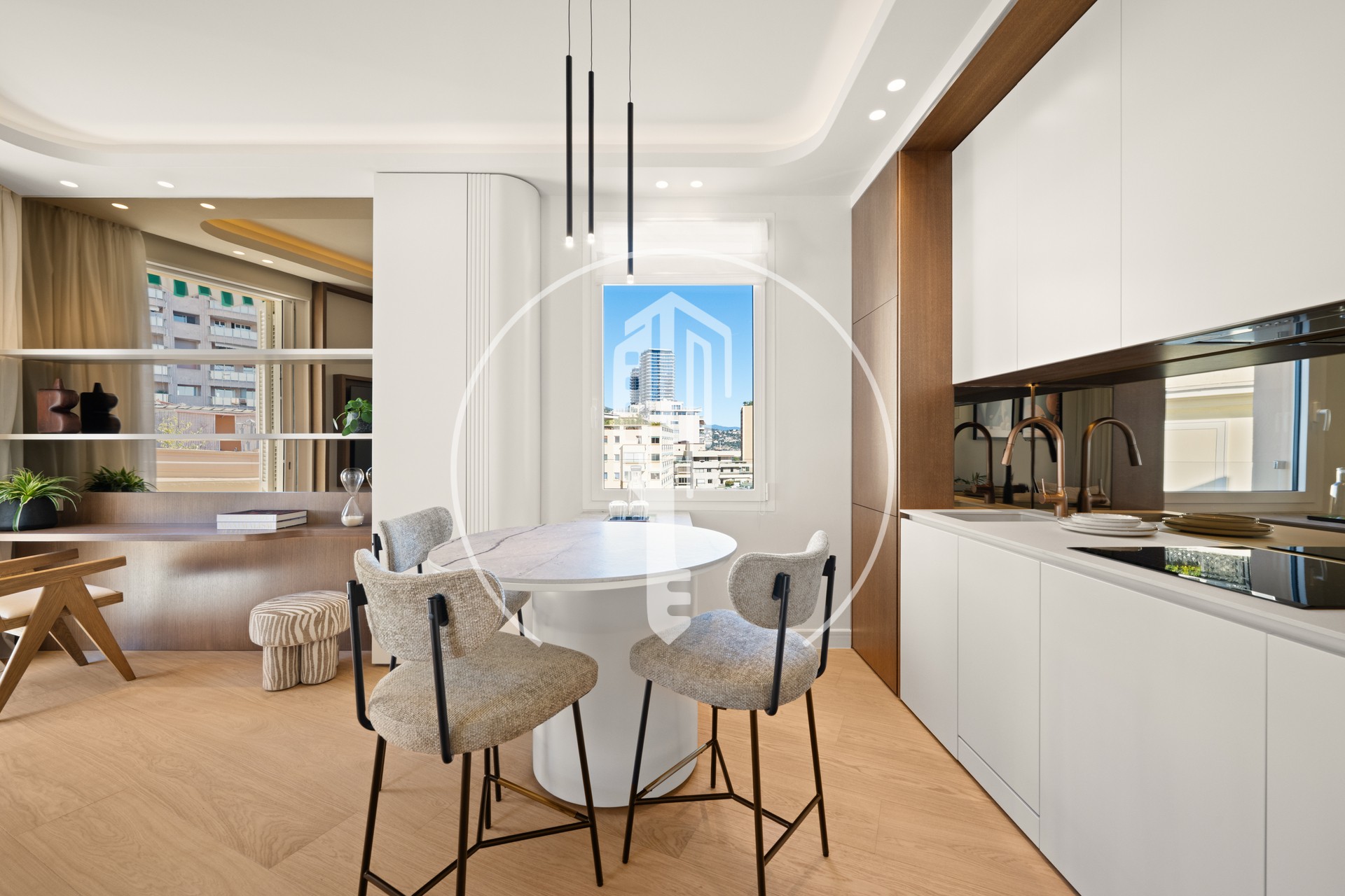 This stunning, fully renovated two-room apartment with a terrace and double east-west exposure, located in the La Radieuse building in the La Rousse Saint-Roman neighborhood, comprises: