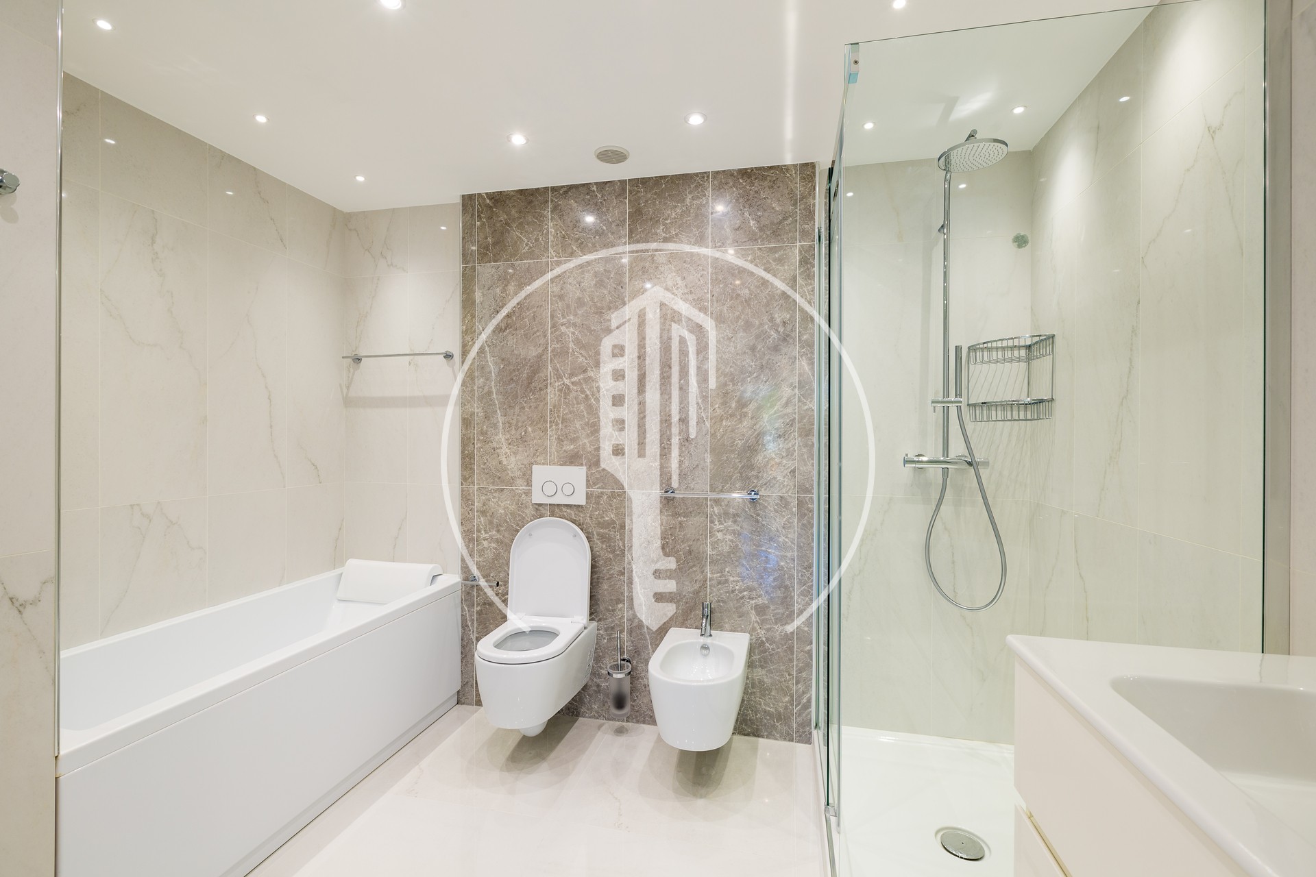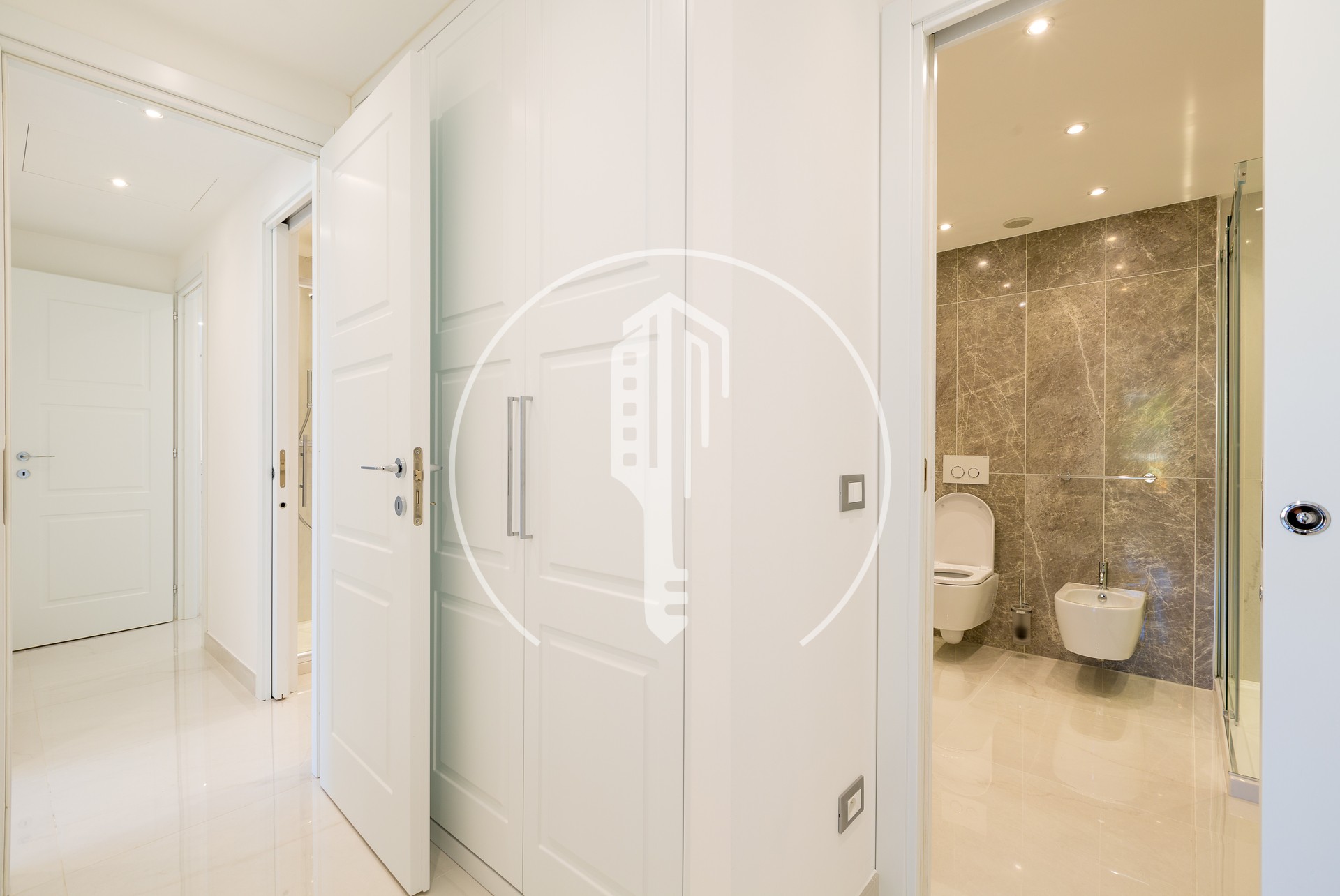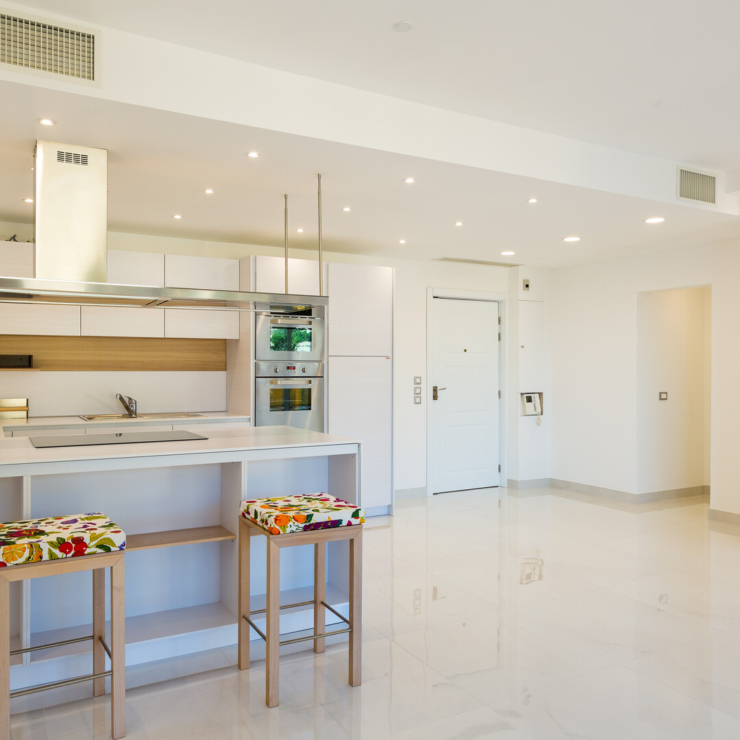 It comprises an entrance hall, a spacious living room with fully equipped open-plan kitchen, a master bedroom with dressing room and en-suite bathroom with WC, as well as a second bedroom with dressing room and separate shower room with WC.